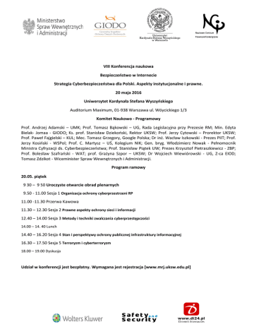 VIII Konferencja naukowa Bezpieczeństwo w Internecie Strategia Cyberbezpieczeństwa dla Polski. Aspekty instytucjonalne i prawne. 20 maja 2016 Uniwersytet Kardynała Stefana Wyszyńskiego Auditorium Maximum, 01-938 Warszawa ul. Wóycickiego 1/3 Komitet Naukowo - Programowy Prof. Andrzej Adamski – UMK; Prof. Tomasz Bąkowski – UG, Rada Legislacyjna przy Prezesie RM; Min. Edyta Bielak- Jomaa - GIODO; Ks. prof. Stanisław Dziekoński, Rektor UKSW; Prof. Jerzy Cytowski – Prorektor UKSW; Prof. Paweł Fajgielski – KUL; Mec. Tomasz Grzegory, Google Polska; Dr inż. Wacław Iszkowski - Prezes PIIT; Prof. Jerzy Kosiński - WSPol; Prof. C. Martysz – UŚ, Kolegium NIK; Gen. bryg. Włodzimierz Nowak - Pełnomocnik Ministra Cyfryzacji ds. Cyberbezpieczeństwa; Prof. Stanisław Piątek UW; Prezes Krzysztof Pietraszkiewicz - ZBP; Prof. Bolesław Szafrański - WAT; prof. Grażyna Szpor – UKSW; Dr Wojciech Wiewiórowski - UG, Z-ca EIOD; Tomasz Zdzikot - Wiceminister Spraw Wewnętrznych i Administracji. Program ramowy 20.05. piątek 9 30 – 9 50 Uroczyste otwarcie obrad plenarnych 9.50 - 11.00 Sesja 1 Organizacja ochrony cyberprzestrzeni RP 11.00 -11.30 Przerwa Kawowa 11.30 – 12.30 Sesja 2 Prawne aspekty ochrony sieci i informacji 12.40 – 14.00 Sesja 3 Metody i techniki zwalczania cyberprzestępczości 14.00 – 14. 40 Lunch 14.40 – 16.20 Sesja 4 Stan i perspektywy ochrony publicznej infrastruktury informacyjnej 16.30 – 17.50 Sesja 5 Terroryzm i cyberterroryzm 18.00 – 19.00 Dyskusja Udział w konferencji jest bezpłatny. Wymagana jest rejestracja [www.mrj.uksw.edu.pl] Program obrad plenarnych VIII Konferencji BwI 20.05.2016 Strategia Cyberbezpieczeństwa dla Polski. Aspekty instytucjonalne i prawne. Uroczyste otwarcie obrad: Rektor UKSW ks.prof. S. Dziekoński, Generalny Inspektor Ochrony Danych Osobowych dr E. Bielak- Jomaa, Wiceminister Spraw Wewnętrznych i Administracji Tomasz Zdzikot. Sesja 1 Organizacja ochrony cyberprzestrzeni RP 1. System cyberbezpieczeństwa Rzeczypospolitej Polskiej - Dyr. Piotr Januszewicz, MC 2. Bezpieczna administracja – Prof. Zbigniew Cieślak, UKSW 3. Cztery filary dopuszczalnej ingerencji w prawo do prywatności w ramach działań cyberobronnych” - Dr W. Wiewiórowski, UG, Zastępca Europejskiego Inspektora Ochrony Danych 4. Partnerstwo publiczno – prywatne na rzecz cyberbezpieczeństwa - Prezes ZBP K. Pietraszkiewicz 5. Czynniki poprawy bezpieczeństwa teleinformatycznego - Dr inż. W. Iszkowski, Prezes PIIT Sesja 2 Prawne aspekty ochrony sieci i informacji 6. Europejskie standardy ochrony sieci i informacji oraz ich implementacja do prawa polskiego - Prof. A. Adamski, UMK 7. Ochrona sieci i informacji w normach Prawa telekomunikacyjnego - Prof. B Fajgielski, KUL 8. Regulacja rozwoju Internetu rzeczy w prawie telekomunikacyjnym - Jacek Kowalski, Biuro BEREC, UKSW 9. Dostosowanie regulacji informatyzacji wykonywania zadań publicznych do nowych zagrożeń - Prof. C. Martysz, UŚ, NIK 10. Prawo a etos cyberprzestrzeni - Dr Karol Dobrzeniecki, UMK Sesja 3 Metody i techniki zwalczania cyberprzestępczości 11. Zwalczanie cyberprzestępczości a statystyczne zastosowania baz danych - Prof. B. Szafrański, WAT 12. Neutralność sieci a bezpieczeństwo - Dyr. P. Durbajło, UKE 13. Publiczne rejestry i zasoby danych a cyberprzestępczość - Dr inż. M. Kiedrowicz, WAT 14. Kradzież tożsamości a metody jej identyfikacji - Dr K. Czaplicki, UKSW 15. Struktura cyberprzestępczości - Dr inż. A. Gryszczyńska, UKSW 16. Próba oceny zwalczania cyberprzestępczości w Polsce – Prof. J. Kosiński, WSPol Sesja 4 Stan i perspektywy ochrony publicznej infrastruktury informacyjnej 17. Zarządzanie bezpieczeństwem informacji w urzędach - M. Szmit, dr inż. D. Lisiak-Felicka, UŁ 18. Przeciwdziałanie cyberatakom przez przedsiębiorstwa - Dr Jowita Sobczak SAN. 19. Dostęp do informacji publicznej a cyberbezpieczeństwo - dr Piotr Sitniewski, KSAP 20. Nowe trendy w ochronie cyberprzestrzeni - P. Trąbiński NCSS Sesja 5 Terroryzm i cyberterroryzm 21. Mapy zagrożenia terroryzmem - P. Niemczyk 22. Spójność karnoprawnej ochrony informacji istotnych dla bezpieczeństwa państwa – Dr M. Leciak, UMK 23. Profilowanie a cyberbezpieczeństwo - E. Niezgódka 24. Wystąpienia doktorantów i KN Forum Prawa Publicznego 25. Polski model regulacji jawności i jej ograniczeń a obronność i bezpieczeństwo państwa - Prof. G. Szpor, UKSW