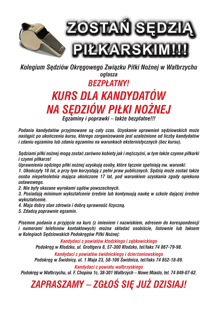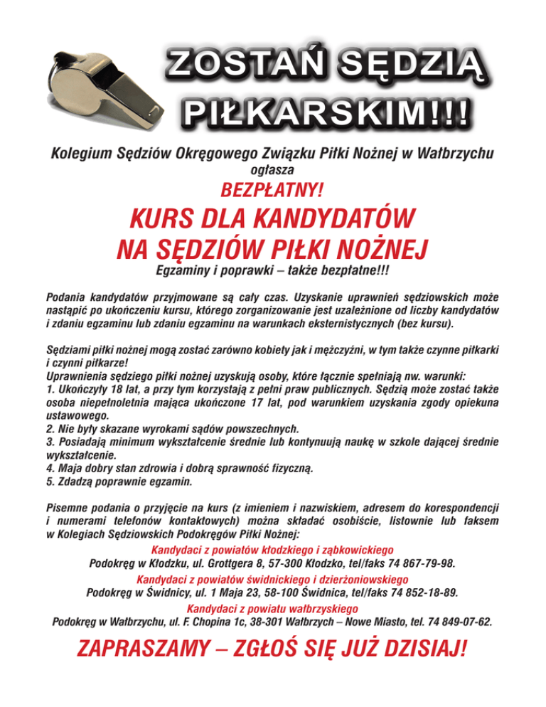 ZOSTAŃ SĘDZIĄ PIŁKARSKIM!!! Kolegium Sędziów Okręgowego Związku Piłki Nożnej w Wałbrzychu ogłasza BEZPŁATNY! KURS DLA KANDYDATÓW NA SĘDZIÓW PIŁKI NOŻNEJ Egzaminy i poprawki – także bezpłatne!!! Podania kandydatów przyjmowane są cały czas. Uzyskanie uprawnień sędziowskich może nastąpić po ukończeniu kursu, którego zorganizowanie jest uzależnione od liczby kandydatów i zdaniu egzaminu lub zdaniu egzaminu na warunkach eksternistycznych (bez kursu). Sędziami piłki nożnej mogą zostać zarówno kobiety jak i mężczyźni, w tym także czynne piłkarki i czynni piłkarze! Uprawnienia sędziego piłki nożnej uzyskują osoby, które łącznie spełniają nw. warunki: 1. Ukończyły 18 lat, a przy tym korzystają z pełni praw publicznych. Sędzią może zostać także osoba niepełnoletnia mająca ukończone 17 lat, pod warunkiem uzyskania zgody opiekuna ustawowego. 2. Nie były skazane wyrokami sądów powszechnych. 3. Posiadają minimum wykształcenie średnie lub kontynuują naukę w szkole dającej średnie wykształcenie. 4. Maja dobry stan zdrowia i dobrą sprawność fizyczną. 5. Zdadzą poprawnie egzamin. Pisemne podania o przyjęcie na kurs (z imieniem i nazwiskiem, adresem do korespondencji i numerami telefonów kontaktowych) można składać osobiście, listownie lub faksem w Kolegiach Sędziowskich Podokręgów Piłki Nożnej: Kandydaci z powiatów kłodzkiego i ząbkowickiego Podokręg w Kłodzku, ul. Grottgera 8, 57-300 Kłodzko, tel/faks 74 867-79-98. Kandydaci z powiatów świdnickiego i dzierżoniowskiego Podokręg w Świdnicy, ul. 1 Maja 23, 58-100 Świdnica, tel/faks 74 852-18-89. Kandydaci z powiatu wałbrzyskiego Podokręg w Wałbrzychu, ul. F. Chopina 1c, 38-301 Wałbrzych – Nowe Miasto, tel. 74 849-07-62. ZAPRASZAMY – ZGŁOŚ SIĘ JUŻ DZISIAJ!