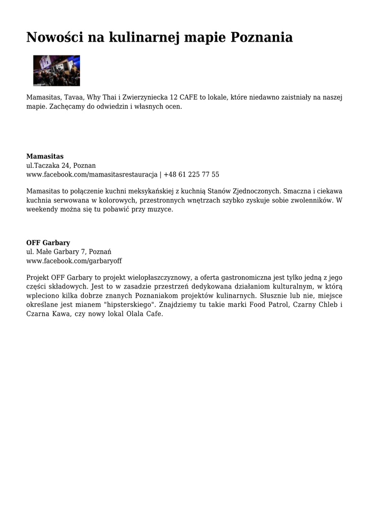 Nowości na kulinarnej mapie Poznania Mamasitas, Tavaa, Why Thai i Zwierzyniecka 12 CAFE to lokale, które niedawno zaistniały na naszej mapie. Zachęcamy do odwiedzin i własnych ocen. Mamasitas ul.Taczaka 24, Poznan www.facebook.com/mamasitasrestauracja | +48 61 225 77 55 Mamasitas to połączenie kuchni meksykańskiej z kuchnią Stanów Zjednoczonych. Smaczna i ciekawa kuchnia serwowana w kolorowych, przestronnych wnętrzach szybko zyskuje sobie zwolenników. W weekendy można się tu pobawić przy muzyce. OFF Garbary ul. Małe Garbary 7, Poznań www.facebook.com/garbaryoff Projekt OFF Garbary to projekt wielopłaszczyznowy, a oferta gastronomiczna jest tylko jedną z jego części składowych. Jest to w zasadzie przestrzeń dedykowana działaniom kulturalnym, w którą wpleciono kilka dobrze znanych Poznaniakom projektów kulinarnych. Słusznie lub nie, miejsce określane jest mianem "hipsterskiego". Znajdziemy tu takie marki Food Patrol, Czarny Chleb i Czarna Kawa, czy nowy lokal Olala Cafe. OFF Garbary- ul. Małe Garbary 7, Poznań Tavaa - Restauracja Indyjska ul. Ratajczaka 30, Poznan www.facebook.com/tavaapoznan | tel.: +48 61 22 46 962 Na ul. Ratajczaka, po sąsiedzku z "Ministerstwem Browaru", działa Tavaa. To restauracja indyjska, oferująca doskonała indyjska kuchnię. O smak i autentyczność dbają tu hinduscy właściciele i hinduscy szefowie kuchni. Why Thai Food and Wine ul. Kramarska 7, 61-765 Poznań www.facebook.com/whythaifoodwine | tel.: +48 61 818 29 11 Why Thai to restauracja serwująca dania kuchni tajskiej, przygotowywane w otwartej kuchni przez tajskich kucharzy. To druga po Warszawie lokalizacja wybrana dla tej marki. Na dwóch poziomach nowo wyremontowanego lokalu znajdziemy zarówno miejsce na romantyczną kolacje jak i biznesowy lunch. Zwierzyniecka 12 CAFE ul. Zwierzyniecka 12, Poznań www.facebook.pl/zwierzyniecka12 | tel.: +48 781 622 417 To nowa "śniadaniówka" serwująca ciepłe śniadania, słodkości i oczywiście dobrą kawę z ekspresu ciśnieniowego, bez której trudno sobie wyobrazić wczesny poranek. Lokal zlokalizowany jest na ul. Zwierzynieckiej, między rondem Kaponiera i ul. Mickiewicza. Zwierzyniecka 12 CAFE- ul. Zwierzyniecka 12 Zobacz także poprzednie wpisy publikowane w dziale: AKTUALNOŚCI GASTRONOMICZNE Tekst: www.poznan.travel | Foto: www.poznan.travel