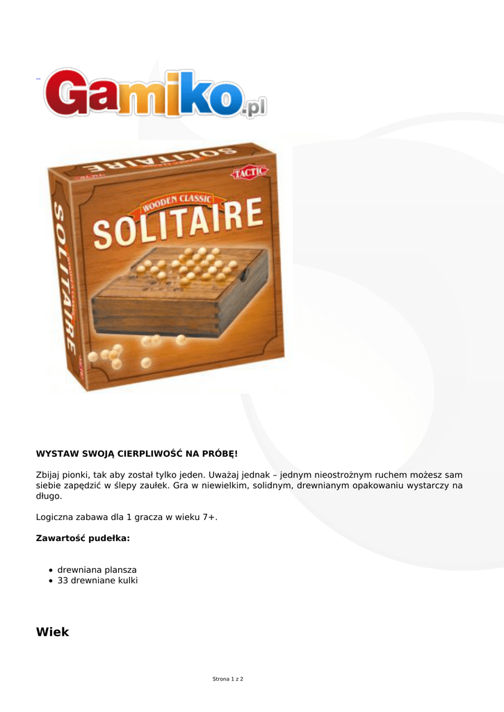 WYSTAW SWOJĄ CIERPLIWOŚĆ NA PRÓBĘ! Zbijaj pionki, tak aby został tylko jeden. Uważaj jednak – jednym nieostrożnym ruchem możesz sam siebie zapędzić w ślepy zaułek. Gra w niewielkim, solidnym, drewnianym opakowaniu wystarczy na długo. Logiczna zabawa dla 1 gracza w wieku 7+. Zawartość pudełka: drewniana plansza 33 drewniane kulki Wiek Strona 1 z 2 7+ Liczba graczy 1 Czas gry ok. 30 minut Instrukcja polska Wydanie polskie Producent Tactic Strona 2 z 2