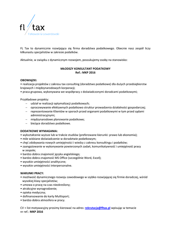 FL Tax to dynamicznie rozwijająca się firma doradztwa podatkowego. Obecnie nasz zespół liczy kilkunastu specjalistów w zakresie podatków. Aktualnie, w związku z dynamicznym rozwojem, poszukujemy osoby na stanowisko: MŁODSZY KONSULTANT PODATKOWY Ref.: MKP 2016 OBOWIĄZKI: • realizacja projektów z zakresu tax consulting (doradztwo podatkowe) dla dużych przedsiębiorstw krajowych i międzynarodowych korporacji; • praca grupowa, wykonywana we współpracy z doświadczonymi doradcami podatkowymi; Przykładowe projekty: udział w realizacji optymalizacji podatkowych; opracowywanie efektywnych podatkowo struktur prowadzenia działalności gospodarczej; reprezentowanie Klientów w sporach przed organami podatkowymi w tym przed sądami administracyjnymi; międzynarodowe planowanie podatkowe; bieżące doradztwo podatkowe. DODATKOWE WYMAGANIA: • wykształcenie wyższe lub w trakcie studiów (preferowane kierunki: prawo lub ekonomia); • mile widziane doświadczenie w doradztwie podatkowym; • chęć zdobywania nowych umiejętności i wiedzy z zakresu konsultingu i podatków; • zaangażowanie w wykonywanie powierzonych zadań, komunikatywność i umiejętność pracy w zespole; • bardzo dobra znajomość języka angielskiego; • bardzo dobra znajomość MS Office (szczególnie Word, Excel); • wysokie umiejętności analityczne; • wysokie umiejętności interpersonalne. WARUNKI PRACY: • możliwość dynamicznego rozwoju zawodowego w szybko rozwijającej się firmie doradczej, wśród wysokiej klasy specjalistów; • umowa o pracę na czas nieokreślony; • atrakcyjne wynagrodzenie; • opieka medyczna; • dofinansowanie do karty Multisport; • bardzo dobra atmosfera w pracy. CV + list motywacyjny prosimy kierować na adres: [email protected] wpisując w temacie nr ref.: MKP 2016
