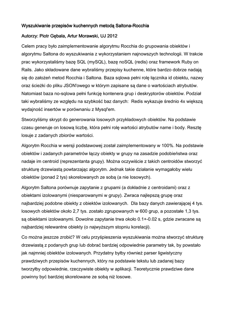 Wyszukiwanie przepisów kuchennych metodą SaltonaSaltona-Rocchia Autorzy: utorzy: Piotr Gębala, Gębala, Artur Morawski, Morawski, UJ 2012 Celem pracy było zaimplementowanie algorytmu Rocchia do grupowania obiektów i algorytmu Saltona do wyszukiwania z wykorzystaniem najnowszych technologii. W trakcie prac wykorzystaliśmy bazę SQL (mySQL), bazę noSQL (redis) oraz framework Ruby on Rails. Jako składowane dane wybraliśmy przepisy kuchenne, które bardzo dobrze nadają się do założeń metod Rocchia i Saltona. Baza sqlowa pełni rolę łącznika id obiektu, nazwy oraz ścieżki do pliku JSON'owego w którym zapisane są dane o wartościach atrybutów. Natomiast baza no-sqlowa pełni funkcję kontenera grup i deskryptorów obiektów. Podział taki wybraliśmy ze względu na szybkość baz danych: Redis wykazuje średnio 4x większą wydajność insertów w porównaniu z Mysql'em. Stworzyliśmy skrypt do generowania losowych przykładowych obiektów. Na podstawie czasu generuje on losową liczbę, która pełni rolę wartości atrybutów name i body. Resztę losuje z zadanych zbiorów wartości. Algorytm Rocchia w wersji podstawowej został zaimplementowany w 100%. Na podstawie obiektów i zadanych parametrów łączy obiekty w grupy na zasadzie podobieństwa oraz nadaje im centroid (reprezentanta grupy). Można oczywiście z takich centroidów stworzyć strukturę drzewiastą powtarzając algorytm. Jednak takie działanie wymagałoby wielu obiektów (ponad 2 tys) skorelowanych ze sobą (a nie losowych). Algorytm Saltona porównuje zapytanie z grupami (a dokładnie z centroidami) oraz z obiektami izolowanymi (niesparowanymi w grupy). Zwraca najlepszą grupę oraz najbardziej podobne obiekty z obiektów izolowanych. Dla bazy danych zawierającej 4 tys. losowych obiektów około 2,7 tys. zostało zgrupowanych w 600 grup, a pozostałe 1,3 tys. są obiektami izolowanymi. Dowolne zapytanie trwa około 0.1+-0.02 s, gdzie zwracane są najbardziej relewantne obiekty (o najwyższym stopniu korelacji). Co można jeszcze zrobić? W celu przyśpieszenia wyszukiwania można stworzyć strukturę drzewiastą z podanych grup lub dobrać bardziej odpowiednie parametry tak, by powstało jak najmniej obiektów izolowanych. Przydatny byłby również parser ligwistyczny prawdziwych przepisów kuchennych, który na podstawie tekstu lub zadanej bazy tworzyłby odpowiednie, rzeczywiste obiekty w aplikacji. Teoretycznie prawdziwe dane powinny być bardziej skorelowane ze sobą niż losowe.