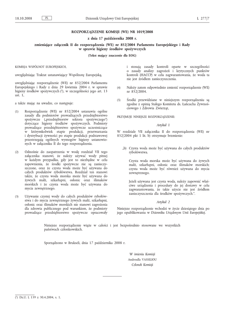 18.10.2008 PL Dziennik Urzędowy Unii Europejskiej L 277/7 ROZPORZĄDZENIE KOMISJI (WE) NR 1019/2008 z dnia 17 października 2008 r. zmieniające załącznik II do rozporządzenia (WE) nr 852/2004 Parlamentu Europejskiego i Rady w sprawie higieny środków spożywczych (Tekst mający znaczenie dla EOG) i stosują zasady kontroli oparte w szczególności o zasady analizy zagrożeń i krytycznych punktów kontroli (HACCP) w celu zagwarantowania, że woda ta nie jest źródłem zanieczyszczenia. KOMISJA WSPÓLNOT EUROPEJSKICH, uwzględniając Traktat ustanawiający Wspólnotę Europejską, uwzględniając rozporządzenie (WE) nr 852/2004 Parlamentu Europejskiego i Rady z dnia 29 kwietnia 2004 r. w sprawie higieny środków spożywczych (1), w szczególności jego art. 13 ust. 1, a także mając na uwadze, co następuje: (1) (2) (3) Rozporządzenie (WE) nr 852/2004 ustanawia ogólne zasady dla podmiotów prowadzących przedsiębiorstwo spożywcze („przedsiębiorstw sektora spożywczego”) dotyczące higieny środków spożywczych. Podmioty prowadzące przedsiębiorstwo spożywcze uczestniczące w którymkolwiek etapie produkcji, przetwarzania i dystrybucji żywności po etapie produkcji podstawowej przestrzegają ogólnych wymogów higieny ustanowio nych w załączniku II do tego rozporządzenia. Odnośnie do zaopatrzenia w wodę rozdział VII tego załącznika stanowi, że należy używać wody pitnej w każdym przypadku, gdy jest to niezbędne w celu zapewnienia, że środki spożywcze nie są zanieczy szczone, oraz że czysta woda może być używana do całych produktów rybołówstwa. Rozdział ten stanowi także, że czysta woda morska może być używana do żywych małż, szkarłupni, osłonic oraz ślimaków morskich i że czysta woda może być używana do mycia zewnętrznego. Używanie czystej wody do całych produktów rybołów stwa i do mycia zewnętrznego żywych małż, szkarłupni, osłonic oraz ślimaków morskich nie stanowi zagrożenia dla zdrowia publicznego pod warunkiem, że podmioty prowadzące przedsiębiorstwo spożywcze opracowały (4) Należy zatem odpowiednio zmienić rozporządzenie (WE) nr 852/2004. (5) Środki przewidziane w niniejszym rozporządzeniu są zgodne z opinią Stałego Komitetu ds. Łańcucha Żywnoś ciowego i Zdrowia Zwierząt, PRZYJMUJE NINIEJSZE ROZPORZĄDZENIE: Artykuł 1 W rozdziale VII załącznika II do rozporządzenia (WE) nr 852/2004 pkt 1 lit. b) otrzymuje brzmienie: „b) Czysta woda może być używana do całych produktów rybołówstwa. Czysta woda morska może być używana do żywych małż, szkarłupni, osłonic oraz ślimaków morskich; czysta woda może być również używana do mycia zewnętrznego. Jeżeli używana jest czysta woda, należy zapewnić właś ciwe urządzenia i procedury do jej dostawy w celu zagwarantowania, że takie użycie nie jest źródłem zanieczyszczenia dla środków spożywczych.”. Artykuł 2 Niniejsze rozporządzenie wchodzi w życie dziesiątego dnia po jego opublikowaniu w Dzienniku Urzędowym Unii Europejskiej. Niniejsze rozporządzenie wiąże w całości i jest bezpośrednio stosowane we wszystkich państwach członkowskich. Sporządzono w Brukseli, dnia 17 października 2008 r. W imieniu Komisji Androulla VASSILIOU Członek Komisji (1) Dz.U. L 139 z 30.4.2004, s. 1.