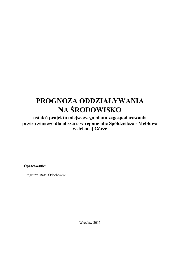 PROGNOZA ODDZIAŁYWANIA NA ŚRODOWISKO ustaleń projektu miejscowego planu zagospodarowania przestrzennego dla obszaru w rejonie ulic Spółdzielcza - Meblowa w Jeleniej Górze Opracowanie: mgr inż. Rafał Odachowski Wrocław 2015 Spis treści 1. Wprowadzenie..................................................................................................................... 3 1.1. Podstawa prawna, cel i zakres opracowania ................................................................... 3 1.2. Wykorzystane materiały i metody pracy......................................................................... 3 1.3. Informacje o zawartości, głównych celach projektu MPZP ........................................... 4 2. Ocena stanu i funkcjonowania środowiska oraz tendencje zmian przy braku realizacji MPZP......................................................................................................................... 5 2.1 Charakterystyka środowiska przyrodniczego................................................................ 5 2.2. Stan środowiska i występujące zagrożenia ................................................................... 7 2.3. Tendencje przeobrażeń przy braku realizacji MPZP .................................................. 11 3. Analiza ustaleń planu i ocena zgodności z uwarunkowaniami ekofizjograficznymi........ 11 4. Przewidywany wpływ realizacji ustaleń projektu MPZP na środowisko ......................... 12 4.1. Analiza wpływu ustaleń planu na środowisko ............................................................ 12 4.2. Oddziaływanie miejscowego planu zagospodarowania przestrzennego poza obszarem opracowania ................................................................................................ 14 4.3. Informacje o możliwym transgranicznym oddziaływaniu na środowisko.................. 15 4.4. Oddziaływanie na formy ochrony przyrody................................................................ 15 4.5. Kompleksowa ocena skutków wpływu ustaleń MPZP na środowisko przyrodnicze . 15 5. Metody analizy realizacji postanowień projektu planu..................................................... 16 6. Przedstawienie rozwiązań mających na celu zapobieganie, ograniczenie lub kompensację przyrodniczą negatywnych oddziaływań na środowisko .................................. 17 7. Przedstawienie rozwiązań alternatywnych do rozwiązań zawartych w projekcie MPZP 17 8. Informacje o celach ochrony środowiska i powiązania z innymi dokumentami .............. 17 9. Streszczenie....................................................................................................................... 20 2 1. Wprowadzenie 1.1. Podstawa prawna, cel i zakres opracowania Obowiązek sporządzenia prognozy oddziaływania na środowisko ustaleń projektu miejscowego planu zagospodarowania przestrzennego wynika z art. 46 ustawy z dnia 3 października 2008 r. o udostępnianiu informacji o środowisku i jego ochronie, udziale społeczeństwa w ochronie środowiska oraz o ocenach oddziaływania na środowisko, która jednocześnie ustala zakres merytoryczny opracowania. Zgodnie z art. 17 pkt 4 ustawy z dnia 27 marca 2003 roku o planowaniu i zagospodarowaniu przestrzennym prognozę oddziaływania na środowisko sporządza organ opracowujący projekt miejscowego planu zagospodarowania przestrzennego (MPZP). Prognoza obejmuje obszar objęty projektem MPZP, wraz z obszarami pozostającymi w zasięgu oddziaływania wynikającego z realizacji ustaleń planu. Sporządzenie planu zostało zainicjowane uchwałą 65.IX.2015 z dnia 21 kwietnia 2015 r. w sprawie przystąpienia do sporządzenia miejscowego planu zagospodarowania przestrzennego w rejonie ulic Spółdzielcza - Meblowa w Jeleniej Górze. Celem sporządzenia prognozy jest ocena skutków (zarówno negatywnych, jak i pozytywnych), jakie mogą wynikać z projektowanego przeznaczenia terenu oraz realizacji ustaleń projektu planu na środowisko, a w szczególności na różnorodność biologiczną, ludzi, zwierzęta, rośliny, wodę, powietrze, powierzchnię ziemi, krajobraz, klimat, zasoby naturalne oraz zabytki, z uwzględnieniem wzajemnych powiązań między tymi elementami. W opracowaniu przedstawiono analizę stanu i funkcjonowania środowiska, jego zasobów i innych uwarunkowań przyrodniczych. Prognoza ocenia rozwiązania funkcjonalnoprzestrzenne i inne ustalenia zawarte w projekcie miejscowego planu zagospodarowania przestrzennego pod kątem zgodności z uwarunkowaniami ekofizjograficznymi i zgodności z przepisami prawa dotyczącymi ochrony środowiska. Prognoza identyfikuje przewidywane zagrożenia dla środowiska, które mogą powstać na terenach znajdujących się w zasięgu oddziaływania wynikającego z realizacji ustaleń MPZP. 1.2. Wykorzystane materiały i metody pracy W trakcie przygotowania niniejszego opracowania rozpoznano walory i zasoby przyrodnicze, stan zagospodarowania, walory krajobrazowe, stan środowiska i istniejące zagrożenia oraz uciążliwości dla środowiska i zdrowia człowieka. Przeanalizowano wzajemne powiązania między elementami środowiska, odporność poszczególnych elementów środowiska na degradację oraz dokonano kompleksowej oceny terenu. Wykorzystano opracowania poruszające problematykę ochrony środowiska miasta Jelenia Góra, materiały kartograficzne, a także przeprowadzono wizję terenu. Zastosowana w prognozie metoda polega na porównaniu aktualnego funkcjonowania obszaru z funkcjonowaniem przewidywanym jako skutek realizacji ustaleń planu. Realizacja ustaleń zawartych w projekcie miejscowego planu zagospodarowania przestrzennego spowoduje zróżnicowane zmiany w środowisku. Ich charakter, intensywność oraz zasięg uzależniony będzie od faktycznego sposobu zagospodarowania terenu oraz stopnia realizacji zapisów zawartych w projekcie planu miejscowego. Ocenę następstw realizacji ustaleń planu dokonano z podziałem ze względu na