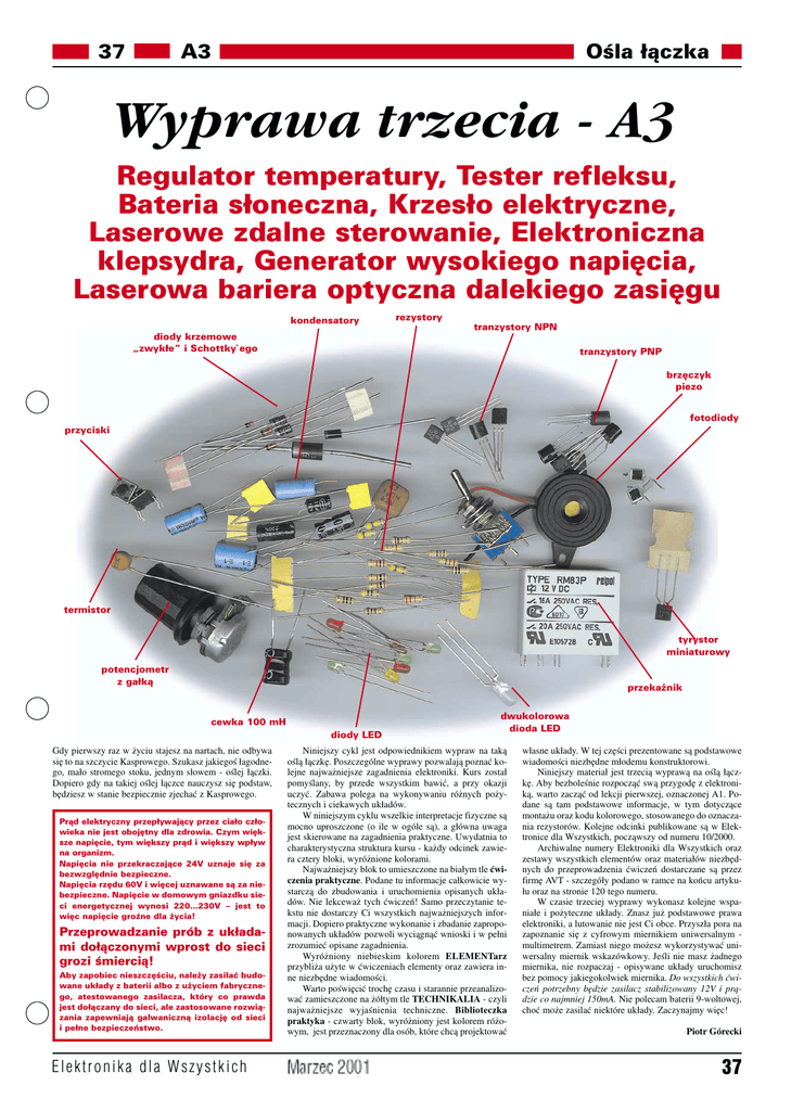 37 A3 Ośla łączka Wyprawa trzecia − A3 Regulator temperatury, Tester refleksu, Bateria słoneczna, Krzesło elektryczne, Laserowe zdalne sterowanie, Elektroniczna klepsydra, Generator wysokiego napięcia, Laserowa bariera optyczna dalekiego zasięgu kondensatory rezystory tranzystory NPN diody krzemowe „zwykłe“ i Schottky`ego tranzystory PNP brzęczyk piezo fotodiody przyciski termistor tyrystor miniaturowy potencjometr z gałką przekażnik cewka 100 mH diody LED Gdy pierwszy raz w życiu stajesz na nartach, nie odbywa się to na szczycie Kasprowego. Szukasz jakiegoś łagodne− go, mało stromego stoku, jednym słowem − oślej łączki. Dopiero gdy na takiej oślej łączce nauczysz się podstaw, będziesz w stanie bezpiecznie zjechać z Kasprowego. Prąd elektryczny przepływający przez ciało czło− wieka nie jest obojętny dla zdrowia. Czym więk− sze napięcie, tym większy prąd i większy wpływ na organizm. Napięcia nie przekraczające 24V uznaje się za bezwzględnie bezpieczne. Napięcia rzędu 60V i więcej uznawane są za nie− bezpieczne. Napięcie w domowym gniazdku sie− ci energetycznej wynosi 220...230V – jest to więc napięcie groźne dla życia! Przeprowadzanie prób z układa− mi dołączonymi wprost do sieci grozi śmiercią! Aby zapobiec nieszczęściu, należy zasilać budo− wane układy z baterii albo z użyciem fabryczne− go, atestowanego zasilacza, który co prawda jest dołączany do sieci, ale zastosowane rozwią− zania zapewniają galwaniczną izolację od sieci i pełne bezpieczeństwo. Elektronika dla Wszystkich dwukolorowa dioda LED Niniejszy cykl jest odpowiednikiem wypraw na taką oślą łączkę. Poszczególne wyprawy pozwalają poznać ko− lejne najważniejsze zagadnienia elektroniki. Kurs został pomyślany, by przede wszystkim bawić, a przy okazji uczyć. Zabawa polega na wykonywaniu różnych poży− tecznych i ciekawych układów. W niniejszym cyklu wszelkie interpretacje fizyczne są mocno uproszczone (o ile w ogóle są), a główna uwaga jest skierowane na zagadnienia praktyczne. Uwydatnia to charakterystyczna struktura kursu − każdy odcinek zawie− ra cztery bloki, wyróżnione kolorami. Najważniejszy blok to umieszczone na białym tle ćwi− czenia praktyczne. Podane tu informacje całkowicie wy− starczą do zbudowania i uruchomienia opisanych ukła− dów. Nie lekceważ tych ćwiczeń! Samo przeczytanie te− kstu nie dostarczy Ci wszystkich najważniejszych infor− macji. Dopiero praktyczne wykonanie i zbadanie zapropo− nowanych układów pozwoli wyciągnąć wnioski i w pełni zrozumieć opisane zagadnienia. Wyróżniony niebieskim kolorem ELEMENTarz przybliża użyte w ćwiczeniach elementy oraz zawiera in− ne niezbędne wiadomości. Warto poświęcić trochę czasu i starannie przeanalizo− wać zamieszczone na żółtym tle TECHNIKALIA − czyli najważniejsze wyjaśnienia techniczne. Biblioteczka praktyka − czwarty blok, wyróżniony jest kolorem różo− wym, jest przeznaczony dla osób, które chcą projektować własne układy. W tej części prezentowane są podstawowe wiadomości niezbędne młodemu konstruktorowi. Niniejszy materiał jest trzecią wyprawą na oślą łącz− kę. Aby bezboleśnie rozpocząć swą przygodę z elektroni− ką, warto zacząć od lekcji pierwszej, oznaczonej A1. Po− dane są tam podstawowe informacje, w tym dotyczące montażu oraz kodu kolorowego, stosowanego do oznacza− nia rezystorów. Kolejne odcinki publikowane są w Elek− tronice dla Wszystkich, począwszy od numeru 10/2000. Archiwalne numery Elektroniki dla Wszystkich oraz zestawy wszystkich elementów oraz materiałów niezbęd− nych do przeprowadzenia ćwiczeń dostarczane są przez firmę AVT − szczegóły podano w ramce na końcu artyku− łu oraz na stronie 120 tego numeru. W czasie trzeciej wyprawy wykonasz kolejne wspa− niałe i pożyteczne układy. Znasz już podstawowe prawa elektroniki, a lutowanie nie jest Ci obce. Przyszła pora na zapoznanie się z cyfrowym miernikiem uniwersalnym − multimetrem. Zamiast niego możesz wykorzystywać uni− wersalny miernik wskazówkowy. Jeśli nie masz żadnego miernika, nie rozpaczaj − opisywane układy uruchomisz bez pomocy jakiegokolwiek miernika. Do wszystkich ćwi− czeń potrzebny będzie zasilacz stabilizowany 12V i prą− dzie co najmniej 150mA. Nie polecam baterii 9−woltowej, choć może zasilać niektóre układy. Zaczynajmy więc! Piotr Górecki 37 A3 ELEMENTarz ELEMENTarz ELEMENTarz ELEMENTarz ELEMENTarz ELEMENTarz ELEMENTarz Potencjometr, rezystor zmienny T E C H N I K A L I A Ośla łączka Tajemnice dzielników napięcia Mówiąc najprościej, po− tencjometr to zmienny re− zystor. Wystarczy naryso− wać miękkim ołówkiem na kartce grubą kreskę. Cien− ka warstwa grafitu (odmia− na węgla) przewodzi prąd. Przesuwając sondy mierni− ka wzdłuż węglowej ścieżki można zmieniać rezystancję. Dokładnie tak działają potencjo− metry węglowe (w których ścieżka przewo− dząca jest zbudowana z grafitu). Dawniej kilka potencjometrów (węglo− wych) można było znaleźć w każdym radio− odbiorniku i telewizorze, gdzie służyły mie− dzy innymi do regulacji siły głosu. Dziś jest ich tam coraz mniej, bo są wypierane przez elektroniczne systemy regulacji. Nadal czę− sto stosowane są jedynie niewielkie poten− cjometry montażowe, wykorzystywane w procesie regulacji wstępnej, niedostępne dla użytkownika. Obok popularnych i tanich potencjometrów węglowych, stosowane są także zdecydowanie lepsze potencjometry cermetowe (cermet – ceramika + metal). Czasem spotyka się też potencjometry druto− we, a bardzo rzadko takie, gdzie warstwa czynna wykonana jest ze specjalnego, prze− wodzącego tworzywa sztucznego. Potencjometry montażowe nazywane są często peerkami. Ta zwyczajowa nazwa po− chodzi stąd, że na schematach oznacza się je często literami PR. Precyzyj
