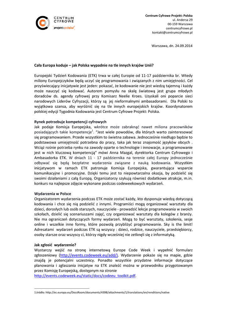 Centrum Cyfrowe Projekt: Polska ul. Andersa 29 00-159 Warszawa centrumcyfrowe.pl [email protected] Warszawa, dn. 24.09.2014 24 Cała Europa koduje – jak Polska wypadnie na tle innych krajów Unii? Europejski Tydzień Kodowania (ETK) trwa w całej Europie od 11-17 17 października br. Wtedy miliony Europejczyków będą uczyć się programowania i związanych z nim umiejętności. Cel przyświecający inicjatywie jest jeden: pokazać, że kodowanie nie jest wiedząą tajemną i każdy może nauczyć się kodować. Autorem pomysłu na skalę światową jest grupa młodych mło doradców ds. agendy cyfrowej przy Komisarz Neelie Kroes. Uzyskali Uzyskali oni poparcie sieci narodowych Liderów Cyfryzacji, którzy są jej nieformalnymi ambasadorami. Dla Polski to wyjątkowa szansa, aby wyróżnić się na tle innych europejskich krajów. Koordynatorem polskiej edycji Tygodnia Kodowania jest Centrum Cyfrowe Projekt: Polska. Rynek potrzebuje kompetencji cyfrowych Jak podaje Komisja Europejska, wkrótce może zabraknąć nawet miliona pracowników posiadających takie kompetencje1. “Jest wiele powodów, dla których warto zainteresować się programowaniem. Przede wszystkim to świetna zabawa. Jednocześnie niedługo będzie to podstawowa umiejętność potrzebna do pracy, taka jak teraz znajomość języków obcych . Wciąż rośnie potrzeba rynku na zawody oparte o technologie nologie i innowacje, a programowanie jest w nich kluczową kompetencją” mówi Anna Mazgal, dyrektorka Centrum Cyfrowego i Ambasadorka ETK.. W dniach 11 - 17 października na terenie całej Europy jednocześnie odbywać się będą bezpłatne wydarzenia związane z nauką ką kodowania. Wszystkim inicjatywom w ramach ETK patronuje Komisja Europejska,, gwarantująca wsparcie komunikacyjne i promocyjne. Dzięki temu jest to niepowtarzalna okazja, by podzielić się swoimi działaniami z całą Europą. Europą Organizatorzy szykują również dodatkowe atkowe atrakcje, m.in. konkurs na najlepsze zdjęcie wykonane podczas codeweekowych wydarzeń. Wydarzenia w Polsce Organizatorem wydarzenia podczas ETK może zostać każdy, kto dysponuje wiedzą dotyczącą kodowania i chce się nią podzielić z innymi. Programiści mogą organizować warsztaty dla dzieci, dorosłych lub osób starszych, nauczyciele nauczyciel - prowadzić lekcje programowania w swoich szkołach, dzielić się scenariuszami zajęć, czy organizować organiz warsztaty dla kolegów z branży. Nie ma ograniczeń dotyczących formy wydarzeń. Mogą to być warsztaty, szkolenia, sesje online i wszelkie inne formy, które pozwolą przybliżyć programowanie. Sky is the limit! Adresatami wydarzeń podczas ETK są wszyscy : dzieci, rodzice, nauczycielee, przedsiębiorcy, osoby starsze oraz wszyscy ci, ci, którzy nigdy wcześniej nie zetknęli się z informatyką. Jak zgłosić wydarzenie? Wystarczy wejść na stronę internetową Europe Code Week i wypełnić formularz zgłoszeniowy (http://events.codeweek.eu/add/ http://events.codeweek.eu/add/).. Wydarzenie pokaże się na mapie, gdzie znajdą je potencjalni uczestnicy. Ponadto wszystkie przydatne informacje dotyczące planowania i zgłaszania inicjatyw na ETK znaleźć można w przewodniku przygotowanym przez Komisję Europejską, ejską, dostępnym na stronie http://events.codeweek.eu/static/docs/codeeu_toolkit.pdf http://events.codeweek.eu/static/docs/codeeu_toolkit.pdf. 1 źródło: http://ec.europa.eu/DocsRoom/documents/4398/attachments/1/translations/en/renditions/native Centrum Cyfrowe Projekt: Polska ul. Andersa 29 00-159 Warszawa centrumcyfrowe.pl [email protected] Europe Code Week w Polsce organizowany jest w ramach projektu „Programuj Przyszłość” finansowanego z dotacji Ministerstwa Administracji i Cyfryzacji. Organizatorem ETK jest Centrum Cyfrowe. Głównym partnerem Europejskiego Tygodnia Kodowania w Polsce jest projekt Mistrzowiee Kodowania. Patronat nad wydarzeniem objęły Ministerstwo Edukacji Narodowej oraz Ministerstwo Administracji i Cyfryzacji. Inicjatywie patronuje też Komisja Europejska. Więcej informacji dostępnych jest na oficjalnej stronie http://www.CodeWeek.euoraz http://www.CodeWeek.eu na Facebooku Europe Code Week (http://www.facebook.com/codeEU). ( Kontakt dla mediów: Katarzyna Maksymowicz [email protected] +48 535 555 267 *** Centrum Cyfrowe Projekt: Polska pracuje na rzecz zmiany społecznej i zwiększenia zaangażowania obywatelskiego wykorzystując potencjał narzędzi cyfrowych oraz modeli współpracy opartych na dzieleniu się zasobami i wiedzą. Wspólnym mianownikiem projektów Centrum Centrum Cyfrowe Projekt: Polska jest otwartość – oznaczająca dostępność zasobów i promowanie modeli współpracy w oparciu o otwarte zasoby. Centrum Cyfrowe Projekt: Polska jest partnerem instytucjonalnym projektu Creative Commons Polska.