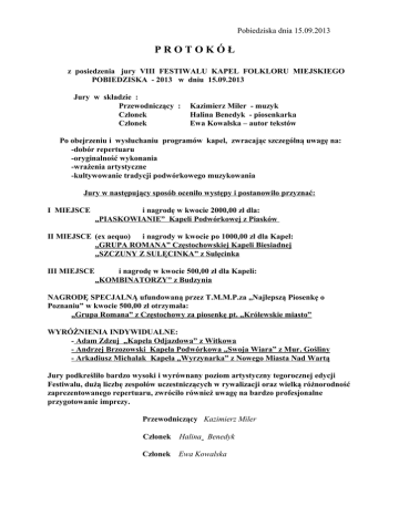 Pobiedziska dnia 15.09.2013 PROTOKÓŁ z posiedzenia jury VIII FESTIWALU KAPEL FOLKLORU MIEJSKIEGO POBIEDZISKA - 2013 w dniu 15.09.2013 Jury w składzie : Przewodniczący : Członek Członek Kazimierz Miler - muzyk Halina Benedyk - piosenkarka Ewa Kowalska – autor tekstów Po obejrzeniu i wysłuchaniu programów kapel, zwracając szczególną uwagę na: -dobór repertuaru -oryginalność wykonania -wrażenia artystyczne -kultywowanie tradycji podwórkowego muzykowania Jury w następujący sposób oceniło występy i postanowiło przyznać: I MIEJSCE i nagrodę w kwocie 2000,00 zł dla: „PIASKOWIANIE” Kapeli Podwórkowej z Piasków II MIEJSCE (ex aequo) i nagrody w kwocie po 1000,00 zł dla Kapel: „GRUPA ROMANA” Częstochowskiej Kapeli Biesiadnej „SZCZUNY Z SULĘCINKA” z Sulęcinka III MIEJSCE i nagrodę w kwocie 500,00 zł dla Kapeli: „KOMBINATORZY” z Budzynia NAGRODĘ SPECJALNĄ ufundowaną przez T.M.M.P.za „Najlepszą Piosenkę o Poznaniu” w kwocie 500,00 zł otrzymała: „Grupa Romana” z Częstochowy za piosenkę pt. „Królewskie miasto” WYRÓŻNIENIA INDYWIDUALNE: - Adam Zdzuj „Kapela Odjazdowa” z Witkowa - Andrzej Brzozowski Kapela Podwórkowa „Swoja Wiara” z Mur. Gośliny - Arkadiusz Michalak Kapela „Wyrzynarka” z Nowego Miasta Nad Wartą Jury podkreśliło bardzo wysoki i wyrównany poziom artystyczny tegorocznej edycji Festiwalu, dużą liczbę zespołów uczestniczących w rywalizacji oraz wielką różnorodność zaprezentowanego repertuaru, zwróciło również uwagę na bardzo profesjonalne przygotowanie imprezy. Przewodniczący Kazimierz Miler Członek Halina Benedyk Członek Ewa Kowalska