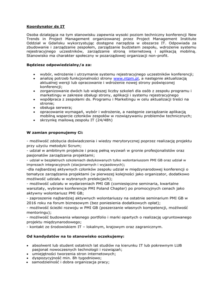 Koordynator ds IT Osoba działająca na tym stanowisku zapewnia wysoki poziom techniczny konferencji New Trends in Project Management organizowanej przez Project Management Institute Oddział w Gdańsku wykorzystując dostępne narzędzia w obszarze IT. Odpowiada za zbudowanie i zarządzanie zespołem, zarządzanie budżetem zespołu, wdrożenie systemu rejestracyjnego uczestników, zarządzanie stroną internetową i aplikacją mobilną. Stanowisko ma charakter społeczny w pozarządowej organizacji non-profit. Będziesz odpowiedzialny/a za: wybór, wdrożenie i utrzymanie systemu rejestracyjnego uczestników konferencji; analizę potrzeb funkcjonalności strony www.ntpm.pl, a następnie aktualizacją aktualnej wersji lub opracowanie i wdrożenie nowej strony poświęconej konferencji; zorganizowanie dwóch lub większej liczby szkoleń dla osób z zespołu programu i marketingu w zakresie obsługi strony, aplikacji i systemu rejestracyjnego współpraca z zespołami ds. Programu i Marketingu w celu aktualizacji treści na stronie; obsługa serwera; opracowanie wymagań, wybór i wdrożenie, a następnie zarządzanie aplikacją mobilną wsparcie członków zespołów w rozwiązywaniu problemów technicznych; skrzynkę mailową zespołu IT (24/48h) W zamian proponujemy Ci: - możliwość zdobycia doświadczenia i wiedzy merytorycznej poprzez realizację projektu przy użyciu metodyki Scrum; - udział w ambitnym projekcie i pracę pełną wyzwań w gronie profesjonalistów oraz pasjonatów zarządzania projektami; - udział w bezpłatnych szkoleniach dedykowanych tylko wolontariuszom PMI GB oraz udział w imprezach integracyjnych (stacjonarnych i wyjazdowych); -dla najbardziej aktywnych członków zespołu udział w międzynarodowej konferencji o tematyce zarządzania projektami (w pierwszej kolejności jako organizator, dodatkowo możliwość udziału w wybranych prelekcjach); - możliwość udziału w wydarzeniach PMI GB (comiesięczne seminaria, kwartalne warsztaty, wybrane konferencje PMI Poland Chapter) po promocyjnych cenach jako aktywny wolontariusz PMI GB; - zaproszenie najbardziej aktywnych wolontariuszy na ostatnie seminarium PMI GB w 2016 roku na forum biznesowym (bez poniesienia dodatkowych opłat); - możliwość ścieżki rozwoju w PMI GB (poszerzanie własnych kompetencji, możliwość mentoringu); - możliwość budowania własnego portfolio i marki opartych o realizację ugruntowanego projektu międzynarodowego; - kontakt ze środowiskiem IT – lokalnym, krajowym oraz zagranicznym. Od kandydatów na to stanowisko oczekujemy: absolwent lub student ostatnich lat studiów na kierunku IT lub pokrewnym LUB pasjonat nowoczesnych technologii i rozwiązań; umiejętności tworzenia stron internetowych; dyspozycyjność min. 8h tygodniowo; samodzielność i dobra organizacja pracy; komunikatywność i umiejętność pracy w zespole; odpowiedzialność za powierzone zadania mile widziana znajomość języków programowania doświadczenie w pracy na stanowiskach bądź w projektach związanych z obszarem IT, również społecznych (mile widziane 2 lata doświadczenia w zarządzaniu projektami); odpowiedzialności za zadania, których się podejmiesz; bardzo dobrej znajomości języka angielskiego; samodzielności;