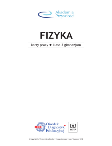 FIZYKA karty pracy l klasa 3 gimnazjum © Copyright by Wydawnictwa Szkolne i Pedagogiczne sp. z o.o., Warszawa 2012 Fizyka w gimnazjum ZADANIA WYRÓWNUJĄCE Zadanie 1. (1) Uzupełnij poniższe zdania, tak aby były prawdziwe. W każdym zdaniu zaznacz litery przyporządkowane odpowiednim informacjom. 1.1. Na tłustej powierzchni patelni woda tworzy kuliste krople, ponieważ siły A / B działające między drobinami wody są C / D niż siły A / B działające między drobinami wody i drobinami tłuszczu. A.spójności B.przylegania C.mniejsze D.większe 1.2. Powierzchnia wody w szklance jest zakrzywiona w pobliżu ścianek szklanki, ponieważ siły przylegania działające między drobinami A / B są C / D niż siły spójności działające między drobinami A / B. A.wody B.wody i drobinami szkła C.mniejsze D.większe Wszystkie substancje są zbudowane z drobin, które na siebie oddziałują. Siły wzajemnego oddziaływania drobin tej samej substancji nazywamy siłami spójności, a siły wzajemnego oddziaływania drobin różnych substancji – siłami przylegania. Zadanie 2. (3) Drewniany klocek o masie 20 g pływa w wodzie (rysunek). Oceń prawdziwość każdego zdania. Zaznacz P, jeśli zdanie jest prawdziwe, lub F, jeśli jest fałszywe. 2.1 Ciężar tego klocka wynosi 0,2 N. P/F 2.2 Gęstość klocka jest równa gęstości wody. P/F 2.3 Siła wyporu działająca na klocek jest równa 0,2 N. P/F 2.4 Gdy na pływający klocek położymy drugi taki sam klocek, to siła wyporu P/F działająca na klocki wzrośnie dwukrotnie. Na pływające ciało działają dwie siły (siła ciężkości i siła wyporu), które się równoważą. 2 WRZESIEŃ 2012 Fizyka w gimnazjum Zadanie 3. (3) Na wykresie przedstawiono zależność energii potencjalnej ciężkości książki od wysokości tej . książki nad podłogą. Do obliczeń przyjmij, że g = 10 m s2 Uzupełnij poniższe zdania, tak aby były prawdziwe. Wpisz w każdą lukę odpowiednią liczbę. 3.1. Masa książki wynosi _______ kg. 3.2. Energia potencjalna książki na wysokości 20 cm jest równa _______ J. 3.3. Praca wykonana podczas podnoszenia książki o 0,5 m wynosi _______ J. 3.4. Energię potencjalną równą 75 J będzie miała książka na wysokości _______ m. Energię potencjalną ciężkości ciała obliczamy z wzoru: Ep = mgh, gdzie m – masa ciała, g – przyspieszenie ziemskie, h – wysokość nad podłożem. Zadanie 4. (5) Najbardziej znanymi odmianami alotropowymi węgla są grafit i diament. Różnią się między sobą własnościami fizycznymi. Grafit jest nieprzezroczysty, czarny i można nim rysować. g Diament jest przezroczysty i bardzo twardy. Gęstość grafitu wynosi około 2, 1 cm3 , a diamentu g około 3, 5 cm3 . Uzupełnij poniższy tekst, tak aby zdania były prawdziwe. Zaznacz litery przyporządkowane odpowiednim informacjom. Diament i grafit to A / B pierwiastek chemiczny. Diament i grafit jest zbudowany z C / D drobin. Różna gęstość diamentu i grafitu jest spowodowana E / F drobin diamentu i drobin grafitu. A.inny B.taki sam C.różnych D.takich samych E. inną masą F. innym ułożeniem Gęstość jest wielkością charakterystyczną dla danej substancji i stałą w określonej temperaturze. O gęstości ciała decyduje masa drobin tworzących ciało oraz ich ułożenie. WRZESIEŃ 2012 3 Fizyka w gimnazjum Zadanie 5. (7) Uczniowie wykonali doświadczenie. Gładką deskę o długości 2 m ustawili pod pewnym kątem do poziomu. Zmierzyli kilkakrotnie czas ruchu stalowej kulki staczającej się z najwyższego punktu deski. Następnie deskę ustawili pod większym kątem niż poprzednio i ponownie zmierzyli kilkakrotnie czas staczania kulki (rysunki). Pomiary zanotowali w tabeli. Nachylenie deski względem poziomu Długość drogi przebytej przez kulkę (m) Średni czas ruchu kulki (s) około 30° 2 0,9 około 60° 2 0,7 Zaznacz wszystkie poprawne odpowiedzi, korzystając z informacji zamieszczonych na rysunkach i zawartych w tabeli. Jakie wnioski mogli sformułować uczniowie po wykonaniu doświadczenia? A.Kulka poruszała się ruchem jednostajnym. B.Kulka poruszała się ruchem jednostajnie przyspieszonym. C.Kulka poruszała się z takim samym przyspieszeniem, niezależnie od kąta nachylenia deski do poziomu. D.Kulka poruszała się z większym przyspieszeniem po desce ustawionej pod większym kątem do poziomu. E. Kulka osiągnęła taka samą prędkość, niezależnie od kąta nachylenia desek. F. Kulka osiągnęła większą prędkość, gdy poruszała się po desce ustawionej pod większym kątem. Ciało porusza się ruchem jednostajnie przyspieszonym, gdy działa na niego stała siła wypadkowa. Ciało porusza się z większym przyspieszeniem, gdy działa na niego większa siła wypadkowa. 4 WRZESIEŃ 2012 Fizyka w gimnazjum ZADANIA UTRWALAJĄCE Zadanie 1. (1) 1.1. Uzupełnij poniższe zdanie, tak aby było prawdziwe. Zaznacz litery przyporządkowane odpowiednim informacjom. Suche włosy A / B, ponieważ odległości między sąsiednimi włosami są na tyle C / D, że siły wzajemnego przyciągania między drobinami sąsiednich włosów są bardzo E / F. A.„sklejają się” B.nie „sklejają się” C.małe D.duże E. małe F. duże 1.2. Uzupełnij poniższy tekst, tak aby zdania były prawdziwe. Zaznacz litery przyporządkowane odpowiednim informacjom. Mokre włosy A / B, ponieważ przestrzenie między sąsiednimi włosami wypełniają drobiny wody. Odległości między drobinami wody i drobinami włosów są na tyle C / D, że E / F między nimi siły międzycząsteczkowe. A.„sklejają się” B.nie „sklejają się” C.małe D.duże E. działają F. nie działają Zadanie 2. (3) Kulkę zawieszono na siłomierzu. Siłomierz wskazał 2 N. Następnie, nie zdejmując kulki z siłomierza, zanurzono ją całkowicie w wodzie. Siłomierz wskazał 1,8 N. Oceń prawdziwość każdego zdania. Zaznacz P, jeśli zdanie jest prawdziwe, lub F, jeśli jest fałszywe. 2.1 Masa kulki wynosiła 20 