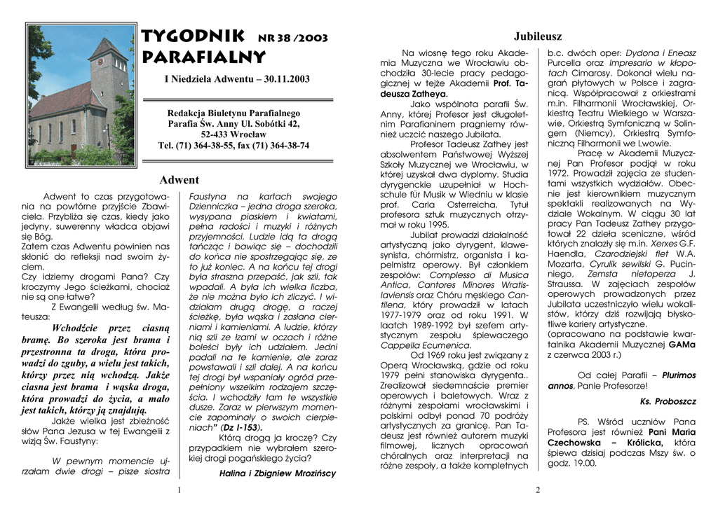TYGODNIK Nr 38 /2003 PARAFIALNY I Niedziela Adwentu – 30.11.2003 Redakcja Biuletynu Parafialnego Parafia Św. Anny Ul. Sobótki 42, 52-433 Wrocław Tel. (71) 364-38-55, fax (71) 364-38-74 Adwent Adwent to czas przygotowania na powtórne przyjście Zbawiciela. Przybliża się czas, kiedy jako jedyny, suwerenny władca objawi się Bóg. Zatem czas Adwentu powinien nas skłonić do refleksji nad swoim życiem. Czy idziemy drogami Pana? Czy kroczymy Jego ścieżkami, chociaż nie są one łatwe? Z Ewangelii według św. Mateusza: Faustyna na kartach swojego Dzienniczka – jedna droga szeroka, wysypana piaskiem i kwiatami, pełna radości i muzyki i różnych przyjemności. Ludzie idą ta drogą tańcząc i bawiąc się – dochodzili do końca nie spostrzegając się, ze to już koniec. A na końcu tej drogi była straszna przepaść, jak szli, tak wpadali. A była ich wielka liczba, że nie można było ich zliczyć. I widziałam drugą drogę, a raczej ścieżkę, była wąska i zasłana cierniami i kamieniami. A ludzie, którzy nią szli ze łzami w oczach i różne boleści były ich udziałem. Jedni padali na te kamienie, ale zaraz powstawali i szli dalej. A na końcu tej drogi był wspaniały ogród przepełniony wszelkim rodzajem szczęścia. I wchodziły tam te wszystkie dusze. Zaraz w pierwszym momencie zapominały o swoich cierpieniach” (Dz I-153). Którą drogą ja kroczę? Czy przypadkiem nie wybrałem szerokiej drogi pogańskiego życia? Wchodźcie przez ciasną bramę. Bo szeroka jest brama i przestronna ta droga, która prowadzi do zguby, a wielu jest takich, którzy przez nią wchodzą. JakŜe ciasna jest brama i wąska droga, która prowadzi do Ŝycia, a mało jest takich, którzy ją znajdują. Jakże wielka jest zbieżność słów Pana Jezusa w tej Ewangelii z wizją Św. Faustyny: W pewnym momencie ujrzałam dwie drogi – pisze siostra Halina i Zbigniew Mrozińscy 1 Jubileusz b.c. dwóch oper: Dydona i Eneasz Purcella oraz Impresario w kłopotach Cimarosy. Dokonał wielu nagrań płytowych w Polsce i zagranicą. Współpracował z orkiestrami m.in. Filharmonii Wrocławskiej, Orkiestrą Teatru Wielkiego w Warszawie, Orkiestrą Symfoniczną w Solingern (Niemcy), Orkiestrą Symfoniczną Filharmonii we Lwowie. Pracę w Akademii Muzycznej Pan Profesor podjął w roku 1972. Prowadził zajęcia ze studentami wszystkich wydziałów. Obecnie jest kierownikiem muzycznym spektakli realizowanych na Wydziale Wokalnym. W ciągu 30 lat pracy Pan Tadeusz Zathey przygotował 22 dzieła sceniczne, wśród których znalazły się m.in. Xerxes G.F. Haendla, Czarodziejski flet W.A. Mozarta, Cyrulik sewilski G. Pucinniego, Zemsta nietoperza J. Straussa. W zajęciach zespołów operowych prowadzonych przez Jubilata uczestniczyło wielu wokalistów, którzy dziś rozwijają błyskotliwe kariery artystyczne. (opracowano na podstawie kwartalnika Akademii Muzycznej GAMa z czerwca 2003 r.) Na wiosnę tego roku Akademia Muzyczna we Wrocławiu obchodziła 30-lecie pracy pedagogicznej w tejże Akademii Prof. Tadeusza Zatheya. Jako wspólnota parafii Św. Anny, której Profesor jest długoletnim Parafianinem pragniemy również uczcić naszego Jubilata. Profesor Tadeusz Zathey jest absolwentem Państwowej Wyższej Szkoły Muzycznej we Wrocławiu, w której uzyskał dwa dyplomy. Studia dyrygenckie uzupełniał w Hochschule fÜr Musik w Wiedniu w klasie prof. Carla Osterreicha. Tytuł profesora sztuk muzycznych otrzymał w roku 1995. Jubilat prowadzi działalność artystyczną jako dyrygent, klawesynista, chórmistrz, organista i kapelmistrz operowy. Był członkiem zespołów: Complesso di Musica Antica, Cantores Minores Wratislaviensis oraz Chóru męskiego Cantilena, który prowadził w latach 1977-1979 oraz od roku 1991. W laatch 1989-1992 był szefem artystycznym zespołu śpiewaczego Cappella Ecumenica. Od 1969 roku jest związany z Operą Wrocławską, gdzie od roku 1979 pełni stanowiska dyrygenta.. Zrealizował siedemnaście premier operowych i baletowych. Wraz z różnymi zespołami wrocławskimi i polskimi odbył ponad 70 podróży artystycznych za granicę. Pan Tadeusz jest również autorem muzyki filmowej, licznych opracowań chóralnych oraz interpretacji na różne zespoły, a także kompletnych Od całej Parafii – Plurimos annos, Panie Profesorze! Ks. Proboszcz PS. Wśród uczniów Profesora jest również Pani Czechowska – Królicka, śpiewa dzisiaj podczas Mszy godz. 19.00. 2 Pana Maria która św. o Porada lekarska W okresie infekcyjnym w przychodniach bardzo często mamy do czynienia z sytuacją, gdy zaniepokojone mamy przybiegają z dzieckiem do lekarza natychmiast, jeśli okaże się, że dziecko gorączkuje. Zdarza się nagminnie, że przede wszystkim najpierw dzieci otrzymują silne środki przeciwgorączkowe, czego nie należy czynić i od razu dziecko przywożone jest do przychodni z naleganiem, aby przyjąć je natychmiast, bo gorączkuje. Gdy zapytamy się: „Od kiedy dziecko gorączkuje?” - okazuje się, że właśnie od 2 godzin. Trzeba wyraźnie podkreślić, że takie szybkie pokazywanie się z gorączkującym dzieckiem wcale nie ułatwia, ale wręcz utrudnia postawienie właściwej diagnozy. Otóż, gorączka jest tylko jednym z wielu objawów choroby, często jednym z pierwszych. Na rozwój innych objawów trzeba zwykle znacznie więcej czasu. A właśnie wszystkie objawy oraz wyniki badania przez lekarza pozwalają dokładnie określić, co dziecku jest. Dopiero bowiem po pewnym czasie, ze względu na charakterystyczne zmiany, które lekarz może wybadać, można stwierdzić, czy infekcja jest umiej- scowiona w nosie, jamie ustnej, węzłach chłonnych, śliniankach, gardle, tchawicy, oskrzelach, zatokach, uchu, układzie moczowym, pokarmowym lub innym oraz łatwiej można rozpoznać atakujący zarazek. Stad wielu światowej sławy pediatrów zaleca, aby odczekać ze zgłoszeniem się do lekarza z gorączkującym dzieckiem od 24 do 72 godzin, aby pozwoli
