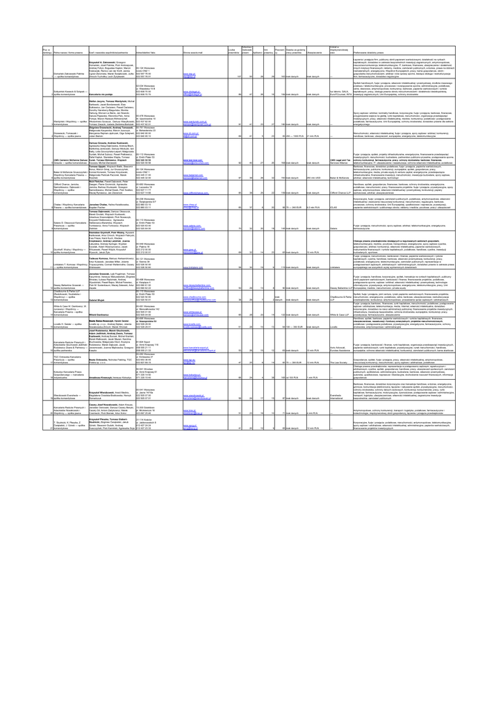 Poz. w rankingu Pełna nazwa i forma prawna Domański Zakrzewski Palinka 1 — spółka komandytowa Szef i nazwiska wspólników/partnerów Adres/telefon/ faks Krzysztof A. Zakrzewski, Grzegorz Domański, Józef Palinka, Piotr Andrzejczak, Andrzej Foltyn, Bogusław Kapłon, Marcin Krakowiak, Remco van der Kroft, Janina Ligner-Żeromska, Marek Świątkowski, Julita Zimoch-Tuchołka, Lech Żyżylewski 00-124 Warszawa rondo ONZ 1 022 557 76 00 022 557 76 01 www.dzp.pl [email protected] 02-034 Warszawa ul. Wawelska 15 B 022 608 70 00 022 608 70 70 www.skslegal.pl [email protected] Sołtysiński Kawecki & Szlęzak — 2 spółka komandytowa Kancelaria nie podaje Stefan Jacyno, Tomasz Wardyński, Michał Barłowski, Jacek Bondarewski, Ewa Butkiewicz, Jan Ciećwierz, Paweł Ciećwierz, Dorothy Hansberry-Bieguńska, Monika Hartung, Morvan Le Berre, Jan Nowicki, Danuta Pajewska, Weronika Pelc, Anna Pompe, Marcin Radwan-Rõhrenschef, Włodzimierz Szoszuk, Dariusz Wasylkowski, Tomasz Zasacki, Izabela Zielińska-Barłożek Zbigniew Drzewiecki, Andrzej Tomaszek, Małgorzata Kacperska, Marcin Juszczyk, Marcjanna Rejman-Jędrczak, Olga Sztejnert, Julian Bielicki 00-478 Warszawa Al. Ujazdowskie 10 022 437 82 00 022 437 82 01 00-761 Warszawa ul. Belwederska 23 022 840 95 00 022 840 95 10 Strona www/e-mail Liczba prawników 107 89 50 47 28 26 29 16 183 brak danych 184 brak danych — brak danych Spółek handlowych, fuzje i przejęcia, własności intelektualnej i przemysłowej, środków masowego przekazu i telekomunikacyjne, procesowe i rozwiązywanie sporów, administracyjne, podatkowe, celne, dewizowe, antymonopolowe, konkurencji, bankowe, papierów wartościowych i rynków kapitałowych, pracy, obsługa prawna obrotu nieruchomościami i działalności deweloperskiej, Ius laboris, GALA, EurolTCounsel, INTA inwestycji zagranicznych, Unii Europejskiej, ochrony środowiska — 21 mln PLN — Nieruchomości, własności intelektualnej, fuzje i przejęcia, spory sądowe i arbitraż, konkurencji, handlowe, bankowe, ubezpieczeń, europejskie, energetyczne, telekomunikacyjne 168 brak danych brak danych CMS Legal and Tax Services Alliance Fuzje i przejęcia, spółek, projekty infrastrukturalne, energetyczne, finansowanie przedsięwzięć inwestycyjnych, nieruchomości, budowlane, partnerstwo publiczno-prywatne, postępowanie sporne, ochrony konkurencji, farmaceutyczne, pracy, ochrony środowiska, bankowe, finansowe, telekomunikacyjne, IT, ubezpieczenia i reasekuracja, ochrona własności intelektualnej, podatkowe 32 150 brak danych 250 mln USD Baker & McKenzie Bankowe, finansowe, doradztwo podatkowe, fuzje i przejęcia, papierów wartościowych, farmaceutyczne, publiczne, konkurencji, europejskie, spółek, gospodarcze, pracy, telekomunikacyjne, media, private equity & venture capital, energetyczne, przedsięwzięcia infrastrukturalne, finansowanie inwestycji, nieruchomości, inwestycje budowlane, spory sądowe, arbitraż, własności intelektualnej, technologii 25 22 159 brak danych brak danych Clifford Chance LLP Handlowe, spółek, gospodarcze, finansowe, bankowe, ochrony środowiska, energetyczne, podatkowe, nieruchomości, pracy, finansowanie projektów, fuzje i przejęcia, prywatyzacyjne, spory sądowe, antymonopolowe, własności intelektualnej i przemysłowej, konkurencji, papiery wartościowe, arbitraż, ubezpieczeniowe 37 8 20 9,2 mln PLN ICLAS Korporacyjne, fuzje i przejęcia, zamówień publicznych, podatkowe, antymonopolowe, własności intelektualnej i zwalczania nieuczciwej konkurencji, nieruchomości, regulacyjne, bankowe, procesowe, ochrony środowiska, Unii Europejskiej, upadłościowe i naprawcze, prywatyzacji, papierów wartościowych i publicznego obrotu, reklamy i mediów, pocztowe, pracy i ubezpieczeń 32 20 18 brak danych Salans Fuzje i przejęcia, nieruchomości, spory sądowe, arbitraż, telekomunikacyjne, energetyczne, farmaceutyczne 10 mln PLN — Obsługa prawna przedsiębiorstw Obsługa przedsiębiorstw działających działających w regulowanych sektorach sektorach gospodarki gospodarki, telekomunikacyjne, mediów, pocztowe, transportowe, energetyczne, spory sądowe (cywilne, gospodarcze), arbitraż, konkurencji, własności intelektualnej, papierów wartościowych, instrumentów finansowych i rynków kapitałowych, podatkowe, handlowe, cywilne, inwestycji budowlanych, sportowe 115 brak danych brak danych Linklaters Fuzje i przejęcia, nieruchomości, bankowość i finanse, papierów wartościowych i rynków kapitałowych, cywilne, handlowe, bankowe, własności przemysłowej, konkurencji, pracy, podatkowe, energetyczne, telekomunikacyjne, zamówień publicznych, reprezentacja w postępowaniach sądowych, arbitrażowych i administracyjnych, doradztwo prawne w zakresie prawa europejskiego we wszystkich wyżej wymienionych dziedzinach 90 brak danych brak danych Fuzje i przejęcia, handlowe, korporacyjne, spółek, transakcje na rynkach kapitałowych, publiczny obrót papierami wartościowymi, bankowość i finanse, finansowanie projektów, podatkowe, postępowania sporne, sądowe i arbitraż, własności intelektualnej i przemysłowej, technologie informatyczne, prywatyzacja, antymonopolowe, energetyczne, telekomunikacyjne, pracy, Unii Dewey Ballantine LLP Europejskiej, mediów, nieruchomości, private equity brak danych brak danych Spółek, fuzje i przejęcia, joint venture, rynek papierów wartościowych, finansowanie projektów, Chadbourne & Parke nieruchomości, energetyczne, podatkowe, celne, bankowe, ubezpieczeniowe, restrukturyzacja przedsiębiorstw, konkurencji, antymonopolowe, prowadzenie spraw sądowych i arbitrażowych LLP 122 brak danych brak danych White & Case LLP Fuzje i przejęcia, bankowe, finansowe, rynki kapitałowe, nieruchomości, podatkowe, postępowanie sądowe i arbitrażowe, telekomunikacja, media, Internet, własność intelektualna, doradztwo korporacyjne, doradztwo na rzecz administracji publicznej, finansowanie projektów inwestycyjnych, infrastruktu