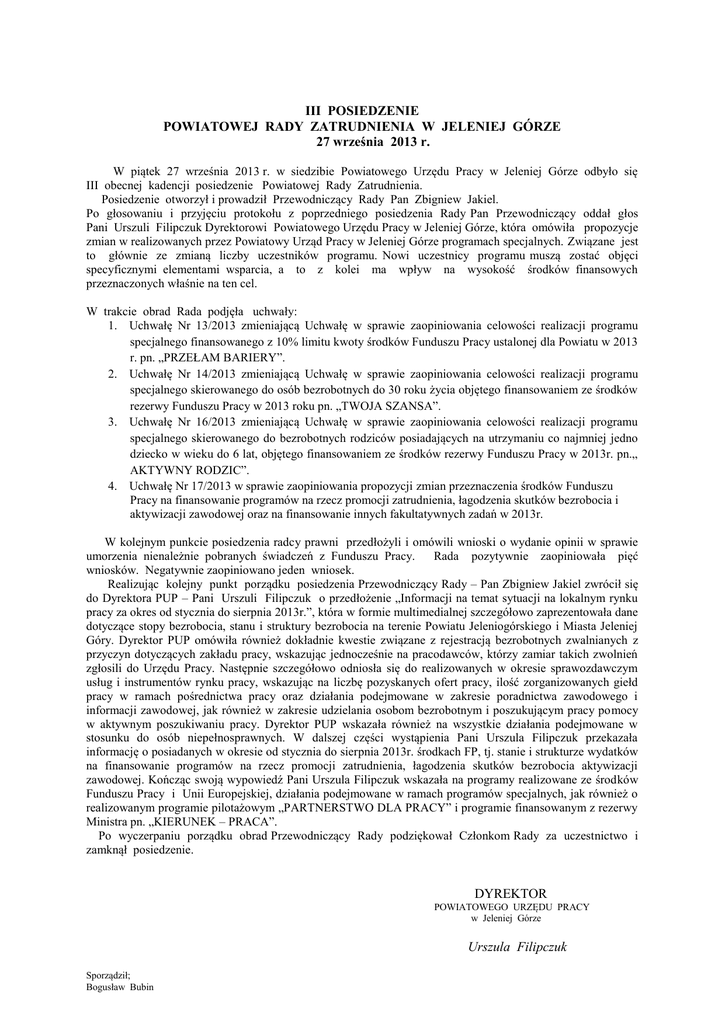 III POSIEDZENIE POWIATOWEJ RADY ZATRUDNIENIA W JELENIEJ GÓRZE 27 września 2013 r. W piątek 27 września 2013 r. w siedzibie Powiatowego Urzędu Pracy w Jeleniej Górze odbyło się III obecnej kadencji posiedzenie Powiatowej Rady Zatrudnienia. Posiedzenie otworzył i prowadził Przewodniczący Rady Pan Zbigniew Jakiel. Po głosowaniu i przyjęciu protokołu z poprzedniego posiedzenia Rady Pan Przewodniczący oddał głos Pani Urszuli Filipczuk Dyrektorowi Powiatowego Urzędu Pracy w Jeleniej Górze, która omówiła propozycje zmian w realizowanych przez Powiatowy Urząd Pracy w Jeleniej Górze programach specjalnych. Związane jest to głównie ze zmianą liczby uczestników programu. Nowi uczestnicy programu muszą zostać objęci specyficznymi elementami wsparcia, a to z kolei ma wpływ na wysokość środków finansowych przeznaczonych właśnie na ten cel. W trakcie obrad Rada podjęła uchwały: 1. Uchwałę Nr 13/2013 zmieniającą Uchwałę w sprawie zaopiniowania celowości realizacji programu specjalnego finansowanego z 10% limitu kwoty środków Funduszu Pracy ustalonej dla Powiatu w 2013 r. pn. „PRZEŁAM BARIERY”. 2. Uchwałę Nr 14/2013 zmieniającą Uchwałę w sprawie zaopiniowania celowości realizacji programu specjalnego skierowanego do osób bezrobotnych do 30 roku życia objętego finansowaniem ze środków rezerwy Funduszu Pracy w 2013 roku pn. „TWOJA SZANSA”. 3. Uchwałę Nr 16/2013 zmieniającą Uchwałę w sprawie zaopiniowania celowości realizacji programu specjalnego skierowanego do bezrobotnych rodziców posiadających na utrzymaniu co najmniej jedno dziecko w wieku do 6 lat, objętego finansowaniem ze środków rezerwy Funduszu Pracy w 2013r. pn.„ AKTYWNY RODZIC”. 4. Uchwałę Nr 17/2013 w sprawie zaopiniowania propozycji zmian przeznaczenia środków Funduszu Pracy na finansowanie programów na rzecz promocji zatrudnienia, łagodzenia skutków bezrobocia i aktywizacji zawodowej oraz na finansowanie innych fakultatywnych zadań w 2013r. W kolejnym punkcie posiedzenia radcy prawni przedłożyli i omówili wnioski o wydanie opinii w sprawie umorzenia nienależnie pobranych świadczeń z Funduszu Pracy. Rada pozytywnie zaopiniowała pięć wniosków. Negatywnie zaopiniowano jeden wniosek. Realizując kolejny punkt porządku posiedzenia Przewodniczący Rady – Pan Zbigniew Jakiel zwrócił się do Dyrektora PUP – Pani Urszuli Filipczuk o przedłożenie „Informacji na temat sytuacji na lokalnym rynku pracy za okres od stycznia do sierpnia 2013r.”, która w formie multimedialnej szczegółowo zaprezentowała dane dotyczące stopy bezrobocia, stanu i struktury bezrobocia na terenie Powiatu Jeleniogórskiego i Miasta Jeleniej Góry. Dyrektor PUP omówiła również dokładnie kwestie związane z rejestracją bezrobotnych zwalnianych z przyczyn dotyczących zakładu pracy, wskazując jednocześnie na pracodawców, którzy zamiar takich zwolnień zgłosili do Urzędu Pracy. Następnie szczegółowo odniosła się do realizowanych w okresie sprawozdawczym usług i instrumentów rynku pracy, wskazując na liczbę pozyskanych ofert pracy, ilość zorganizowanych giełd pracy w ramach pośrednictwa pracy oraz działania podejmowane w zakresie poradnictwa zawodowego i informacji zawodowej, jak również w zakresie udzielania osobom bezrobotnym i poszukującym pracy pomocy w aktywnym poszukiwaniu pracy. Dyrektor PUP wskazała również na wszystkie działania podejmowane w stosunku do osób niepełnosprawnych. W dalszej części wystąpienia Pani Urszula Filipczuk przekazała informację o posiadanych w okresie od stycznia do sierpnia 2013r. środkach FP, tj. stanie i strukturze wydatków na finansowanie programów na rzecz promocji zatrudnienia, łagodzenia skutków bezrobocia aktywizacji zawodowej. Kończąc swoją wypowiedź Pani Urszula Filipczuk wskazała na programy realizowane ze środków Funduszu Pracy i Unii Europejskiej, działania podejmowane w ramach programów specjalnych, jak również o realizowanym programie pilotażowym „PARTNERSTWO DLA PRACY” i programie finansowanym z rezerwy Ministra pn. „KIERUNEK – PRACA”. Po wyczerpaniu porządku obrad Przewodniczący Rady podziękował Członkom Rady za uczestnictwo i zamknął posiedzenie. DYREKTOR POWIATOWEGO URZĘDU PRACY w Jeleniej Górze Urszula Filipczuk Sporządził; Bogusław Bubin