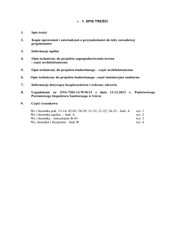 • 1. SPIS TREŚCI 1. Spis treści 2. Kopie uprawnień i zaświadczeń o przynależności do izby zawodowej projektantów 3. Informacje ogólne 4. Opis techniczny do projektu zagospodarowania terenu - część architektoniczna 5. Opis techniczny do projektu budowlanego – część architektoniczna 6. Opis techniczny do projektu budowlanego –część instalacyjno sanitarna 7. Informacja dotycząca bezpieczeństwa i ochrony zdrowia 8. Uzgodnienie nr ZNS-7201-11/WM/13 z dnia 13.12.2013 r. Państwowego Powiatowego Inspektora Sanitarnego w Górze 9. Część rysunkowa Wc i łazienka pok. 13-14, 02-03, 28-29, 31-32, 21-22, 24-25 – bud. A Wc i łazienka ogólna – bud. A Wc i łazienka – mieszkanie B-43 Wc, łazienka i fryzjernia – bud. B rys. 1 rys. 2 rys. 3 rys. 4 2. KOPIE UPRAWNIEŃ I ZAŚWIADCZEŃ O PRZYNALEŻNOŚCI DO IZBY ZAWODOWEJ PROJEKTANTÓW 3. INFORMACJE OGÓLNE 3.1 Dane ogólne Adres inwestycji: obręb Wroniniec, dz. dz. Nr 324/2, jednostka ewidencyjna Niechlów 56-215 Niechlów, Wroniniec 59 Inwestor: Dom Pomocy Społecznej we Wronińcu, 56-215 Niechlów, Wroniniec 59 3.2 Podstawa opracowania 1 Zlecenie Inwestora; 2 Mapa zasadnicza w skali 1:1000; 3 Uzgodnienia z Inwestorem; 4 Przepisy techniczno-budowlane, normy. 4. OPIS TECHNICZNY DO PROJEKTU ZAGOSPODAROWANIA TERENU 4.1 Przedmiot inwestycji Przedmiotem opracowania jest remont i modernizacja pomieszczeń sanitarnych w Domu Pomocy Społecznej we Wronińcu. 4.2 Istniejący stan zagospodarowania terenu Działka inwestycji leży na terenie płaskim. W centralnej części działki znajduje się przedmiotowy budynek DPS-u, w części południowej – budynki pomocnicze, techniczne. Od strony północnej z działką inwestycji sąsiaduje droga wojewódzka nr 324 ze skrzyżowaniem z drogą wojewódzką nr 305. Po stronie wschodniej działki inwestycji znajdują się ruiny kościoła, oraz zabudowa mieszkaniowa, południowej – pola uprawne i zabudowa mieszkaniowa, a po stronie zachodniej – zabudowa usługowa. 4.3 Projektowany stan zagospodarowania terenu Zagospodarowanie terenu nie ulega zmianie. W części wejściowej przebudowie ulegnie istniejąca winda dla osób niepełnosprawnych. 4.4 Tereny podlegające ochronie Nie dotyczy. 4.5 Dane określające wpływ eksploatacji górniczej na działkę Teren inwestycji leży w obszarze eksploatacji gazu ziemnego. Nie stwierdzono wpływu eksploatacji górniczej na przedmiotowy budynek. 4.6 Gospodarka odpadami Odbiór odpadów budowlanych na zasadach określonych przez Gminę Niechlów. 4.7 Wpływ inwestycji na środowisko Planowana inwestycja nie należy do przedsięwzięć, o których mowa w art. 59 ustawy z dnia 3 października 2008r. o udostępnieniu informacji o środowisku i jego ochronie, udziale społeczeństwa w ochronie środowiska oraz o ocenach oddziaływania na środowisko (Dz. U. Nr 199, poz.1227) i nie znajduje się w katalogu zawartym w rozporządzeniu Rady Ministrów z dnia 9 listopada 2010 r. w sprawie przedsięwzięć mogących znacząco oddziaływać na środowisko (Dz. U. Nr 213, poz. 1397 z późn. zm.). 5. OPIS TECHNICZNY DO PROJEKTU ARCHITEKTONICZNO-BUDOWLANEGO • 5.1 Przedmiot opracowania Przedmiotem opracowania jest remont i modernizacja pomieszczeń sanitarnych w Domu Pomocy Społecznej we Wronińcu, oraz przebudowa windy dla osób niepełnosprawnych. 5.2 Zestawienie powierzchni i wielkości Powierzchnie podłogi pomieszczeń sanitarnych wc i łazienka pok. 13-14, 02-03, 28-29, 31-32, 21-22, 24-25 – bud. A 6 x 18,62m2 = 111,72m2 4.1 przedsionek - 6 x 8,57m2 4.2 wc i łazienka - 6 x 10,05m2 wc i łazienka ogólna – bud. A 7.1 wc i łazienka wc i łazienka – mieszkanie B-43 8.1 wc i łazienka • wc, łazienka i fryzjernia – bud. B 10.1 przedsionek 10.2 fryzjernia 10.3 przedsionek wc 10.4 wc 10.5 wc 10.6 wc niepełnosprawnych RAZEM: - 19,77m2 2 - 19,77m - 6,78m2 - 6,78m2 - 19,37m2 2 - 2,05m - 6,15m2 - 4,34m2 - 1,34m2 - 1,34m2 - 4,15m2 - 157,64m2 5.3 Rozwiązania techniczne i materiałowe Pomieszczenia sanitarne Posadzki. We wszystkich pomieszczeniach płytki antypoślizgowe o podwyższonym standardzie. W pomieszczeniach z natryskami wykonać spadki do wpustów podłogowych pod prysznicami. W posadzce wykonać izolację z płynnej folii. Ściany. Zamurowania ścian z bloczków pianobetonowych (np. Siporex) pokryte tynkiem cementowo-wapiennym. Ściany w wc, łazience, fryzjerni w bud. B (rys. 10) z bloczków pianobetonowych gr. 6cm z tynkiem cementowo-wapiennym gr. 1cm. Ściany na pełna wysokość pomieszczeń – zbroić co 4 warstwę. Wykończenie ścian. Ściany należy do wysokości 2m pokryć płytkami ceramicznymi. Powyżej malowanie farbą emulsyjną w kolorze białym 2x na zagruntowane podłoże. Wykończenie sufitów. Sufity malowanie farbą emulsyjną w kolorze białym 2x na zagruntowane podłoże. Stolarka drzwiowa. Wszystkie drzwi płycinowe, drewniane w kolorze buk z obejmującymi ościeżnicami. W dolnej części kratki lub tuleje nawiewne. Część drzwi z górnym przeszkleniem z szyby mlecznej. Część drzwi z poręczami dla osób niepełnosprawnych i obustronnym wzmocnieniem ze stali nierdzewnej w dolnej części. Szczegóły wg zestawienia. Wyposażenie pomieszczeń. Część pomieszczeń wyposażyć w poręcze dla osób niepełnosprawnych. Armatura sanitarna wg przedmiaru. 5.4 Wpływ inwestycji na środowisko Przewiduje się, że przedmiotowa inwestycja nie będzie stanowić źródła zagrożeń dla środowiska, higieny i zdrowia użytkowników, oraz jego otoczenia. 5.5 Wyposażenie instalacyjne W związku z remontem pomieszczeń sanitarnych należy dokonać niezbędnej wymiany przewodów elektrycznych, wyłączników prądu i opraw oświetleniowych (do pomieszczeń wilgotnych). Ponadto należy dokonać podłączenia nowej armatury sanitarnej do instalacji wodnokanalizacyjnej, oraz dokonać wymiany i montażu przewodów wentylacyjnych wg przedmiaru. Opracował: 6. Opis techniczny do projektu budowlanego –część instalacyjno sa