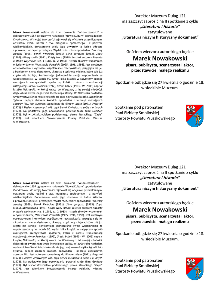 Marek Nowakowski należy do tzw. pokolenia "Współczesności" – debiutował w 1957 ogłoszonym na łamach "Nowej Kultury" opowiadaniem Kwadratowy. W swojej twórczości zajmował się oficjalnie przemilczanymi obszarami życia, ludźmi z tzw. marginesu społecznego i z peryferii wielkomiejskich. Bohaterowie wielu jego utworów to ludzie skłóceni z prawem, złodzieje i przestępcy. Wydał m.in. zbiory opowiadań: Ten stary złodziej (1958), Benek Kwiaciarz (1961), Silna gorączka (1963), Zapis (1965), Mizerykordia (1971), Książę Nocy (1978). Jest też autorem Raportu o stanie wojennym (cz. 1 1982, cz. 2 1983) i trzech zbiorów wspomnień o życiu w dawnej Warszawie Powidoki (1995, 1996, 1998). Jest uważnym obserwatorem i krytykiem współczesnej rzeczywistości, przygląda się jej z ironicznym nieraz dystansem, ukazując z tęsknotą miejsca, które dziś już często nie istnieją, konfrontując jednocześnie swoje wspomnienia ze współczesnością. W latach 90. wydał kilka książek w satyryczny sposób ukazujących rzeczywistość społeczną Polski z okresu transformacji ustrojowej: Homo Polonicus (1992), Grecki bożek (1993). W (2005) napisał książkę Nekropolis, w której wraca do Warszawy z lat swojej młodości, dając obraz ówczesnego życia literackiego stolicy. W 2009 roku nakładem wydawnictwa Świat Książki ukazała się jego najnowsza książka Syjoniści do Syjamu, będąca zbiorem krótkich opowiadań i impresji ukazujących absurdy PRL. Jest autorem scenariuszy do filmów: Meta (1971), Przystań (1971) i Siedem czerwonych róż, czyli Benek Kwiaciarz o sobie i o innych (1973). Na podstawie jego opowiadania powstał także film: Gonitwa (1971). Był współzałożycielem podziemnego pisma literackiego "Zapis" (1977). Jest członkiem Stowarzyszenia Pisarzy Polskich. Mieszka w Warszawie. Marek Nowakowski należy do tzw. pokolenia "Współczesności" – debiutował w 1957 ogłoszonym na łamach "Nowej Kultury" opowiadaniem Kwadratowy. W swojej twórczości zajmował się oficjalnie przemilczanymi obszarami życia, ludźmi z tzw. marginesu społecznego i z peryferii wielkomiejskich. Bohaterowie wielu jego utworów to ludzie skłóceni z prawem, złodzieje i przestępcy. Wydał m.in. zbiory opowiadań: Ten stary złodziej (1958), Benek Kwiaciarz (1961), Silna gorączka (1963), Zapis (1965), Mizerykordia (1971), Książę Nocy (1978). Jest też autorem Raportu o stanie wojennym (cz. 1 1982, cz. 2 1983) i trzech zbiorów wspomnień o życiu w dawnej Warszawie Powidoki (1995, 1996, 1998). Jest uważnym obserwatorem i krytykiem współczesnej rzeczywistości, przygląda się jej z ironicznym nieraz dystansem, ukazując z tęsknotą miejsca, które dziś już często nie istnieją, konfrontując jednocześnie swoje wspomnienia ze współczesnością. W latach 90. wydał kilka książek w satyryczny sposób ukazujących rzeczywistość społeczną Polski z okresu transformacji ustrojowej: Homo Polonicus (1992), Grecki bożek (1993). W (2005) napisał książkę Nekropolis, w której wraca do Warszawy z lat swojej młodości, dając obraz ówczesnego życia literackiego stolicy. W 2009 roku nakładem wydawnictwa Świat Książki ukazała się jego najnowsza książka Syjoniści do Syjamu, będąca zbiorem krótkich opowiadań i impresji ukazujących absurdy PRL. Jest autorem scenariuszy do filmów: Meta (1971), Przystań (1971) i Siedem czerwonych róż, czyli Benek Kwiaciarz o sobie i o innych (1973). Na podstawie jego opowiadania powstał także film: Gonitwa (1971). Był współzałożycielem podziemnego pisma literackiego "Zapis" (1977). Jest członkiem Stowarzyszenia Pisarzy Polskich. Mieszka w Warszawie. Dyrektor Muzeum Dulag 121 ma zaszczyt zaprosić na II spotkanie z cyklu „Literatura i Historia” zatytułowane „Literatura niczym historyczny dokument” Gościem wieczoru autorskiego będzie Marek Nowakowski pisarz, publicysta, scenarzysta i aktor, przedstawiciel małego realizmu Spotkanie odbędzie się 27 kwietnia o godzinie 18. w siedzibie Muzeum. Spotkanie pod patronatem Pani Elżbiety Smolińskiej Starosty Powiatu Pruszkowskiego Dyrektor Muzeum Dulag 121 ma zaszczyt zaprosić na II spotkanie z cyklu „Literatura i Historia” zatytułowane „Literatura niczym historyczny dokument” Gościem wieczoru autorskiego będzie Marek Nowakowski pisarz, publicysta, scenarzysta i aktor, przedstawiciel małego realizmu Spotkanie odbędzie się 27 kwietnia o godzinie 18. w siedzibie Muzeum. Spotkanie pod patronatem Pani Elżbiety Smolińskiej Starosty Powiatu Pruszkowskiego