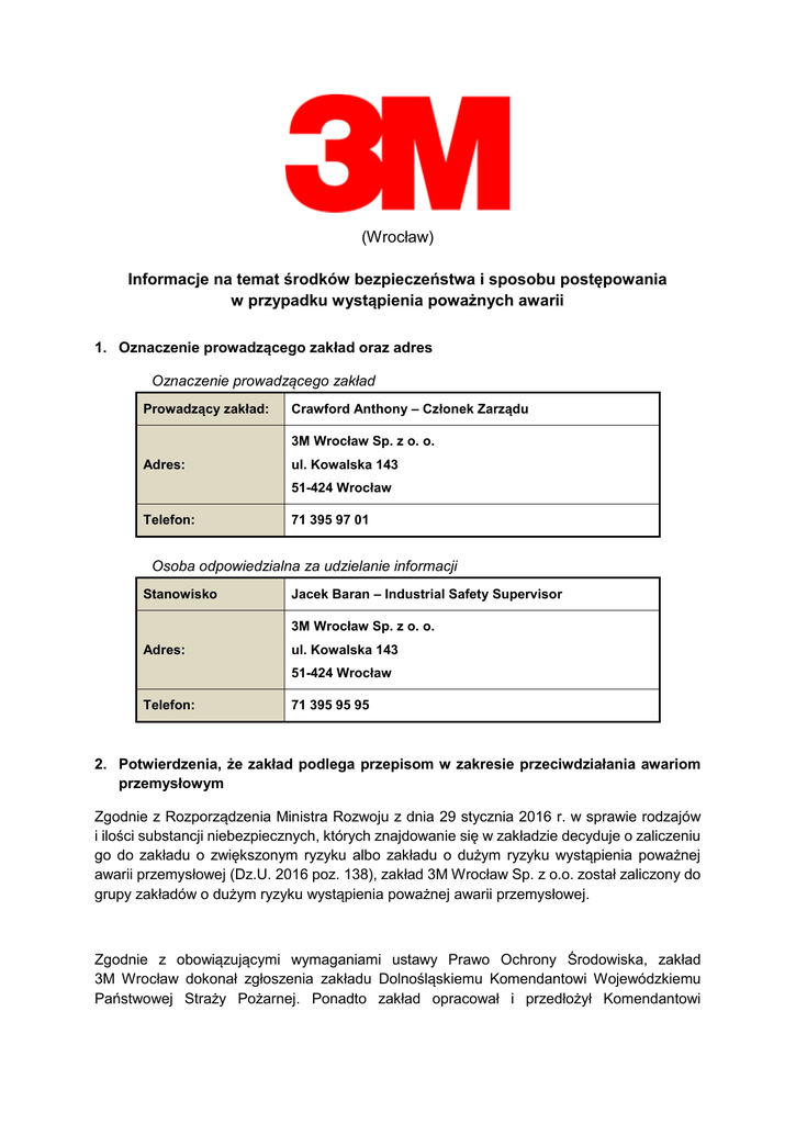 (Wrocław) Informacje na temat środków bezpieczeństwa i sposobu postępowania w przypadku wystąpienia poważnych awarii 1. Oznaczenie prowadzącego zakład oraz adres Oznaczenie prowadzącego zakład Prowadzący zakład: Crawford Anthony – Członek Zarządu 3M Wrocław Sp. z o. o. Adres: ul. Kowalska 143 51-424 Wrocław Telefon: 71 395 97 01 Osoba odpowiedzialna za udzielanie informacji Stanowisko Jacek Baran – Industrial Safety Supervisor 3M Wrocław Sp. z o. o. Adres: ul. Kowalska 143 51-424 Wrocław Telefon: 71 395 95 95 2. Potwierdzenia, że zakład podlega przepisom w zakresie przeciwdziałania awariom przemysłowym Zgodnie z Rozporządzenia Ministra Rozwoju z dnia 29 stycznia 2016 r. w sprawie rodzajów i ilości substancji niebezpiecznych, których znajdowanie się w zakładzie decyduje o zaliczeniu go do zakładu o zwiększonym ryzyku albo zakładu o dużym ryzyku wystąpienia poważnej awarii przemysłowej (Dz.U. 2016 poz. 138), zakład 3M Wrocław Sp. z o.o. został zaliczony do grupy zakładów o dużym ryzyku wystąpienia poważnej awarii przemysłowej. Zgodnie z obowiązującymi wymaganiami ustawy Prawo Ochrony Środowiska, zakład 3M Wrocław dokonał zgłoszenia zakładu Dolnośląskiemu Komendantowi Wojewódzkiemu Państwowej Straży Pożarnej. Ponadto zakład opracował i przedłożył Komendantowi Wojewódzkiemu Państwowej Straży Pożarnej oraz Wojewódzkiemu Inspektorowi Ochrony Środowiska we Wrocławiu Program Zapobiegania Awariom oraz Raport o Bezpieczeństwie. Dokumenty te zostały zatwierdzone przez Komendanta Wojewódzkiego Państwowej Straży Pożarnej. Stanowi to potwierdzenie realizacji wszystkich obowiązków zakładu o dużym ryzyku wystąpienia poważnej awarii przemysłowej. 3. Opis działalności prowadzonej w zakładzie 3M jest firmą reprezentującą wiele różnych dziedzin techniki, prowadzącą działalność produkcyjno-handlową w skali całego świata w sześciu sektorach produktowych: produkty biurowe i konsumenckie, bezpieczeństwo, ochrona i zabezpieczenia, reklama wizualna i materiały odblaskowe, przemysł i transport, energetyka i telekomunikacja. 3M jest przedsiębiorstwem o światowym zasięgu, charakteryzującym się wysokim stopniem wewnętrznej współpracy w obszarze badań, produkcji oraz marketingu. W zakładzie 3M Wrocław Sp. z o.o. wydzielić można pięć istniejących instalacji zwanych dalej zakładami: IATD - Zakład Produkcji Taśm Przemysłowych i Aerozoli; ACTD - Zakład Produkcji Klejów Strukturalnych i Taśm Ochronnych; PSD – Zakład Produkcji Sprzętu BHP; AD – Zakład produkcji osprzętu motoryzacyjnego; PI – Zakład produkcji osprzętu filtracyjnego. 4. Charakterystyka składowanych substancji niebezpiecznych W 3M Wrocław Sp. z o. o. stosowane i wytwarzane są niebezpieczne substancje i mieszaniny chemiczne, w tym m.in.: Akrylan izooktylu i kwas akrylowy (acrylic acid), propan, butan czy gotowe produkty 3M np. kleje w postaci aerozoli. Substancje te mogą stwarzać zagrożenie dla zdrowia (właściwości toksyczne, szkodliwe), zagrożenia pożarowe (właściwości wybuchowe czy palne) oraz zagrożenia dla środowiska. Na terenie zakładu 3M Wroclaw stosowane i wytwarzane są również inne niebezpieczne substancje chemiczne, stanowiące mniejsze zagrożenie. Charakterystyka głównych substancji i mieszanin niebezpiecznych decydujących o zaliczeniu zakładu 3M Wrocław Sp. z o.o. do zakładu o dużym ryzyku: LP Nazwa substancji i mieszaniny niebezpiecznej Kategoria zagrożenia Akrylan izooktylu Eye Irrit. 2 H319 Skin Irrit. 2 H315 STOT SE 3 H335 Aquatic Chronic 1 H410 2. Kwas akrylowy (acrylic acid) Flam Liq. 1, H226 Skin Corr 1A, H314 Aquatic Acute 1, H400 Acute Tox. 4, H302 Acute Tox. 4, H312 Acute Tox. 4, H332 3. Propan Flam. Gas 1, H220 Press. Gas, H280 4. Butan Flam. Gas. 1, H220 Press. Gas, H280 5. DME (eter dimetylowy) Flam. Gas 1, H220; Press. Gas, H280 6. Toluen Flam. Liq. 2, H225 Skin Irrit. 2, H315 Repr. 2, H361d STOT SE 3, H336 STOT RE 2, H373 Asp. Tox. 1, H304 7. MEK Flam. Liq. 2, H225 Eye Irrit 2, H319 STOT SE 3, H336 Cykloheksan Flam. Liq. 2, H225 Asp. Tox. 1, H304 Aquatic Chronic 1, H410 Skin Irrit. 2, H315 STOT SE 3, H336 1. 8. Zwroty wskazujące rodzaj zagrożenia Działa drażniąco na oczy. Działa drażniąco na skórę. Może powodować podrażnienie dróg oddechowych. Działa bardzo toksycznie na organizmy wodne, powodując długotrwałe skutki. Łatwopalna ciecz i pary. Powoduje poważne oparzenia skóry oraz uszkodzenia oczu. Działa szkodliwie po połknięciu. Działa szkodliwie w kontakcie ze skórą. Działa szkodliwie w następstwie wdychania. Skrajnie łatwopalny gaz. Zawiera gaz pod ciśnieniem; ogrzanie grozi wybuchem. Skrajnie łatwopalny gaz. Zawiera gaz pod ciśnieniem; ogrzanie grozi wybuchem. Skrajnie łatwopalny gaz. Zawiera gaz pod ciśnieniem; ogrzanie grozi wybuchem. Wysoce łatwopalna ciecz i pary. Działa drażniąco na skórę. Podejrzewa się, że działa szkodliwie na dziecko w łonie matki. Może wywoływać uczucie senności lub zawroty głowy. Może powodować uszkodzenie narządów poprzez długotrwałe lub wielokrotne narażenie. Połknięcie i dostanie się przez drogi oddechowe może grozić śmiercią. Wysoce łatwopalna ciecz i pary. Działa drażniąco na oczy. Może wywoływać uczucie senności lub zawroty głowy. Wysoce łatwopalna ciecz i pary. Połknięcie i dostanie się przez drogi oddechowe może grozić śmiercią. Działa bardzo toksycznie na organizmy wodne, powodując długotrwałe skutki. Działa drażniąco na skórę. Może wywoływać uczucie senności lub zawroty głowy. LP Nazwa substancji i mieszaniny niebezpiecznej Kategoria zagrożenia 9. Aceton techniczny Eye Irrit 2, H319 STOT SE 3, H336 Flam . Liq. 2, H225 10 3M(TM) Spray 74 Foam Adhesive Flam. Aerosol 1, H222, Eye Irrit. 1, H318 STOT SE 3, H336 Aquatic Chronic 2, H411 3M(TM) SprayMount(TM) Adhesive Flam. Aerosol 1, H222 Eye Irrit. 2, H319 Skin Irrit. 2, H315 STOT SE 3, H