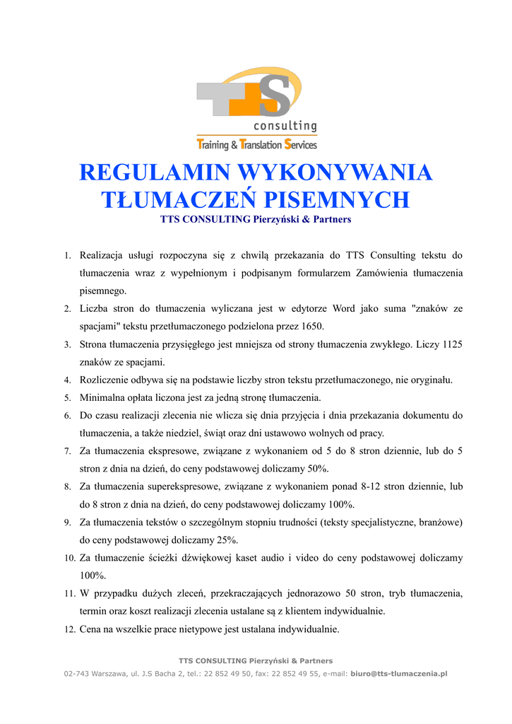 REGULAMIN WYKONYWANIA TŁUMACZEŃ PISEMNYCH TTS CONSULTING Pierzyński & Partners 1. Realizacja usługi rozpoczyna się z chwilą przekazania do TTS Consulting tekstu do tłumaczenia wraz z wypełnionym i podpisanym formularzem Zamówienia tłumaczenia pisemnego. 2. Liczba stron do tłumaczenia wyliczana jest w edytorze Word jako suma "znaków ze spacjami" tekstu przetłumaczonego podzielona przez 1650. 3. Strona tłumaczenia przysięgłego jest mniejsza od strony tłumaczenia zwykłego. Liczy 1125 znaków ze spacjami. 4. Rozliczenie odbywa się na podstawie liczby stron tekstu przetłumaczonego, nie oryginału. 5. Minimalna opłata liczona jest za jedną stronę tłumaczenia. 6. Do czasu realizacji zlecenia nie wlicza się dnia przyjęcia i dnia przekazania dokumentu do tłumaczenia, a także niedziel, świąt oraz dni ustawowo wolnych od pracy. 7. Za tłumaczenia ekspresowe, związane z wykonaniem od 5 do 8 stron dziennie, lub do 5 stron z dnia na dzień, do ceny podstawowej doliczamy 50%. 8. Za tłumaczenia superekspresowe, związane z wykonaniem ponad 8-12 stron dziennie, lub do 8 stron z dnia na dzień, do ceny podstawowej doliczamy 100%. 9. Za tłumaczenia tekstów o szczególnym stopniu trudności (teksty specjalistyczne, branżowe) do ceny podstawowej doliczamy 25%. 10. Za tłumaczenie ścieżki dźwiękowej kaset audio i video do ceny podstawowej doliczamy 100%. 11. W przypadku dużych zleceń, przekraczających jednorazowo 50 stron, tryb tłumaczenia, termin oraz koszt realizacji zlecenia ustalane są z klientem indywidualnie. 12. Cena na wszelkie prace nietypowe jest ustalana indywidualnie. TTS CONSULTING Pierzyński & Partners 02-743 Warszawa, ul. J.S Bacha 2, tel.: 22 852 49 50, fax: 22 852 49 55, e-mail: [email protected] 13. W przypadku tekstów przeznaczonych do publikacji zakłada się, że Klient dokona redakcji i korekty tekstu we własnym zakresie, o ile nie zlecił takiej usługi TTS Consulting. 14. Wszystkie dostarczone przez Klienta dokumenty oraz ich tłumaczenia objęte są poufnością. Poufność obowiązuje zarówno TTS Consulting, jak i wykonujących przekład tłumaczy. 15. W razie wycofania zlecenia na tłumaczenie pisemne, Klient jest zobowiązany do zapłaty za wykonaną już część pracy wg ceny uzgodnionej przy zlecaniu usługi. 16. Klient ma prawo zgłosić reklamację wykonanej usługi (z wyraźnym wskazaniem miejsc w tekście, do których Klient ma zastrzeżenia) do trzech dni po otrzymaniu przetłumaczonego tekstu. Reklamacja musi być zgłoszona w formie pisemnej. W przypadku reklamacji uzasadnionych, TTS Consulting zobowiązuje się - w terminie 3 dni roboczych - do ponownej nieodpłatnej weryfikacji i korekty tekstu tłumaczenia. 17. Tłumaczenia wykonywane w trybie ekspresowym lub superekspresowym nie podlegają reklamacji. TTS CONSULTING Pierzyński & Partners 02-743 Warszawa, ul. J.S Bacha 2, tel.: 22 852 49 50, fax: 22 852 49 55, e-mail: [email protected]