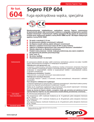 Zaprawy fugowe i fugi Nr kat. 604 Sopro FEP 604 Fuga epoksydowa wąska, specjalna Wysokowytrzymała, trójskładnikowa, epoksydowa zaprawa fugowa, przeznaczona do spoinowania płytek i płyt ceramicznych, zwłaszcza w przypadku występowania wysokich obciążeń chemicznych i mechanicznych. Spełnia wymagania RG dla zapraw do spoinowania na bazie żywic reaktywnych zgodnie z normą PN-EN 13888 oraz R2 T dla klejów reaktywnych zgodnie z normą PN-EN 12004. Do spoin o szerokości 2-12 mm Do spoinowania okładzin ceramicznych i szklanych Do klejenia mozaiki szklanej, płytek szklanych i ceramicznych Mieszana z piaskiem kwarcowym Sopro QS 507 na placu budowy Odporna na działanie agresywnych wód, naturalnych tłuszczów i chemikaliów* Wysoka odporność na obciążenia mechaniczne Produkt można stosować metodą tradycyjną (szlamową), przy użyciu urządzenia do fugowania lub pistoletu pneumatycznego Kolor: szary 15 Na ściany i podłogi W pomieszczeniach i na zewnątrz Zastosowanie 01.16 Czas użycia Do spoinowania okładzin jak płyty i płytki ceramiczne, kamionkowe, gresowe oraz płyty i kształtki łupane. Rekomendowana szczególnie w następujących przypadkach: Oddziaływanie wód agresywnych, np.: w basenach z wodą termalną, mineralną, solankową i morską; w browarach, winiarniach, tłoczniach i innych zakładach, produkujących napoje; w przemyśle skórzanym, papierniczym, tekstylnym i farmaceutycznym; w oczyszczalniach, również w oczyszczalniach ścieków i neutralizatorach ścieków; w ogrodach zoologicznych Oddziaływanie chemikaliów / kwasów: w laboratoriach, w przemyśle chemicznym i akumulatorowniach Oddziaływanie naturalnych tłuszczów: w przemyśle mięsnym i rybnym, w kuchniach, również przemysłowych, mleczarniach i zakładach serowarskich Duże obciążenia i oddziaływania wypłukujące: w basenach kąpielowych ze sztuczną falą, w pralniach przemysłowych i zbiornikach ścieków przemysłowych oraz myjniach samochodowych; na balkonach i tarasach. Nadaje się do uzupełniania wypłukanych fug cementowych przy pracach naprawczych i renowacyjnych oraz fugowania płytek układanych metodą wibracyjną. Nadaje się również do klejenia okładzin, szczególnie wtedy, gdy potrzebna jest jednakowa barwa zaprawy klejowej i fugowej np. przy zastosowaniu mozaiki szklanej, porcelanowej i ceramicznej. Ok. 40 minut przy temperaturze +20°C Czas utwardzania Przy temperaturze +20°C: możliwość chodzenia po ok. 16 godzinach; pełne obciążenie chemiczne po ok. 7 dniach. Przy temperaturze +10°C: możliwość chodzenia po ok. 48 godzinach; pełne obciążenie chemiczne po ok. 14 dniach. Jako zaprawa klejowa: możliwość chodzenia po ok. 24 godzinach; pełne obciążenie chemiczne po ok. 2 dniach Szerokość spoiny 2 – 12 mm * Prosimy zapoznać się z Tabelą odporności chemicznej produktu, dostępną na www.sopro.pl! www.sopro.pl Minimalna głębokość spoiny 2 – 3 mm Temperatura stosowania Od +10°C jako zaprawa fugowa; od +15°C jako zaprawa klejowa (przy użyciu produktu jako zaprawy klejowej temperatura nie powinna spaść poniżej +12°C przez co najmniej 48 godzin) Zużycie Głębokość fugi (mm) x szerokość fugi (mm) x łączna długość fugi na m2 (m) x gęstość 1,6 = zużycie w g/m2; ok. 2 kg/m2 przy płytkach formatu 11,5x24 cm i głębokości szczeliny 10 mm (łącznie z piaskiem kwarcowym). Ok. 2 kg/m2 przy klejeniu i fugowaniu mozaiki szklanej itp. (łącznie z piaskiem kwarcowym). Składowanie W zamkniętym, oryginalnym opakowaniu, w chłodnym, suchym miejscu, 6 miesięcy od daty produkcji. Aby uzyskać optymalną konsystencję i zapewnić właściwy przebieg reakcji chemicznej temperatura zaprawy podczas obróbki powinna wynosić ok. +20°C. Opakowania Składnik A – wiadro 2,25 kg (4 szt. w kartonie) Składnik B – wiadro 3,25 kg (4 szt. w kartonie) Właściwości Przygotowanie podłoża przed fugowaniem Rozpoczęcie spoinowania Sposób użycia Sopro FEP 604 jest trójskładnikową, wysokowytrzymałą zaprawą fugową, a także klejową, na bazie żywicy epoksydowej, którą przygotowuje się bezpośrednio przed użyciem poprzez zmieszanie składnika pigmentowanego, utwardzacza oraz piasku kwarcowego Sopro QS 507. Spełnia wymagania normy PN-EN 13888 w zakresie kryteriów określających parametry zapraw do spoinowania na bazie żywic reaktywnych klasy RG oraz normy PN-EN 12004 dla klejów na bazie żywic reaktywnych klasy R2 T. Daje się łatwo rozprowadzić i zmywać. Po utwardzeniu jest odporna na działanie agresywnych wód, naturalnych tłuszczów, chemikaliów*, obciążenia mechaniczne, zmienne cykle zamrażania i rozmrażania oraz temperaturę do +60°C. Sopro FEP 604 zalecana jest do profesjonalnego spoinowania powierzchni ścian i podłóg, przy wykonywaniu prac budowlanych. Przestrzenie pomiędzy płytkami, przed stwardnieniem zaprawy klejowej, należy dokładnie oczyścić. Spód i powierzchnie boczne szczeliny fugowej powinny być suche i pozbawione pyłu, zatłuszczeń, olejów, pozostałości zapraw i klejów. Podczas klejenia należy unikać pozostawiania pustych przestrzeni pod okładziną. W zależności od rodzaju zastosowanej zaprawy klejowej, spoinowanie fugą epoksydową Sopro FEP 604 można rozpocząć najwcześniej po ok. 24 godzinach od zakończenia klejenia epoksydową zaprawą klejową Sopro DBE 500, ewentualnie po związaniu kleju poliuretanowego Sopro PUK 503 lub cementowych zapraw klejowych, jednak nie wcześniej niż po 24 godzinach od zakończenia klejenia (szczegółowe informacje znajdują się w kartach technicznych tych produktów, dostępnych na www.sopro.pl). W obszarze zewnętrznym nie stosować przy bezpośrednim nasłonecznieniu. Podany czas obróbki uzależniony jest od warunków otoczenia (temperatury i wilgotności powietrza). Aby po związaniu uzyskać zaprawę o nominalnych parametrach należy połączyć ze sobą składniki A i B fugi epoksydowej Sopro FEP 604 i wymieszać w takich prop