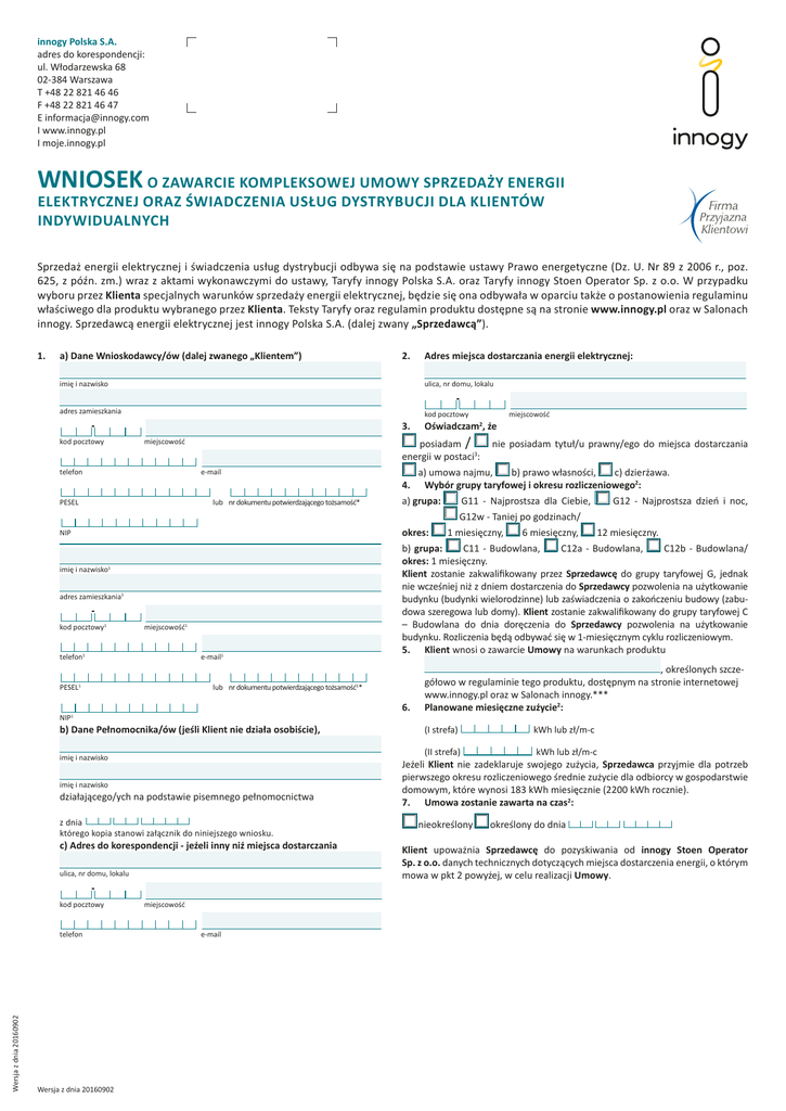 innogy Polska S.A. adres do korespondencji: ul. Włodarzewska 68 02-384 Warszawa T +48 22 821 46 46 F +48 22 821 46 47 E [email protected] I www.innogy.pl I moje.innogy.pl WNIOSEK O ZAWARCIE KOMPLEKSOWEJ UMOWY SPRZEDAŻY ENERGII ELEKTRYCZNEJ ORAZ ŚWIADCZENIA USŁUG DYSTRYBUCJI DLA KLIENTÓW INDYWIDUALNYCH Sprzedaż energii elektrycznej i świadczenia usług dystrybucji odbywa się na podstawie ustawy Prawo energetyczne (Dz. U. Nr 89 z 2006 r., poz. 625, z późn. zm.) wraz z aktami wykonawczymi do ustawy, Taryfy innogy Polska S.A. oraz Taryfy innogy Stoen Operator Sp. z o.o. W przypadku wyboru przez Klienta specjalnych warunków sprzedaży energii elektrycznej, będzie się ona odbywała w oparciu także o postanowienia regulaminu właściwego dla produktu wybranego przez Klienta. Teksty Taryfy oraz regulamin produktu dostępne są na stronie www.innogy.pl oraz w Salonach innogy. Sprzedawcą energii elektrycznej jest innogy Polska S.A. (dalej zwany „Sprzedawcą”). 1. a) Dane Wnioskodawcy/ów (dalej zwanego „Klientem”) imię i nazwisko adres zamieszkania 3. kod pocztowy telefon e-mail PESEL Wersja z dnia 20160902 Adres miejsca dostarczania energii elektrycznej: ulica, nr domu, lokalu kod pocztowy Oświadczam2, że posiadam / energii w postaci3: miejscowość lub nr dokumentu potwierdzającego tożsamość* 4. miejscowość nie posiadam tytuł/u prawny/ego do miejsca dostarczania a) umowa najmu, b) prawo własności, c) dzierżawa. Wybór grupy taryfowej i okresu rozliczeniowego2: a) grupa: G11 - Najprostsza dla Ciebie, G12 - Najprostsza dzień i noc, G12w - Taniej po godzinach/ okres: NIP imię i nazwisko1 adres zamieszkania1 kod pocztowy1 miejscowość1 telefon1 e-mail1 b) Dane Pełnomocnika/ów (jeśli Klient nie działa osobiście), imię i nazwisko imię i nazwisko z dnia którego kopia stanowi załącznik do niniejszego wniosku. c) Adres do korespondencji - jeżeli inny niż miejsca dostarczania ulica, nr domu, lokalu kod pocztowy telefon Wersja z dnia 20160902 miejscowość e-mail 6 miesięczny, 12 miesięczny. 6. , określonych szczegółowo w regulaminie tego produktu, dostępnym na stronie internetowej www.innogy.pl oraz w Salonach innogy.*** Planowane miesięczne zużycie2: (I strefa) kWh lub zł/m-c (II strefa) kWh lub zł/m-c lub nr dokumentu potwierdzającego tożsamość1* NIP1 1 miesięczny, C11 - Budowlana, C12a - Budowlana, C12b - Budowlana/ b) grupa: okres: 1 miesięczny. Klient zostanie zakwalifikowany przez Sprzedawcę do grupy taryfowej G, jednak nie wcześniej niż z dniem dostarczenia do Sprzedawcy pozwolenia na użytkowanie budynku (budynki wielorodzinne) lub zaświadczenia o zakończeniu budowy (zabudowa szeregowa lub domy). Klient zostanie zakwalifikowany do grupy taryfowej C – Budowlana do dnia doręczenia do Sprzedawcy pozwolenia na użytkowanie budynku. Rozliczenia będą odbywać się w 1-miesięcznym cyklu rozliczeniowym. 5. Klient wnosi o zawarcie Umowy na warunkach produktu PESEL1 działającego/ych na podstawie pisemnego pełnomocnictwa 2. Jeżeli Klient nie zadeklaruje swojego zużycia, Sprzedawca przyjmie dla potrzeb pierwszego okresu rozliczeniowego średnie zużycie dla odbiorcy w gospodarstwie domowym, które wynosi 183 kWh miesięcznie (2200 kWh rocznie). 7. Umowa zostanie zawarta na czas2: nieokreślony określony do dnia Klient upoważnia Sprzedawcę do pozyskiwania od innogy Stoen Operator Sp. z o.o. danych technicznych dotyczących miejsca dostarczenia energii, o którym mowa w pkt 2 powyżej, w celu realizacji Umowy. Zgodnie z art. 24 ust. 1 ustawy z dnia 29 sierpnia 1997 r. o ochronie danych osobowych (tekst jedn. Dz. U. 2016, poz. 922. z późn. zm.) informujemy, że innogy Polska S.A. z siedzibą w Warszawie ul. Wybrzeże Kościuszkowskie 41 jest administratorem danych. Dane osobowe zbierane są w celu zawarcia i wykonania umowy sprzedaży energii elektrycznej i świadczenia usług dystrybucji oraz mogą być udostępniane innym podmiotom w celu realizacji umowy. Klientowi przysługuje prawo dostępu do treści swoich danych oraz ich poprawiania. Podanie danych osobowych jest niezbędne do zawarcia i realizacji Umowy, których przetwarzanie odbywa się zgodnie z przepisami prawa (ustawa z dnia 10 kwietnia 1997 r. - Prawo energetyczne (tekst jednolity: Dz.U. z 2006 r Nr 89, poz. 625, z późn. zm.) Do niniejszego wniosku należy załączyć: ▪▪Oświadczenie o wskazaniach licznika energii elektrycznej na dzień przekazania/przejęcia lokalu lub protokół zdawczo-odbiorczy – dotyczy zakupu/przejęcia lokalu, do którego dostarczana jest energia elektryczna (jeśli protokół nie został dostarczony wcześniej). Na podstawie podanych informacji zostanie przygotowana umowa kompleksowa sprzedaży energii elektrycznej i świadczenia usług dystrybucji, która zostanie wysłana na adres miejsca dostarczania energii elektrycznej, chyba że Klient wskazał inny. Warunkiem koniecznym do rozpoczęcia sprzedaży energii elektrycznej jest techniczna możliwość zasilania budynku przez innogy Stoen Operator Sp. z o.o., w którym znajduje się lokal, o którym mowa w pkt 2 Wniosku. Rozpoczęcie dostarczania energii elektrycznej do lokalu nastąpi w ciągu 14 dni od daty doręczenia do Sprzedawcy podpisanego egzemplarza kompleksowej umowy sprzedaży energii elektrycznej i świadczenia usług dystrybucji**. Warunkiem zawarcia przedmiotowej umowy jest brak wiążącej umowy sprzedaży energii elektrycznej zawartej z innym podmiotem dla miejsca dostarczania wskazanego w pkt 2 Wniosku. Wszelkie dodatkowe informacje można uzyskać na stronach internetowych www.innogy.pl lub pisząc e-mail na adres [email protected]. Zapraszamy również do kontaktu pod nr telefonu +48 22 821-46-46 oraz w Salonach innogy. PODPISY WNIOSKODAWCY/ÓW DATA. . . . . . . . . . . . . . . . . WNIOSKODAWCA. . . . . . . . . . . . . . . . . . . . . . . . . . . . . . . . . DATA. . . . . . . . . . . . . . . . . WNIOSKODAWCA1. . . . . . . . . . . . . . . . . . . . . . . . . .