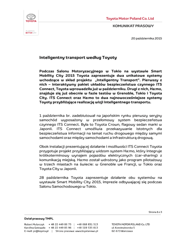20 października 2015 Inteligentny transport według Toyoty Podczas Salonu Motoryzacyjnego w Tokio na wystawie Smart Mobility City 2015 Toyota zaprezentuje dwa unikatowe systemy wchodzące w skład projektu „Inteligentny Transport”. Pierwszy z nich – interaktywny pakiet układów bezpieczeństwa czynnego ITS Connect, Toyota wprowadziła już w październiku. Drugi z nich, Ha:mo, znajduje się już obecnie w fazie testów w Grenoble, Tokio i Toyota City. ITS Connect oraz Ha:mo to dwa najnowocześniejsze systemy Toyoty przybliżające realizację wizji inteligentnego transportu. 1 października br. zadebiutował na japońskim rynku pierwszy seryjny samochód wyposażony w przełomowy system bezpieczeństwa czynnego ITS Connect. Była to Toyota Crown, flagowy sedan marki w Japonii. ITS Connect umożliwia przekazywanie istotnych dla bezpieczeństwa informacji na temat ruchu drogowego między samymi samochodami oraz między samochodami a infrastrukturą drogową. Obok instalacji prezentującej działanie i możliwości ITS Connect Toyota przygotuje projekt przybliżający widzom system Ha:mo, który integruje krótkoterminowy wynajem pojazdów elektrycznych (car-sharing) z komunikacją miejską. Ha:mo został wdrożony jako program pilotażowy w trzech miastach na świecie: w Grenoble we Francji, w Tokio oraz Toyota City w Japonii. 28 października Toyota zaprezentuje działanie obu systemów na wystawie Smart Mobility City 2015, imprezie odbywającej się podczas Salonu Samochodowego w Tokio. Strona 1 z 3 ITS Connect – wyższy poziom łączności System bezpieczeństwa czynnego ITS Connect Toyoty wykorzystuje komunikację między samochodami (V2V, vehicle-to-vehicle) oraz między samochodami i infrastrukturą drogową (V2I, vehicle-toinfrastructure), aby dostarczać kierowcy istotne dla bezpieczeństwa informacje o sytuacji na drodze, których nie wychwycą zainstalowane w samochodzie czujniki. Podczas wystawy Smart Mobility City, na stoisku Toyoty widzowie będą mogli zapoznać się szczegółowo z działaniem czujników służących do wykrywania pojazdów i pieszych oraz nadajników i odbiorników do zdalnego przesyłania informacji. Należą do nich zarówno urządzenia montowane w samochodach, jak i przy skrzyżowaniach. Na szczególną uwagę zasługuje złożony układ zapobiegania zderzeniom podczas skrętu w lewo, który monitoruje ruch zbliżających się do skrzyżowania pojazdów i pieszych. W razie niebezpieczeństwa kolizji system ostrzega kierowcę sygnałem świetlnym i dźwiękowym. Ostrzeżenie uruchamia się, gdy kierowca zdejmie nogę z pedału hamulca i rusza, a system rejestruje potencjalne przeszkody. System ostrzega także o zbliżającym się samochodzie uprzywilejowanym oraz o czerwonym świetle. Zaawansowana technologia ITS przenosi na wyższy poziom funkcję aktywnego tempomatu. Stała komunikacja pomiędzy pojazdami pozwala precyzyjnie regulować prędkość auta, dostosowując ją do zachowania otaczających go samochodów. Pierwszym modelem wyposażonym w ITS Connect jest nowa generacja flagowej limuzyny Crown. W grudniu br. system ukaże się w Japonii wraz z dwoma kolejnymi modelami marki. Jednym z nich będzie Prius czwartej generacji. Najpopularniejsza hybryda na świecie posłuży do demonstracji ITS Connect na wystawie podczas targów w Tokio. Ha:mo – miasto bez ograniczeń Innowacyjny program Ha:mo integruje komunikację miejską z systemem wynajmu krótkoterminowego (car-sharingiem) małych pojazdów Strona 2 z 3 elektrycznych. Toyota wykorzystuje do tego celu dwa mikrosamochody – innowacyjny trójkołowy i-Road i czterokołowy COMS. Ha:mo to odpowiedź Toyoty na problem braku płynności ruchu w miastach oraz niewystarczającej liczby miejsc do parkowania. Możliwość wynajmu mikrosamochodu na minuty zwiększa mobilność mieszkańców i przyjezdnych, umożliwiając wygodne dotarcie do celu wszędzie tam, gdzie nie można łatwo dojechać komunikacją miejską. Takie rozwiązanie rewitalizuje dzielnice miast słabiej skomunikowane z centrum oraz pozwala ograniczyć zanieczyszczenie powietrza. Toyota testuje funkcjonowanie Ha:mo w Toyota City w Japonii od października 2012, w Grenoble we Francji od października 2014 oraz w Tokio od kwietnia 2015. Podczas wystawy Smart Mobility City Toyota zaprezentuje elektryczny pojazd COMS oraz dwa systemy oparte na Ha:mo. Pierwszy z nich to pilotażowy system działający w Tokio. Drugi został zaprojektowany z myślą o rejonach turystycznych. Na specjalnym wyświetlaczu zostanie zaprezentowana przejażdżka pojazdem COMS do przykładowej atrakcji turystycznej i z powrotem, przy wsparciu automatycznego przewodnika z nawigacją. Agent Ha:mo – przyszłość car-sharingu Na wystawie w Tokio Toyota zaprezentuje także efekty prowadzonych przez siebie prac rozwojowych nad systemem Ha:mo. Prototypowy Agent Ha:mo to system nawigacji wykorzystujący zaawansowane rozwiązania w dziedzinie automatycznej identyfikacji użytkownika i rozpoznawania głosu. Urządzenie wyświetla informacje na przedniej szybie pojazdu przy pomocy dużego wyświetlacza HUD (Heads-up Display). Salon Samochodowy w Tokio rozpocznie się 28 października i potrwa do 8 listopada. Dni prasowe odbędą się od 28 do 29 października. Targi będą otwarte dla publiczności od 30 października. Więcej informacji znajduje się na http://www.tokyo-motorshow.com/en/. Strona 3 z 3