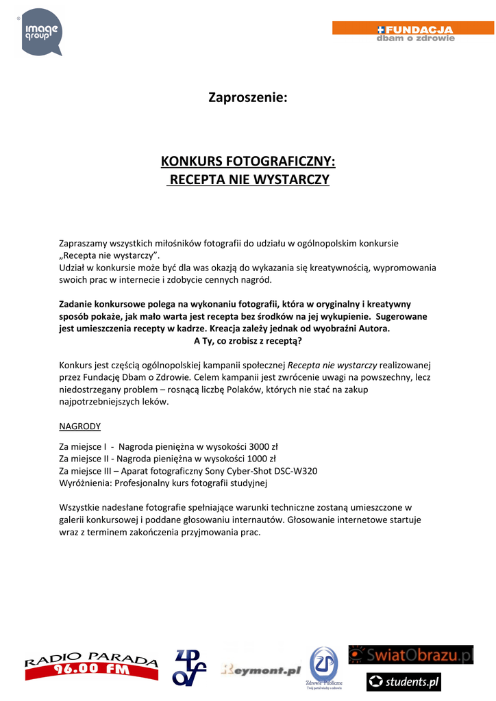 Zaproszenie: KONKURS FOTOGRAFICZNY: RECEPTA NIE WYSTARCZY Zapraszamy wszystkich miłośników fotografii do udziału w ogólnopolskim konkursie „Recepta nie wystarczy”. Udział w konkursie może być dla was okazją do wykazania się kreatywnością, wypromowania swoich prac w internecie i zdobycie cennych nagród. Zadanie konkursowe polega na wykonaniu fotografii, która w oryginalny i kreatywny sposób pokaże, jak mało warta jest recepta bez środków na jej wykupienie. Sugerowane jest umieszczenia recepty w kadrze. Kreacja zależy jednak od wyobraźni Autora. A Ty, co zrobisz z receptą? Konkurs jest częścią ogólnopolskiej kampanii społecznej Recepta nie wystarczy realizowanej przez Fundację Dbam o Zdrowie. Celem kampanii jest zwrócenie uwagi na powszechny, lecz niedostrzegany problem – rosnącą liczbę Polaków, których nie stać na zakup najpotrzebniejszych leków. NAGRODY Za miejsce I - Nagroda pieniężna w wysokości 3000 zł Za miejsce II - Nagroda pieniężna w wysokości 1000 zł Za miejsce III – Aparat fotograficzny Sony Cyber-Shot DSC-W320 Wyróżnienia: Profesjonalny kurs fotografii studyjnej Wszystkie nadesłane fotografie spełniające warunki techniczne zostaną umieszczone w galerii konkursowej i poddane głosowaniu internautów. Głosowanie internetowe startuje wraz z terminem zakończenia przyjmowania prac. Warunki techniczne: 1. Fotografie powinny obrazować hasło „Recepta nie wystarczy”. Sugerowane jest wykorzystanie na zdjęciu druku recepty. 2. Zdjęcie do konkursu przesłać można tylko w formie plików cyfrowych. 3. Zgłoszone do Konkursu fotografie muszą być zapisane w formacie plików JPEG. Wielkość pliku nie gra roli, o ile da się go przesłać e-mailem. 4. Długość krótszego boku zdjęcia powinno wynosić min. 2000 pixeli. Rozdzielczość zdjęć nie może być mniejsza niż 240 dpi. Wszystkie nagrodzone prace zostaną wystawione w łódzkiej galerii – Cafe Foto 102, oraz opublikowane na portalach internetowych patronów medialnych konkursu. Dwadzieścia najwyżej ocenionych prac zostanie także pokazanych w Galerii Piotra Uznańskiego na ulicy Piotrkowskiej 31 w Łodzi. Prace, wraz z wypełnionym formularzem rejestracyjnym ( znajdą go Państwo w załączniku „formularz” a także na stronie www.receptaniewystarczy.pl) można wysyłać od 15.03 do 30.04.2010 r. na adres: [email protected] Regulamin konkursu znajdą Państwo w załączniku maila, a także na stronie internetowej akcji. Więcej informacji na stronie: www.receptaniewystarczy.pl