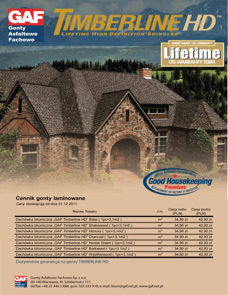 Cennik gonty laminowane Ceny obowiązują od dnia 01.12.2011 Nazwa Towaru Dachówka bitumiczna „GAF Timberline HD” Slate ( 1pc=3,1m2 ) J.m. Cena netto (PLN) Cena brutto (PLN) m2 34,90 zł 42,93 zł m 2 34,90 zł 42,93 zł m 2 34,90 zł 42,93 zł Dachówka bitumiczna „GAF Timberline HD” Charcoal ( 1pc=3,1m2 ) m 2 34,90 zł 42,93 zł Dachówka bitumiczna „GAF Timberline HD” Hunter Green ( 1pc=3,1m2 ) m2 34,90 zł 42,93 zł m 2 34,90 zł 42,93 zł m 2 34,90 zł 42,93 zł Dachówka bitumiczna „GAF Timberline HD” Shakewood ( 1pc=3,1m2 ) Dachówka bitumiczna „GAF Timberline HD” Hickory ( 1pc=3,1m2 ) Dachówka bitumiczna „GAF Timberline HD” Barkwood ( 1pc=3,1m2 ) Dachówka bitumiczna „GAF Timberline HD” Weatherwood ( 1pc=3,1m2 ) Dożywotnia gwarancja na gonty TIMBERLINE HD Gonty Asfaltowe Fachowo Sp. z o.o. 00-140 Warszawa, Al. Solidarności 117, tel/fax +48 22 440 5 888, gsm: 503 333 918, e-mail: [email protected], www.gaf.net.pl Cennik pasy kalenicowe Ceny obowiązują od dnia 01.12.2011 J.m. Cena netto (PLN) Dachówka kalenicowa „Seal A Ridge” Slate (1pc=7,6mb) mb 31,90 zł 39,24 zł Dachówka kalenicowa „Seal A Ridge” Shakewood (1pc=7,6mb) mb 31,90 zł 39,24 zł Dachówka kalenicowa „Seal A Ridge” Hickory (1pc=7,6mb) mb 31,90 zł 39,24 zł Dachówka kalenicowa „Seal A Ridge” Charcoal (1pc=7,6mb) mb 31,90 zł 39,24 zł Dachówka kalenicowa „Seal A Ridge” Hunter Green (1pc=7,6mb) mb 31,90 zł 39,24 zł Dachówka kalenicowa „Seal A Ridge” Barkwood (1pc=7,6mb) mb 31,90 zł 39,24 zł Dachówka kalenicowa „Seal A Ridge” Waetherwood (1pc=7,6mb) mb 31,90 zł 39,24 zł J.m. Cena netto (PLN) Wentylacja kalenicowa „Cobra” ( 6,1mb x 26,7cm ) mb 42,95 zł 52,83 zł Wentylacja kalenicowa „Cobra Snow Country Advanced” ( 1,22mbx29,21cm ) szt 79,95 zł 98,34 zł m 2 5,45 zł 6,70 zł m 2 9,95 zł 12,24 zł Membrana dachowa „RED BARRIER” ( 50mb x 150cm, 1rol=75,00m2 ) NOWOŚĆ m 2 6,90 zł 8,49 zł Pas startowy „Pro Start” ( 1szt=1,93mb, 1pc=19/38szt ) szt 9,95 zł 11,75 zł Wywietrznik punktowy ( brąz, zielony, grafit, czerwony, czarny, szary ) szt 58,24 zł 72,45 zł Kominek regulowany ( brąz, zielony, grafit, czerwony, czarny, szary szt 110,00 zł 135,30 zł Kominek reg. ocieplany ( brąz, zielony, grafit, czerwony, czarny, szary ) szt 178,00 zł 218,94 zł Gwoździe ocynk ogniowy skrętne ( 3,5mm x 30mm, 1pc = 5kg ) kg 12,30 zł 15,13 zł Asfaltowy uszczelniacz w tubce szt 16,80 zł 20,66 zł Asfaltowy uszczelniacz wet&dry ( 1op=3,78L ) szt 58,00 zł 71,34 zł Asfaltowy uszczelniacz wet&dry ( 1op=19L ) szt 178,00 zł 218,94 zł Nazwa Towaru Cena brutto (PLN) Cennik akcesorii Ceny obowiązują od dnia 01.12.2011 Nazwa Towaru Papa podkładowa „Shinglemate” ( 43,89mb x 91,40cm, 1rol=40,13m2 ) Membrana dachowa „Deck Armor” ( 67,67mb x 137cm, 1rol=92,80m2 ) membrana papa nawierzchniowa kos z dac howy gont bitumic zny kalenic a wentylac ja elewac ja akc es oria pas s tartowy Gonty Asfaltowe Fachowo Sp. z o.o. 00-140 Warszawa, Al. Solidarności 117, tel/fax +48 22 440 5 888, gsm: 503 333 918, e-mail: [email protected], www.gaf.net.pl Cena brutto (PLN)
