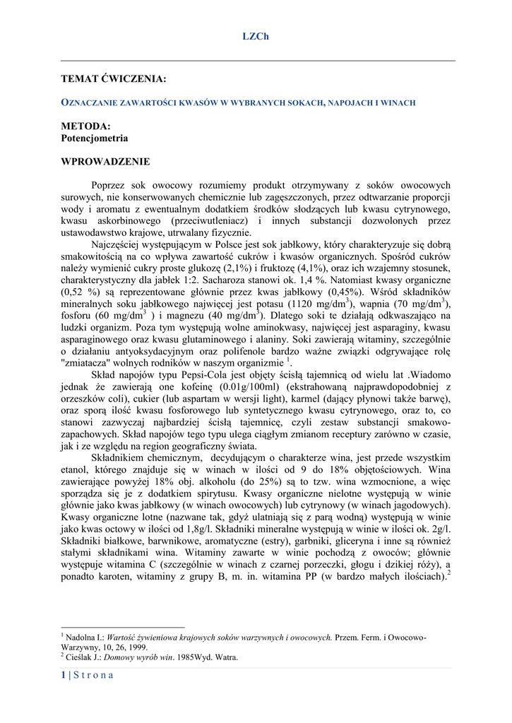 LZCh TEMAT ĆWICZENIA: OZNACZANIE ZAWARTOŚCI KWASÓW W WYBRANYCH SOKACH, NAPOJACH I WINACH METODA: Potencjometria WPROWADZENIE Poprzez sok owocowy rozumiemy produkt otrzymywany z soków owocowych surowych, nie konserwowanych chemicznie lub zagęszczonych, przez odtwarzanie proporcji wody i aromatu z ewentualnym dodatkiem środków słodzących lub kwasu cytrynowego, kwasu askorbinowego (przeciwutleniacz) i innych substancji dozwolonych przez ustawodawstwo krajowe, utrwalany fizycznie. Najczęściej występującym w Polsce jest sok jabłkowy, który charakteryzuje się dobrą smakowitością na co wpływa zawartość cukrów i kwasów organicznych. Spośród cukrów należy wymienić cukry proste glukozę (2,1%) i fruktozę (4,1%), oraz ich wzajemny stosunek, charakterystyczny dla jabłek 1:2. Sacharoza stanowi ok. 1,4 %. Natomiast kwasy organiczne (0,52 %) są reprezentowane głównie przez kwas jabłkowy (0,45%). Wśród składników mineralnych soku jabłkowego najwięcej jest potasu (1120 mg/dm3), wapnia (70 mg/dm3), fosforu (60 mg/dm3 ) i magnezu (40 mg/dm3). Dlatego soki te działają odkwaszająco na ludzki organizm. Poza tym występują wolne aminokwasy, najwięcej jest asparaginy, kwasu asparaginowego oraz kwasu glutaminowego i alaniny. Soki zawierają witaminy, szczególnie o działaniu antyoksydacyjnym oraz polifenole bardzo ważne związki odgrywające rolę "zmiatacza" wolnych rodników w naszym organizmie 1. Skład napojów typu Pepsi-Cola jest objęty ścisłą tajemnicą od wielu lat .Wiadomo jednak że zawierają one kofeinę (0.01g/100ml) (ekstrahowaną najprawdopodobniej z orzeszków coli), cukier (lub aspartam w wersji light), karmel (dający płynowi także barwę), oraz sporą ilość kwasu fosforowego lub syntetycznego kwasu cytrynowego, oraz to, co stanowi zazwyczaj najbardziej ścisłą tajemnicę, czyli zestaw substancji smakowozapachowych. Skład napojów tego typu ulega ciągłym zmianom receptury zarówno w czasie, jak i ze względu na region geograficzny świata. Składnikiem chemicznym, decydującym o charakterze wina, jest przede wszystkim etanol, którego znajduje się w winach w ilości od 9 do 18% objętościowych. Wina zawierające powyżej 18% obj. alkoholu (do 25%) są to tzw. wina wzmocnione, a więc sporządza się je z dodatkiem spirytusu. Kwasy organiczne nielotne występują w winie głównie jako kwas jabłkowy (w winach owocowych) lub cytrynowy (w winach jagodowych). Kwasy organiczne lotne (nazwane tak, gdyż ulatniają się z parą wodną) występują w winie jako kwas octowy w ilości od 1,8g/l. Składniki mineralne występują w winie w ilości ok. 2g/l. Składniki białkowe, barwnikowe, aromatyczne (estry), garbniki, gliceryna i inne są również stałymi składnikami wina. Witaminy zawarte w winie pochodzą z owoców; głównie występuje witamina C (szczególnie w winach z czarnej porzeczki, głogu i dzikiej róży), a ponadto karoten, witaminy z grupy B, m. in. witamina PP (w bardzo małych ilościach).2 1 Nadolna I.: Wartość żywieniowa krajowych soków warzywnych i owocowych. Przem. Ferm. i OwocowoWarzywny, 10, 26, 1999. 2 Cieślak J.: Domowy wyrób win. 1985Wyd. Watra. 1|Strona LZCh CEL ĆWICZENIA Poznanie podstawowych zasad pomiarów miareczkowania potencjometrycznego w trybie autonomicznym. Przeprowadzenie analizy zawartości kwasów w wybranych napojach, oraz zidentyfikowanie jaki to kwas. ODDCZYNNIKI NACZYNIA I PRZYRZĄDY - Mianowany roztwór 0,1M NaOH - Woda destylowana - Mikrotitrator - Elektroda pH (kombinowana) - Naczynko pomiarowe SPOSÓB WYKONANIA ĆWICZENIA Do naczynka pomiarowego odmierzyć zadania wydane przez prowadzacego. W przypadku: a) Coca~Cola 10ml roztworu miareczkować ustawiając 100 kroków o objętości 0,05 ml co 10 sekund. b) Soki owocowe 2ml roztworu miareczkować ustawiając 100 kroków o objętości 0,05 ml co 10 sekund. c) wina 2ml roztworu miareczkować ustawiając 100 kroków o objętości 0,05 ml co 10 sekund. Uwaga: Wyniki należy zapisać w rozszerzeniu excel xls. OPRACOWANIE WYNIKÓW - Z otrzymanej krzywej miareczkowania potencjometrycznego wyznaczyć wykres zależności E/ V od V, oraz metodą pierwszej pochodnej należy obliczyć PR miareczkowania. - Na podstawie reakcji chemicznej zachodzącej podczas miareczkowania należy wyznaczyć zawartość kwasów w analizowanej próbce [mg/l]. 2|Strona