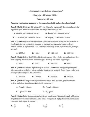 „Matematyczny skok do gimnazjum” 12 edycja - 10 lutego 2016r. Czas pracy 60 min Zadania zamknięte (zaznacz wybraną odpowiedź na karcie odpowiedzi) Zad.1. (2pkt) Dziś jest 10 lutego 2016 r. Klasa 6a licząca 30 dzieci zaplanowała wycieczkę do Krakowa za 65 dni. Jaka będzie data wyjazdu? A. Wtorek,13 kwietnia 2016r. B. Środa, 12 kwietnia 2016r. C. Czwartek, 14 kwietnia 2016r. D. Piątek, 15 kwietnia 2016r. Zad.2. (2pkt) Wychowawczyni obliczyła całkowity koszt wycieczki na 4980 zł. Jeżeli cała kwota zostanie wpłacona w następnym tygodniu biuro podróży udzieli rabatu w wysokości 15%. Jaki będzie wtedy koszt wycieczki na jednego ucznia? A. 4233zł B. 166zł C. 141,10zł D. 190,90zł Zad.3. (2pkt) Bilety do ZOO w Krakowie są po: 18zł – bilet normalny i po10złbilet ulgowy. O ile % bilet normalny jest droższy od biletu ulgowego? A. 20% B. 75% C. 44,44% D. 80% Zad.4. (2pkt) Na mapie wykonanej w skali 1 : 2 000 000 odległość pomiędzy miejscowością, w której mieszka Jaś a Krakowem wynosi 7 cm 2mm. Jaka jest rzeczywista odległość do Krakowa? A. 200 km B. 144 km C. 360 km D. 140 km Zad.5. (2pkt) W ile godzin dojedzie klasa Jasia do Krakowa, jeżeli autokar będzie jechał ze średnią prędkością 60 km/godz.? A. 2 godz. 24 min B. 2 godz. 40 min C. 1 godz. 44 min D. 2 godz. Zad.6. (2pkt) Jaś z 6a pomalował sześcian na zielono. Następnie podzielił go na 27 jednakowych sześcianików. Jaką część wszystkich będą stanowić sześcianiki z dwoma zielonymi ścianami? . B. C. D. Zad.7. (2pkt) Przechylone naczynie ma kształt prostopadłościanu. Ile mililitrów wody jest w tym naczyniu? 25 cm 60 mm 5 cm A. 150 ml B. 300 ml 1 dm C. 750 ml D. 125 ml Zad.8. (2pkt) Jaś ma obliczyć wartość wyrażenia 2 1 1 1 1 1 1 m dla m=0,5. Który wynik powinien otrzymać? A. 4 B. 2,5 C. 0,5 D.2 Zadania otwarte (zapisz wszystkie obliczenia) Zad.9. (5pkt) Uczniowie klasy 6a otrzymali ze sprawdzianu z matematyki tylko trójki, czwórki, piątki i szóstki. Czwórek było dwa razy mniej niż piątek, piątek cztery razy więcej niż trójek, a szóstek połowę ilości trójek. Wszystkich ocen było 30. Ilu uczniów otrzymało z klasówki co najmniej piątkę? Jaka była średnia ocen z tego sprawdzianu? Podaj wynik przybliżony do części setnych. Zad.10. (5pkt) Ogrodzony plac na którym znajduje się budynek szkoły Jasia jest trapezem równoramiennym. Najdłuższy bok trapezu ma długość 110 m. Trzy pozostałe boki są równe, a ich suma jest o 0,04 km większa od najdłuższego boku. W ciągu jakiego czasu dozorca idąc z prędkością 3 km/godz. obejdzie dwukrotnie plac wzdłuż całego ogrodzenia? Czy w ciągu minuty zdąży przejść jeden z najkrótszych boków? Odpowiedź uzasadnij.