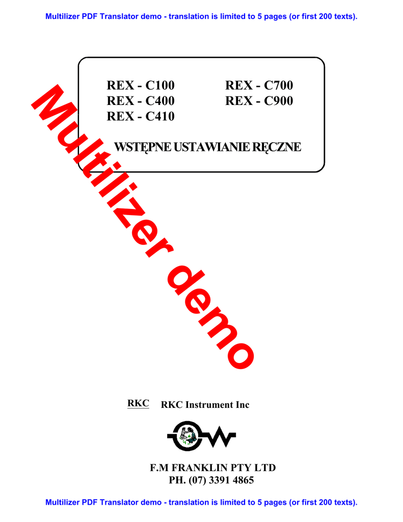 Multilizer PDF Translator demo - translation is limited to 5 pages (or first 200 texts). REX - C700 REX - C900 til ul M REX - C100 REX - C400 REX - C410 WSTĘPNE USTAWIANIE RĘCZNE em rd ize o RKC RKC Instrument Inc F.M FRANKLIN PTY LTD PH. (07) 3391 4865 Multilizer PDF Translator demo - translation is limited to 5 pages (or first 200 texts). Multilizer PDF Translator demo - translation is limited to 5 pages (or first 200 texts). Jest to podręcznik dla ustanowienia wstępnego REX-C100-, C400,-C410,-C700, dotykowy lub dostosować części innych niż wymienione w niniejszej instrukcji. Urządzenie zostało wyprodukowane i dostarczoną pod ścisłą kontrolą jakości przez nas. Jest jednak niektóre przedmiotem dręczone lub zauważyć, Twój Uprzejmie informujemy, i porady z naszym działem handlowym, najbliższego biura firmy również środek, gdzie użytkownik kupił bardzo cenimy. til ul M 1. ize 1,2 Wprowadzania początkowej trybu ustaw w......................................... 1 Opróżniaj początkowy tryb ustaw w......................................... 2 Ustawienie Opis każdego parametru....................................... 3 rd 2,1 2,2 Each parameter setting . . . . . . . . . . . . . . . . . . . . . . . . . . . . . . . . . . . . . . . . . . . . 4 (1) Typ danych wejściowych zaznaczanie ..........................................5 (2) Jednostki inżynieryjnej i chłodzenia wybór typu (3) Wybór przerwać alarmu (HBA, LBA) itd. (4) Pierwszy alarm (ALM1) wybór typu (5) Drugi wybór typ alarmu (ALM2) (6) Wyjście itp. sterowania wybór (7) Energize / rozłączy wybór alarm itp. (8) PV wychylenia wstępnego . .ustawienia . . . . . . . . . . . . . . . . . . . . . . . . . . . . . . . . . . . . . . . . . . . 13 (9) Ustawienie szczeliny różnicy działania ON / OFF (10) Ustawienie szczeliny różnicowej pierwszego alarmu (ALM1). . . . . . . . . . . . . . . . . . . . . 13 (11) Ustawienie szczeliny różniczkowe drugiego alarmu (ALM2) (12) Ustawienie wysokiej limitu dla wartości (SV) (13) Z niskim limitem ustawienie zestawu wartości (SV) . . . . . . . . . . . . . . . . . . . . . . . . . . . . . 14 .......................6 em ........................7 ..............................8 ............................9 . . . . . . . . . . . . . . . . . . . . . . . . . . . . . . . . . . 0.11 o 2.3 Strona Początkowy tryb zestawu, zmiana 1,1 2. SPIS TREŚCI . . . . . . . . . . . . . . . . . . . . . . . . . 12 . . . . . . . . . . . . . . . . . . . . . . . . 13 . . . . . . . . . . . . . . . . . . . 13 . . . . . . . . . . . . . . . . . . . . . . . . . . . . 14 Każdy kontroli parametrów. . . . . . . . . . . . . . . . . . . . . . . . . . . . . . . . . . . . . . . . . . . . . . . . . . 0.15 Multilizer PDF Translator demo - translation is limited to 5 pages (or first 200 texts). Multilizer PDF Translator demo - translation is limited to 5 pages (or first 200 texts). Mogę n i t i l s e t m o d e c h n g i n g 1,1 Wprowadzania początkowej ustawianie trybu (1) Prasa klawisz, aby ustawić zamek danych parametru symbolu na wartości mierzonej (PV) wyświetlacz. W tej chwili, najmniej znaczące cyfry na wartość zestawu (SV) Wyświetlacz świeci jasno jednostki. Cyfrę, która świeci jasno jest do ustawienia. til ul M 1. Prasa Kluczem do zmiany cyfry, które świeci jasno do setki cyfra. Cyfra, którym świateł brightly przesuwa się jako Wynika z każdym klawisz jest wciśnięty. (3) Prasa , aby ustawić " ”. Naciskając klucz krokach cyfry i naciskając klawisz klucz zmniejsza liczb. : Brak wstępnej trybie zablokowane zestaw Przytrzymaj obie (A) i aż do wydaje. em (4) rd ize (2) (B) jednocześnie klawisze o Ostrzeżenia 1. W celu wstępnego ustawianie trybu zawsze ustawić blokowanie danych do " ”. Każda wartość inna niż\" " nie można wprowadzić wstępne ustawianie trybu. 2. Jeśli kontroler jest ustawiony na wstępne ustawianie trybu, są wyłączone wszystkie rezultaty. 3. Przykład REX C900 opisano tutaj, ale sama procedura stosowana do innych kontrolerów (REX-C100, C400-,-C410, i-C700). -1Multilizer PDF Translator demo - translation is limited to 5 pages (or first 200 texts). 1,2 Multilizer PDFustawianie Translator Opróżniaj wstępne trybu demo - translation is limited to 5 pages (or first 200 texts). (1) Wyjść z wstępne ustawianie trybu Naciskaj zarówno Tryb wyświetlania PV\/SV. klucz (A) i (B) klawisze jednocześnie więcej niż 5 sekund może wejść do M (2) til ul ‰ Nawet, jeśli kontroler wyjścia z wstępne ustawianie trybu w dowolnym punkcie, tryb ustawienie tak dalece ustawiony staje się nieprawidłow Blokuje początkowy tryb zestawu (zmiana zawartości zestawu danych blokady ustawienie) Prasa , aby przejść do trybu ustawiania parametrów. 2. Naciśnij Jednostka. 3. Prasa ize 1. klucza przez wymaganą liczbę razy, aby pokazać\" "Od mierzonej wartości (PV) wyświetlacz em rd klucz klawisze do ustawienia\" ". Naciśnij klucz do rejestrowania\" ". o Przestroga Jeśli wyjścia regulatora od pierwszego ustawionego trybu, potwierdzają, że zbiór danych Blokada dostępu jest ustawiony ”. na " • • • <Każdy stanu po awarii zasilania w początkowej tryb ustawiania> Ustawienie przed awarii zasilania jest ważna Chwilowy zanik zasilania (w ciągu 20 ms.) Nie wywierają zły wpływ na instrumencie. Jeśli długo awarii zasilania, wyjścia instrumentu od pierwszego ustawionego trybu. Po przywróceniu zasilania, urządzenie jest ustawiony na tryb wyświetlania PV\/SV. Zmierzone wartości (PV) w tej chwili pokazuje, że w czasie zasilania odzysku, a zestaw wartości (SV) jest taki sam jak przed awarią zasilania. -2Multilizer PDF Translator demo - translation is limited to 5 pages (or first 200 texts). 2. TMultilizer t s e i n g PDF Translator demo - translation is limited to 5 pages (or first 200 texts). 2,1 Opis każdego parametru " \"pojawia się na wyświetlanie, a każdy klawisz z Poniższa tabela. Po jednego cyklu wyświetlacz pokazuje\" USTAWIENIE OP