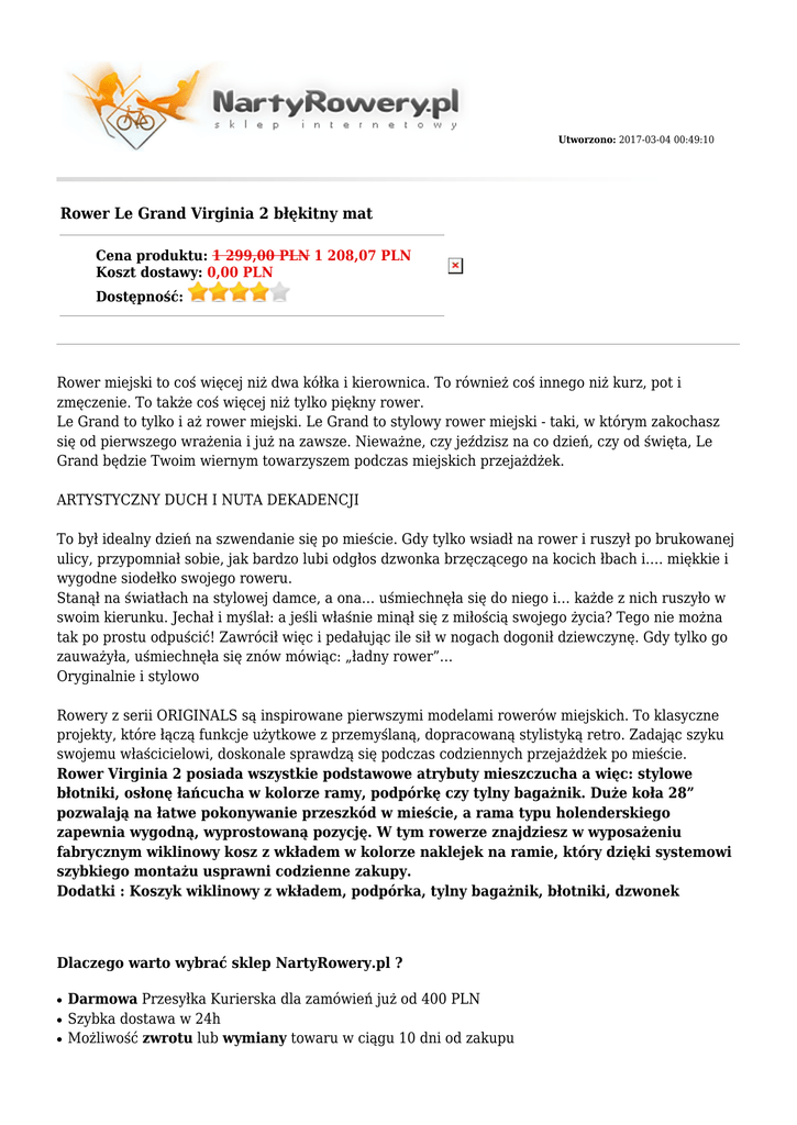 Utworzono: 2017-03-04 00:49:10 Rower Le Grand Virginia 2 błękitny mat Cena produktu: 1 299,00 PLN 1 208,07 PLN Koszt dostawy: 0,00 PLN Dostępność: Rower miejski to coś więcej niż dwa kółka i kierownica. To również coś innego niż kurz, pot i zmęczenie. To także coś więcej niż tylko piękny rower. Le Grand to tylko i aż rower miejski. Le Grand to stylowy rower miejski - taki, w którym zakochasz się od pierwszego wrażenia i już na zawsze. Nieważne, czy jeździsz na co dzień, czy od święta, Le Grand będzie Twoim wiernym towarzyszem podczas miejskich przejażdżek. ARTYSTYCZNY DUCH I NUTA DEKADENCJI To był idealny dzień na szwendanie się po mieście. Gdy tylko wsiadł na rower i ruszył po brukowanej ulicy, przypomniał sobie, jak bardzo lubi odgłos dzwonka brzęczącego na kocich łbach i…. miękkie i wygodne siodełko swojego roweru. Stanął na światłach na stylowej damce, a ona… uśmiechnęła się do niego i… każde z nich ruszyło w swoim kierunku. Jechał i myślał: a jeśli właśnie minął się z miłością swojego życia? Tego nie można tak po prostu odpuścić! Zawrócił więc i pedałując ile sił w nogach dogonił dziewczynę. Gdy tylko go zauważyła, uśmiechnęła się znów mówiąc: „ładny rower”… Oryginalnie i stylowo Rowery z serii ORIGINALS są inspirowane pierwszymi modelami rowerów miejskich. To klasyczne projekty, które łączą funkcje użytkowe z przemyślaną, dopracowaną stylistyką retro. Zadając szyku swojemu właścicielowi, doskonale sprawdzą się podczas codziennych przejażdżek po mieście. Rower Virginia 2 posiada wszystkie podstawowe atrybuty mieszczucha a więc: stylowe błotniki, osłonę łańcucha w kolorze ramy, podpórkę czy tylny bagażnik. Duże koła 28” pozwalają na łatwe pokonywanie przeszkód w mieście, a rama typu holenderskiego zapewnia wygodną, wyprostowaną pozycję. W tym rowerze znajdziesz w wyposażeniu fabrycznym wiklinowy kosz z wkładem w kolorze naklejek na ramie, który dzięki systemowi szybkiego montażu usprawni codzienne zakupy. Dodatki : Koszyk wiklinowy z wkładem, podpórka, tylny bagażnik, błotniki, dzwonek Dlaczego warto wybrać sklep NartyRowery.pl ? ● ● ● Darmowa Przesyłka Kurierska dla zamówień już od 400 PLN Szybka dostawa w 24h Możliwość zwrotu lub wymiany towaru w ciągu 10 dni od zakupu ● ● ● ● ● ● ● ● ● ● W naszym sklepie internetowym są tylko aktualnie dostępne produkty (zredukowaliśmy do minimum ryzyko braku dostępności zamówionego towaru) Możliwość negocjacji cen Częste promocje i rabaty ( obniżki cen, rabat na akcesoria, gratisy do rowerów) Fachowe doradztwo Pozytywne opinie w niezależnych serwisach m.in. Opineo, Allegro i porównywarkach cen Możliwość zakupu na raty - obsługujemy systemy Żagiel i Cetelem Sprzedajemy rowery wyregulowane i przesmarowane Do każdego zamówienia otrzymasz paragon lub fakturę stanowiący podstawę gwarancji Szczegółowe informacje o statusie zamówienia i wysyłce na adres e-mail podany w zamówieniu Obsługujemy płatności internetowe i Paypal Dołożono wszelkich starań, aby opisy i zdjęcia produktów były dokładne i aktualne. Specyfikacje i ceny mogą ulec zmianie bez uprzedzenia Płeć Przeznaczenie Damski City/ urban, Miejski Widelec/ amortyzator Stalowa 28" Manetki - Przerzutka przód - Przerzutka tył Shimano Nexus SG-3C41 Kaseta/ wolnobieg - Korbowód - Pedały - Hamulce Piasta przód Piasta tył Hamulec przód Calliper stalowy Hamulec tył Shimano torpedo Stalowa Shimano Nexus SG-3C41 Obręcze - Szprychy - Kolekcja 2016 Opony 28"x1.75" Rubena Stery - Mostek - Kierownica - Chwyty VLG 105 Siodło VL-8114 Sztyca - Waga 18.4 kg Rama Stalowa 28" Hamulce Torpedo, Bębnowe Damper - Pegi - Ilość biegów 3 Łańcuch - Gwarancja Adres: http://nartyrowery.pl/ 2 lata Telefon: 34 365 66 09, 793 61 04 29 Email: [email protected] Gadu-Gadu: Skype: