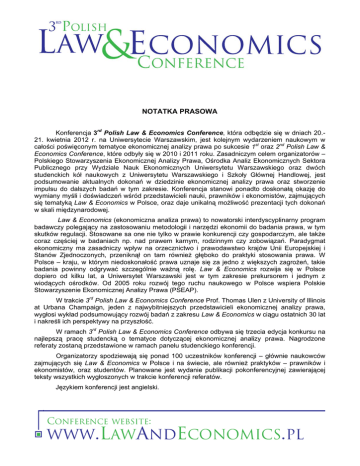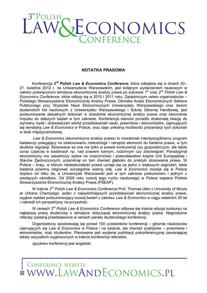 NOTATKA PRASOWA Konferencja 3rd Polish Law & Economics Conference, która odbędzie się w dniach 20.21. kwietnia 2012 r. na Uniwersytecie Warszawskim, jest kolejnym wydarzeniem naukowym w całości poświęconym tematyce ekonomicznej analizy prawa po sukcesie 1st oraz 2nd Polish Law & Economics Conference, które odbyły się w 2010 i 2011 roku. Zasadniczym celem organizatorów – Polskiego Stowarzyszenia Ekonomicznej Analizy Prawa, Ośrodka Analiz Ekonomicznych Sektora Publicznego przy Wydziale Nauk Ekonomicznych Uniwersytetu Warszawskiego oraz dwóch studenckich kół naukowych z Uniwersytetu Warszawskiego i Szkoły Głównej Handlowej, jest podsumowanie aktualnych dokonań w dziedzinie ekonomicznej analizy prawa oraz stworzenie impulsu do dalszych badań w tym zakresie. Konferencja stanowi ponadto doskonałą okazję do wymiany myśli i doświadczeń wśród przedstawicieli nauki, prawników i ekonomistów, zajmujących się tematyką Law & Economics w Polsce, oraz daje unikalną możliwość prezentacji tych dokonań w skali międzynarodowej. Law & Economics (ekonomiczna analiza prawa) to nowatorski interdyscyplinarny program badawczy polegający na zastosowaniu metodologii i narzędzi ekonomii do badania prawa, w tym skutków regulacji. Stosowane sa one nie tylko w prawie konkurencji czy gospodarczym, ale także coraz częściej w badaniach np. nad prawem karnym, rodzinnym czy zobowiązań. Paradygmat ekonomiczny ma zasadniczy wpływ na orzecznictwo i prawodawstwo krajów Unii Europejskiej i Stanów Zjednoczonych, przeniknął on tam również głęboko do praktyki stosowania prawa. W Polsce – kraju, w którym niedoskonałość prawa uznaje się za jedno z większych zagrożeń, takie badania powinny odgrywać szczególnie ważną rolę. Law & Economics rozwija się w Polsce dopiero od kilku lat, a Uniwersytet Warszawski jest w tym zakresie prekursorem i jednym z wiodących ośrodków. Od 2005 roku rozwój tego ruchu naukowego w Polsce wspiera Polskie Stowarzyszenie Ekonomicznej Analizy Prawa (PSEAP). W trakcie 3rd Polish Law & Economics Conference Prof. Thomas Ulen z University of Illinois at Urbana Champaign, jeden z najwybitniejszych przedstawicieli ekonomicznej analizy prawa, wygłosi wykład podsumowujący rozwój badań z zakresu Law & Economics w ciągu ostatnich 30 lat i nakreśli ich perspektywy na przyszłość. W ramach 3rd Polish Law & Economics Conference odbywa się trzecia edycja konkursu na najlepszą pracę studencką o tematyce dotyczącej ekonomicznej analizy prawa. Nagrodzone referaty zostaną przedstawione w ramach panelu studenckiego konferencji. Organizatorzy spodziewają się ponad 100 uczestników konferencji – głównie naukowców zajmujących się Law & Economics w Polsce i na świecie, ale również praktyków – prawników i ekonomistów, oraz studentów. Planowane jest wydanie publikacji pokonferencyjnej zawierającej teksty wszystkich wygłoszonych w trakcie konferencji referatów. Językiem konferencji jest angielski.