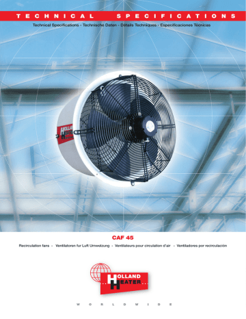 T E C H N I C A L S P E C I F I C A T I O N S Technical Specifications - Technische Daten - Détails Techniques - Especificaciones Técnicas CAF 45 Recirculation fans - Ventilatoren fur Luft Umwelzung - Ventilateurs pour circulation d’air - Ventiladores por recirculación ENGLISH NEDERLANDS 230v50 Hz MODEL: CAF 45 Luchtverplaatsing Worp Frequentie Netspanning Stroomverbruik Nominaal toerental Gewicht Diameter Max. omgevings temp. m3 /h mtr/ft Hz Volt Amp. RPM kg cm c 5750 40/131 50 230 1,5 Air flow Air throw Frequency Supply voltage Electric consumption 1340 Motor speed 10 45 60 Weight Fréquence Tension secteur Consommation élec. Vitesse ventilateur Poids Diametre Max. environm. temp. m3 /h mtr Hz Volt Amp. RPM kg cm c 5750 40/131 50 230 1,5 Luftverdrangung Luftaustrittsbereich Frequenz Netzspannung Stromverbrauch 1340 Umdrehungen Vent. 10 45 60 Gewicht Durchmesser Max. environm. temp. Desplazamiento de aire m3 /h La tensión El consumo de la elec. Num. de revoluciones Peso Diámetros Max. environm. temp. 10 45 60 230v50 Hz m3 /h mtr/ft Hz Volt Amp. RPM kg cm c 5750 40/131 50 230 1,5 1340 10 45 60 ENGLISH 230v50 Hz MODEL: CAF 45 Frecuencia 1340 cm c MODEL: CAF 45 Espanol Tiro 5750 40/131 50 230 1,5 DEUTSCH 230v50 Hz MODEL: CAF 45 Emission m3 /h mtr/ft Hz Volt Amp. RPM kg Diameter Max. environm. temp. FRANCE Débit d’air 230v50 Hz MODEL: CAF 45 mtr/ft Hz Volt Amp. RPM kg cm c 230v50 Hz MODEL: CAF 45 5750 40/131 50 230 1,5 Air flow Air throw Frequency Supply voltage Electric consumption 1340 Motor speed 10 45 60 Weight m3 /h mtr/ft Hz Volt Amp. RPM kg 5750 40/131 50 230 1,5 1340 10 45 60 cm c Diameter Max. environm. temp. TURKISH 230v50 Hz MODEL: CAF 45 Elektrik tüketimi 5750 40/131 50 Volt 230 Amp. 1,5 Devir/motor hızı Hava de ğişimi m3 /h Emisyon mtr/ft Hz Frekans Voltaj P/min 1340 A ğırlık kg Çap cm c 10 45 60 Maks ortam sıcaklığı Holland Heater Oud Camp 5 3155 DL Maasland The Netherlands T (+31) 174 - 516741 F (+31) 174 - 518021 [email protected] www.hollandheater.nl W O R L D W I D E