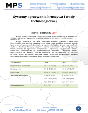 MPS Systemy ogrzewania kruszywa i wody technologicznej SYSTEM GRZEWCZY „CH” System grzewczy CH-3 oraz CH-2 to kompletne urządzenie grzewcze wyposaŜone w kocioł wodny oraz nagrzewnicę powietrza zabudowane w izolowanym kontenerze morskim 20’. System ogrzewania nie tylko rozwiązuje problem zbrylania i zamarzania komponentów, lecz łącznie z przygotowywaną ciepłą wodą, umoŜliwia produkcję betonu, takŜe w okresie zimowym. Indywidualne projektowanie kaŜdego układu rozprowadzania ciepła w dozatorze kruszyw, zapewnia idealne dostosowanie do kaŜdej sytuacji. Ciepłe powietrze do ogrzewania komponentów i sprawnego przygotowania betonu. Ciepła woda technologiczna do bezproblemowego mieszania i transportu betonu. Pełna realizacja od projektu, poprzez wykonanie, do uruchomienia, od początku do końca. Warto wykorzystać wszystkie zalety perfekcyjnie opracowanego systemu ogrzewania silosów i przygotowania ciepłej wody technologicznej. Typ systemu CH-3 CH-2 Nagrzewnica powietrza AH-3; 240 [kW] AH-3; 240 [kW] Kocioł wodny BW-3; 240 [kW] BW-2; 170 [kW] Zabudowa Kontener morski 20’ Kontener morski 20’ Wymiary zewnętrzne Dł. 6058 [mm] Dł. 6058 [mm] Szer. 2438 [mm] Szer. 2438 [mm] Wys. 2591 [mm] Wys. 2591 [mm] 5020 [kg] 4710 [kg] Masa urządzenia 1 MPS SCHEMAT SYSTEMU GRZEWCZEGO ZASILANIE W ZIMNĄ WODĘ ZBIORNIKI PALIWA TANKOWANIE ODPOWIETRZENIE WYLOT WODY Z KOTŁA WYLOT GORĄCEGO POWIETRZA KOCIOŁ WODNY WENTYLATOR NAGRZEWNICA POWIETRZA SZAFA STEROWNICZA SYSTEM KOMINOWY Nagrzewnica powietrza Nagrzewnica jest urządzeniem do wytwarzania gorącego powietrza o maksymalnej temperaturze pracy do 120°C. Nagrzewnica moŜe być opalana palnikiem olejowym lub gazowym. Nagrzewnica wraz z instalacją słuŜy do podgrzania kruszywa w silosach. Ogrzane powietrze jest doprowadzane do komór dozatora kruszyw za pomocą systemu rur i przewodów, a poprzez specjalne dysze przetłaczane przez kruszywo. Przechodząc przez kruszywo powoduje napowietrzanie, ogrzanie i osuszanie. Kruszywo pozostaje w stanie sypkim i nie ulega zbrylaniu ani zamarzaniu. System zasuw i klap regulacyjnych gwarantuje, Ŝe strumień powietrza regulowany jest oddzielnie dla kaŜdej komory dozatora. Instalacja grzewcza składa się z wysokowydajnego pieca grzewczego, wyposaŜonego w wentylator i palnik olejowy lub gazowy. 2 MPS Typ nagrzewnicy AH-3 AH-2 Moc znamionowa 240 [kW] 170 [kW] Maksymalna temperatura powietrza na wylocie 120 [°C] 120 [°C] Moc silnika dmuchawy 15 [kW] 11 [kW] ZuŜycie oleju (praca ciągła) 21,5 [kg/h] 15,2 [kg/h] Przegląd zalet: zwarta konstrukcja, niskie straty ciepła poprzez izolację cieplną na rurach wylotowych, system klap umoŜliwiający regulację przepływu gorącego powietrza. SCHEMAT DZIAŁANIA INSTALACJI GORĄCEGO POWIETRZA DOZATOR KRUSZYW czerpnia powietrza WYLOT SPALIN gorące powietrze max 120°C gorące powietrze 3 MPS Kocioł wodny Produkowane przez nas kotły są kotłami wodnymi niskotemperaturowymi opalanymi palnikiem olejowym lub gazowym o dopuszczalnej temperaturze pracy maksymalnie 95 °C oraz ciśnieniu roboczym wynoszącym maksymalnie 6 bar. Kocioł wodny wraz z instalacją słuŜy do przygotowania ciepłej wody technologicznej, zarówno do procesu mieszania jak i do transportu samochodem mieszarką. Instalacja składa się z wysokowydajnego kotła wodnego wyposaŜonego w palnik olejowy lub gazowy i instalacji rurowej z zaworem mieszającym. Przygotowanie ciepłej wody do procesu mieszania i napełnianie zbiornika betonowozu następuje automatycznie. Regulacja temperatury mieszania odbywa się w sposób płynny, bezpośrednio z pulpitu sterującego procesem ogrzewania wody technologicznej. Typ kotła BW-3 BW-2 Pojemność 2800 [l] 1800 [l] Moc znamionowa 240 [kW] 170 [kW] Maksymalna temperatura pracy 95 [°C] 95 [°C] Maksymalne ciśnienie pracy 6 [bar] 6 [bar] Wydajność (woda do 65 °C) 6450 [l/h] 4150 [l/h] ZuŜycie oleju (praca ciągła) 21,5 [kg/h] 15,2 [kg/h] Czas ogrzewania od 10°C do 65°C 51 [min] 45 [min] Przegląd zalet: kocioł z nawrotną komorą spalania o niskim obciąŜeniu cieplnym decyduje o niskiej emisji spalin, sprawność kotła ~ 91,5 %, obszerne przekroje wodne i duŜa pojemność kotła, zapewniają równomierny odbiór ciepła z powierzchni grzewczej , brak konieczności montaŜu dodatkowych zabezpieczeń na wyjściu z kotła, niskie straty ciepła poprzez izolację cieplną o grubości 50 mm, panel sterowniczy umoŜliwiający regulację pracy kotła, kocioł wyposaŜony w pompę obiegową zapewniającą stały rozkład temperatury, projekty kotłów zgodne z dyrektywą ciśnieniową 97/23/EG oraz dyrektywą dla urządzeń opalanych paliwami ciekłymi lub gazowymi 92/42/EWG. 4 MPS SCHEMAT DZIAŁANIA INSTALACJI KOTŁA WODNEGO zawór trójdroŜny mieszający woda zmieszana 5°C - 95°C woda gorąca max 95°C zawór otwarty w sezonie zimowym WYLOT SPALIN zawór otwarty w sezonie letnim woda zimna min 5°C zawór otwarty w sezonie zimowym HEAT SYSTEM „HS” Urządzenie HEAT SYSTEM jest niezwykle wydajnym agregatem do wytwarzania gorącej wody technologicznej oraz systemem do ogrzewania kruszyw. Praca urządzenia polega na kierowaniu wszystkich gazów spalinowych z komory spalania do dozatora kruszyw, jednocześnie energia gazów spalinowych jest przenoszona do kruszywa i wody w zbiorniku. Cząstki stałe powstałe podczas spalania, przechodząc przez warstwę kruszywa wiąŜą się ze składnikami mieszanki betonowej. Urządzenie to umoŜliwia utrzymanie w betonowni całorocznej maksymalnej wydajności, nawet w okresie bardzo mroźnej zimy. ZuŜycie paliwa na wyprodukowany m3 betonu jest o 4060% mniejsze, niŜ w metodach ogrzewania tradycyjnego. Podczas ogrzewania kruszywa do gazów spalinowych o temperaturze +1250°C opuszczających komorę spalania wtryskuję się wodę, przy pomocy, której obniŜa się temperaturę gazów do +280°C. Gazy spalinowe kieruję się do zbiornika kruszyw, gdzie energia cieplna przechodzi do kruszywa praw