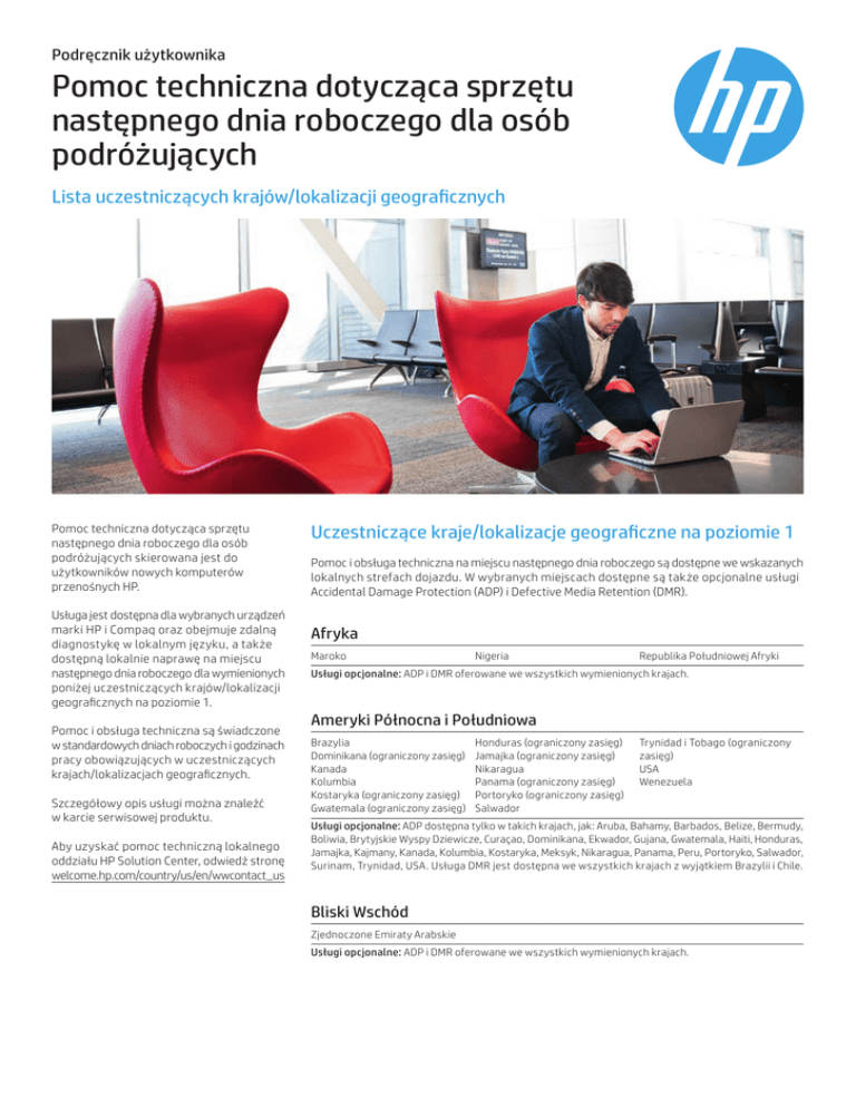 Podręcznik użytkownika Pomoc techniczna dotycząca sprzętu następnego dnia roboczego dla osób podróżujących Lista uczestniczących krajów/lokalizacji geograficznych Pomoc techniczna dotycząca sprzętu następnego dnia roboczego dla osób podróżujących skierowana jest do użytkowników nowych komputerów przenośnych HP. Usługa jest dostępna dla wybranych urządzeń marki HP i Compaq oraz obejmuje zdalną diagnostykę w lokalnym języku, a także dostępną lokalnie naprawę na miejscu następnego dnia roboczego dla wymienionych poniżej uczestniczących krajów/lokalizacji geograficznych na poziomie 1. Pomoc i obsługa techniczna są świadczone w standardowych dniach roboczych i godzinach pracy obowiązujących w uczestniczących krajach/lokalizacjach geograficznych. Szczegółowy opis usługi można znaleźć w karcie serwisowej produktu. Aby uzyskać pomoc techniczną lokalnego oddziału HP Solution Center, odwiedź stronę welcome.hp.com/country/us/en/wwcontact_us Uczestniczące kraje/lokalizacje geograficzne na poziomie 1 Pomoc i obsługa techniczna na miejscu następnego dnia roboczego są dostępne we wskazanych lokalnych strefach dojazdu. W wybranych miejscach dostępne są także opcjonalne usługi Accidental Damage Protection (ADP) i Defective Media Retention (DMR). Afryka Maroko Nigeria Republika Południowej Afryki Usługi opcjonalne: ADP i DMR oferowane we wszystkich wymienionych krajach. Ameryki Północna i Południowa Brazylia Dominikana (ograniczony zasięg) Kanada Kolumbia Kostaryka (ograniczony zasięg) Gwatemala (ograniczony zasięg) Honduras (ograniczony zasięg) Jamajka (ograniczony zasięg) Nikaragua Panama (ograniczony zasięg) Portoryko (ograniczony zasięg) Salwador Trynidad i Tobago (ograniczony zasięg) USA Wenezuela Usługi opcjonalne: ADP dostępna tylko w takich krajach, jak: Aruba, Bahamy, Barbados, Belize, Bermudy, Boliwia, Brytyjskie Wyspy Dziewicze, Curaçao, Dominikana, Ekwador, Gujana, Gwatemala, Haiti, Honduras, Jamajka, Kajmany, Kanada, Kolumbia, Kostaryka, Meksyk, Nikaragua, Panama, Peru, Portoryko, Salwador, Surinam, Trynidad, USA. Usługa DMR jest dostępna we wszystkich krajach z wyjątkiem Brazylii i Chile. Bliski Wschód Zjednoczone Emiraty Arabskie Usługi opcjonalne: ADP i DMR oferowane we wszystkich wymienionych krajach. Podręcznik użytkownika | Pomoc techniczna dotycząca sprzętu następnego dnia roboczego dla osób podróżujących Europa Pomoc i obsługa techniczna dotycząca sprzętu dla osób podróżujących Andora Austria Belgia Bułgaria Czechy Dania Estonia Finlandia Francja Gibraltar Grecja Hiszpania Holandia Irlandia Islandia Izrael Liechtenstein Litwa Łotwa Luksemburg Monako Niemcy Norwegia Polska Portugalia Rumunia Rosja San Marino Słowacja Słowenia Szwajcaria Szwecja Turcja Ukraina Węgry Wielka Brytania Włochy Usługi opcjonalne: ADP i DMR oferowane we wszystkich wymienionych krajach. Azja Południowo-Wschodnia i region Pacyfiku Australia Chiny Filipiny (brak ADP) Hongkong Indie Indonezja Japonia Korea Południowa Makau Malezja Nowa Zelandia Singapur Tajwan Tajlandia Wietnam (wyłącznie Ho Chi Minh i Hanoi) Usługi opcjonalne: ADP i DMR oferowane we wszystkich wymienionych krajach ze wskazanymi wyjątkami. Strefy dojazdu Czas naprawy sprzętu na miejscu dotyczy lokalizacji w promieniu 160 km od wyznaczonego centrum wsparcia HP. Dojazd do lokalizacji w promieniu 320 km od wyznaczonego centrum wsparcia HP jest zapewniany bez dodatkowych kosztów po stronie klienta. W przypadku lokalizacji oddalonych o więcej niż 320 km od wyznaczonego centrum wsparcia HP naliczone zostaną dodatkowe opłaty za dojazd. Strefy dojazdu i opłaty mogą być różne w różnych lokalizacjach. W przypadku lokalizacji oddalonych o więcej niż 160 km od wyznaczonego centrum wsparcia HP czas naprawy zostanie wydłużony o czas dojazdu zgodnie z poniższą tabelą. Odległość od wyznaczonego centrum wsparcia HP Czas naprawy na miejscu 0–160 km Następnego dnia roboczego* 161–320 km 1 dodatkowy dzień roboczy* 321–480 km 2 dodatkowe dni robocze* Powyżej 480 km Ustalany w chwili zamawiania usługi i zależny od dostępności zasobów *Strefy dojazdu i czasy naprawy różnią się w zależności od kraju/lokalizacji geograficznej. Aby uzyskać więcej informacji, prosimy o kontakt z lokalnym przedstawicielem handlowym. Zarejestruj się, aby otrzymywać aktualizacje, na: hp.com/go/getupdated © Copyright 2016 HP Development Company, L.P. Informacje zawarte powyżej mogą ulec zmianie bez powiadomienia. Jedyne gwarancje na produkty i usługi HP są zawarte w wyraźnych oświadczeniach gwarancyjnych dołączonych do tych produktów i usług. Nic, co zostało zawarte w niniejszym dokumencie, nie może być rozumiane jako dodatkowa gwarancja. Firma HP nie ponosi odpowiedzialności prawnej za błędy techniczne lub redakcyjne ani za ewentualne braki w niniejszym opracowaniu. Poziomy usług i czasy napraw w ramach pakietów HP Care Pack mogą się różnić w zależności od lokalizacji geograficznej. Usługa jest dostępna od dnia zakupu sprzętu. Obowiązują zastrzeżenia i ograniczenia. Więcej informacji na stronie hp.com/go/cpc. Usługi HP podlegają obowiązującym warunkom świadczenia dostarczonym lub wskazanym klientowi w momencie zakupu. Klientowi mogą przysługiwać dodatkowe prawa ustawowe wynikające z obowiązujących przepisów prawa, a warunki świadczenia usług HP ani ograniczenia gwarancji na produkty HP nie mają na nie wpływu. 4AA1-4160PLE, maj 2016, wer. 5