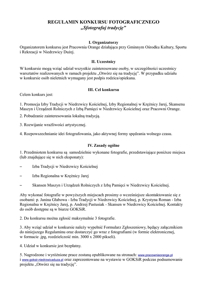 REGULAMIN KONKURSU FOTOGRAFICZNEGO „Sfotografuj tradycję” I. Organizatorzy Organizatorem konkursu jest Pracownia Orange działająca przy Gminnym Ośrodku Kultury, Sportu i Rekreacji w Niedrzwicy Dużej. II. Uczestnicy W konkursie mogą wziąć udział wszystkie zainteresowane osoby, w szczególności uczestnicy warsztatów realizowanych w ramach projektu „Otwórz się na tradycję”. W przypadku udziału w konkursie osób nieletnich wymagany jest podpis rodzica/opiekuna. III. Cel konkursu Celem konkurs jest: 1. Promocja Izby Tradycji w Niedrzwicy Kościelnej, Izby Regionalnej w Krężnicy Jarej, Skansenu Maszyn i Urządzeń Rolniczych z Izbą Pamięci w Niedrzwicy Kościelnej oraz Pracowni Orange. 2. Pobudzanie zainteresowania lokalną tradycją. 3. Rozwijanie wrażliwości artystycznej. 4. Rozpowszechnianie idei fotografowania, jako aktywnej formy spędzania wolnego czasu. IV. Zasady ogólne 1. Przedmiotem konkursu są samodzielnie wykonane fotografie, przedstawiające poniższe miejsca (lub znajdujące się w nich eksponaty): – Izba Tradycji w Niedrzwicy Kościelnej – Izba Regionalna w Krężnicy Jarej – Skansen Maszyn i Urządzeń Rolniczych z Izbą Pamięci w Niedrzwicy Kościelnej. Aby wykonać fotografie w powyższych miejscach prosimy o wcześniejsze skontaktowanie się z osobami: p. Janina Głabowa - Izba Tradycji w Niedrzwicy Kościelnej, p. Krystyna Roman - Izba Regionalna w Krężnicy Jarej, p. Andrzej Pastusiak - Skansen w Niedrzwicy Kościelnej. Kontakty do osób dostępne są w biurze GOKSiR. 2. Do konkursu można zgłosić maksymalnie 3 fotografie. 3. Aby wziąć udział w konkursie należy wypełnić Formularz Zgłoszeniowy, będący załącznikiem do niniejszego Regulaminu oraz dostarczyć go wraz z fotografiami (w formie elektronicznej, w formacie .jpg, rozdzielczość min. 3000 x 2000 pikseli). 4. Udział w konkursie jest bezpłatny. 5. Nagrodzone i wyróżnione prace zostaną opublikowane na stronach: www.pracownieorange.pl i www.goksir.niedrzwicaduza.pl oraz zaprezentowane na wystawie w GOKSiR podczas podsumowanie projektu „Otwórz się na tradycję”. V. Terminy Prace wykonane zgodnie z wymogami organizatorów należy przekazać osobiście (GOKSiR, ul. Lubelska 10, Niedrzwica Duża) lub e-mailowo ([email protected]) do dnia 7 lutego 2017 r. VI. Ogłoszenie wyników i nagrody 1. Oceny prac dokona komisja jury w składzie: - Roman Kravchenko - fotografik, historyk, dziennikarz. Jest artystą tworzącym fotografie techniką ambrotypii. Jego prace były wielokrotnie prezentowane w Polsce i na Ukrainie, wystawy i warsztaty przyciągają wielu młodych fotografików, a dorobek artysty jest już doskonale znany i doceniany przez fotografików i kolekcjonerów na świecie. - Krzysztof Kuzko - artysta fotograf Fotoklubu RP, członek Lubelskiego Towarzystwa Fotograficznego i Radzyńskiego Klubu Fotograficznego KLATKA. Uczestnik kilkudziesięciu wystaw zbiorowych. Miał kilkanaście wystaw indywidualnych w kraju i jedną w Czechach. Liczne prace publikował w prasie i książkach. Jury oceni prace biorąc pod uwagę m. in. zgodność z tematem, jakość oraz kompozycję. Decyzje komisji są ostateczne. 2. Wyniki konkursu zostaną opublikowane na stronach: www.pracownieorange.pl i www.goksir.niedrzwicaduza.pl do 10 lutego 2017 r.. Ze zwycięzcami konkursu skontaktujemy się telefonicznie. 3. Zwycięzcom konkursu wręczone zostaną nagrody rzeczowe, a wszystkim uczestnikom dyplomy i/lub nagrody pocieszenia. VII. Postanowienia końcowe 1. Udział w konkursie jest równoznaczny z akceptacją regulaminu. 2. Konkurs realizowany jest w ramach projektu „Otwórz się na tradycję” współfinansowanego ze środków Fundacji Orange (program Pracownie Orange).