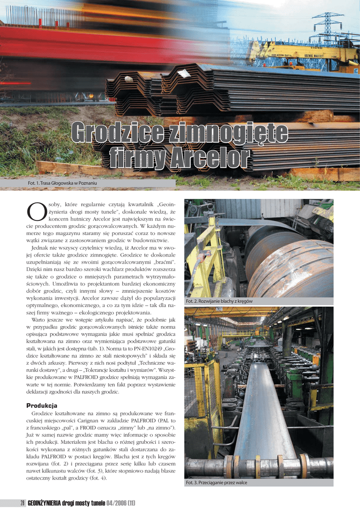 geoinżynieria geoinżynieria Grodzice zimnogięte firmy Arcelor Arcelor Fot. 1. Trasa Głogowska w Poznaniu O soby, które regularnie czytają kwartalnik „Geoinżynieria drogi mosty tunele”, doskonale wiedzą, że koncern hutniczy Arcelor jest największym na świecie producentem grodzic gorącowalcowanych. W każdym numerze tego magazynu staramy się poruszać coraz to nowsze wątki związane z zastosowaniem grodzic w budownictwie. Jednak nie wszyscy czytelnicy wiedzą, iż Arcelor ma w swojej ofercie także grodzice zimnogięte. Grodzice te doskonale uzupełnianiają się ze swoimi gorącowalcowanymi „braćmi”. Dzięki nim nasz bardzo szeroki wachlarz produktów rozszerza się także o grodzice o mniejszych parametrach wytrzymałościowych. Umożliwia to projektantom bardziej ekonomiczny dobór grodzic, czyli innymi słowy – zmniejszenie kosztów wykonania inwestycji. Arcelor zawsze dążył do popularyzacji optymalnego, ekonomicznego, a co za tym idzie – tak dla naszej firmy ważnego – ekologicznego projektowania. Warto jeszcze we wstępie artykułu napisać, że podobnie jak w przypadku grodzic gorącowalcowanych istnieje także norma opisująca podstawowe wymagania jakie musi spełniać grodzica kształtowana na zimno oraz wymieniająca podstawowe gatunki stali, w jakich jest dostępna (tab. 1). Norma ta to PN-EN10249 „Grodzice kształtowane na zimno ze stali niestopowych” i składa się z dwóch arkuszy. Pierwszy z nich nosi podtytuł „Techniczne warunki dostawy”, a drugi – „Tolerancje kształtu i wymiarów”. Wszystkie produkowane w PALFROID grodzice spełniają wymagania zawarte w tej normie. Potwierdzamy ten fakt poprzez wystawienie deklaracji zgodności dla naszych grodzic. Fot. 2. Rozwijanie blachy z kręgów Produkcja Grodzice kształtowane na zimno są produkowane we francuskiej miejscowości Carignan w zakładzie PALFROID (PAL to z francuskiego „pal”, a FROID oznacza „zimny” lub „na zimno”). Już w samej nazwie grodzic mamy więc informacje o sposobie ich produkcji. Materiałem jest blacha o różnej grubości i szerokości wykonana z różnych gatunków stali dostarczana do zakładu PALFROID w postaci kręgów. Blacha jest z tych kręgów rozwijana (fot. 2) i przeciągana przez serię kilku lub czasem nawet kilkunastu walców (fot. 3), które stopniowo nadają blasze ostateczny kształt grodzicy (fot. 4). 28 GEOINŻYNIERIA drogi mosty tunele 04/2006 (11) Fot. 3. Przeciąganie przez walce geoinżynieria geoinżynieria Gatunki stali stosowanych do produkcji grodzic zimnogiętych wymienione w polskiej normie PN-EN 10249-1 z września 2000 r. Minimalna granica plastyczności [N/mm2] 235 275 355 Gatunek stali S 235 JRC S 275 JRC S 355 JOC Minimalna wytrzymałość na rozciąganie [N/mm2] 340 410 490 Minimalne wydłużenie [%] 26 22 22 Tab. 1. Gatunki stali stosowanych do produkcji grodzic zimnogiętych RYSUNKI Typ Grubość ścianek [mm] Szerokość systemowa grodzicy [mm] Wysokość grodzicy [mm] Kąt między półką i środnikiem [o] Ciężar 1m2 ściany [kg/m2] Wskaźnik wytrz. przekroju na zginanie [cm3/m] PAL 30 30 3,00 660 89,0 41 29,4 112 PAL 30 40 4,00 660 90,0 41 39,2 147 PAL 30 50 5,00 660 91,0 41 48,8 181 PAL 31 30 3,00 711 125,0 79 33,1 199 PAL 31 40 4,00 711 126,0 79 44,0 261 PAL 31 50 5,00 711 127,0 79 54,9 322 PAL 32 60 6,00 700 149,0 61 66,0 413 PAL 32 70 7,00 700 150,0 61 76,0 479 PAL 32 80 8,00 700 151,0 61 88,0 545 PAL 32 90 9,00 700 152,0 61 100,0 605 PAU 22 40 4,00 922 251,5 48 42,3 404 PAU 22 50 5,00 921 252,5 48 52,8 504 PAU 22 60 6,00 921 253,5 48 63,3 600 PAU 24 40 4,00 813 293,0 60 48,0 537 PAU 24 50 5,00 813 294,0 60 59,9 669 PAU 24 60 6,00 813 295,0 60 71,8 801 PAU 27 70 7,00 804 296,0 60 87,5 934 PAU 27 80 8,00 804 297,0 60 99,8 1063 Tab. 2. Grodzice typu U Zastosowania W zasadzie zakres zastosowań grodzic formowanych na zimno nie odbiega znacząco od zakresu zastosowań grodzic gorącowalcowanych. Grodzice te znalazły przede wszystkim zastosowanie jako elementy chroniące brzegi rzek i kanałów przed erozją i zniszczeniem – już setki kilometrów brzegów dróg wodnych w Europie zostało zabezpieczonych przy pomocy naszych grodzic (fot. 5). Grodzice kształtowane na zimno znalazły także szerokie zastosowanie przy wykonywaniu szczelnych przegród oddzielających tereny skażone od terenów nie skażonych oraz jako szczelne ściany otaczające zbiorniki ze szkodliwymi dla ludzi i środowiska substancjami na wypadek ich rozszczelnienia. W tych zastosowaniach powszechne jest wypełnianie zamków materiałami uszczelniającymi. Do innych zastosowań zimnogiętych grodzic należą: – lekkie nabrzeża, – ściany oporowe o niskiej lub średniej wysokości, – obudowy wykopów, – ekrany akustyczne (jako elementy, do których mocuje się płyty dźwiękochłonne). Fot. 4 Gotowy profil Instalacja Można stosować te same metody pogrążania, jakie stosujemy w przypadku grodzic gorącowalcowanych. Dozwolone jest wbijanie, wwibrowywanie oraz statyczne wciskanie grodzic. Należy tu jednak zwrócić uwagę na jedną istotną różnicę pomiędzy grodzicami gorącowalcowanymi a formowanymi na zimno. Mianowicie fakt wykorzystania do ich produkcji blach powoduje, że ich naroża nie są pogrubione. Mimo, że niektó- GEOINŻYNIERIA drogi mosty tunele 04/2006 (11) 29 geoinżynieria geoinżynieria RYSUNKI Typ Grubość ścianek Szerokość systemowa poj. grodzicy Wysokość grodzicy Kąt między półką i środnikiem Ciężar 1m2 ściany PAZ 44 50 PAZ 44 60 PAZ 44 70 PAZ 45 60 PAZ 45 70 PAZ 45 80 PAZ 55 60 PAZ 55 70 PAZ 55 80 [mm] 5,00 6,00 7,00 6,00 7,00 8,00 6,00 7,00 8,00 [mm] 725 725 725 807 807 807 743 743 743 [mm] 269 270 271 351 352 353 407 408 409 [o] 45 45 45 45 45 45 55 55 55 [kg/m2] 52,0 62,2 72,3 66,8 77,6 88,4 72,5 84,3 96,0 Wskaźnik wytrz. przekroju na zginanie [cm3/m] 612 730 846 968 1123 1277 1233 1432 1628 Tab. 3. Grodzice typu Z RYSUNEK Typ Grubość ścianek RC 8 600 RC 8 700 RC 8 800 [mm] 6,