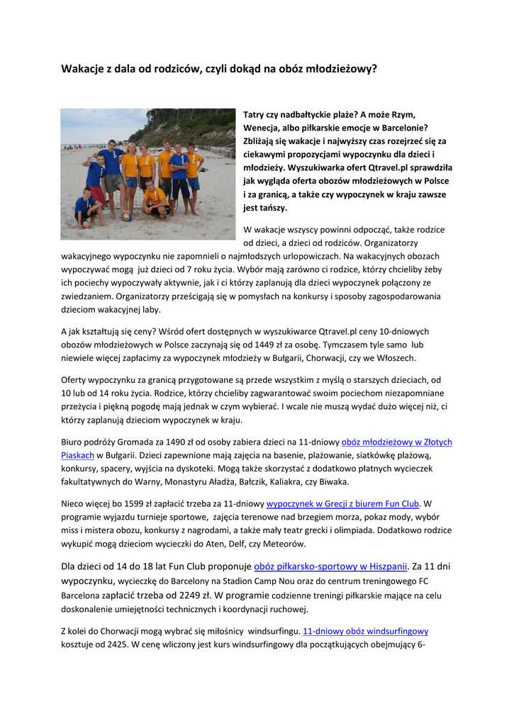 Wakacje z dala od rodziców, czyli dokąd na obóz młodzieżowy? Tatry czy nadbałtyckie plaże? A może Rzym, Wenecja, albo piłkarskie emocje w Barcelonie? Zbliżają się wakacje i najwyższy czas rozejrzeć się za ciekawymi propozycjami wypoczynku dla dzieci i młodzieży. Wyszukiwarka ofert Qtravel.pl sprawdziła jak wygląda oferta obozów młodzieżowych w Polsce i za granicą, a także czy wypoczynek w kraju zawsze jest tańszy. W wakacje wszyscy powinni odpocząć, także rodzice od dzieci, a dzieci od rodziców. Organizatorzy wakacyjnego wypoczynku nie zapomnieli o najmłodszych urlopowiczach. Na wakacyjnych obozach wypoczywać mogą już dzieci od 7 roku życia. Wybór mają zarówno ci rodzice, którzy chcieliby żeby ich pociechy wypoczywały aktywnie, jak i ci którzy zaplanują dla dzieci wypoczynek połączony ze zwiedzaniem. Organizatorzy prześcigają się w pomysłach na konkursy i sposoby zagospodarowania dzieciom wakacyjnej laby. A jak kształtują się ceny? Wśród ofert dostępnych w wyszukiwarce Qtravel.pl ceny 10-dniowych obozów młodzieżowych w Polsce zaczynają się od 1449 zł za osobę. Tymczasem tyle samo lub niewiele więcej zapłacimy za wypoczynek młodzieży w Bułgarii, Chorwacji, czy we Włoszech. Oferty wypoczynku za granicą przygotowane są przede wszystkim z myślą o starszych dzieciach, od 10 lub od 14 roku życia. Rodzice, którzy chcieliby zagwarantować swoim pociechom niezapomniane przeżycia i piękną pogodę mają jednak w czym wybierać. I wcale nie muszą wydać dużo więcej niż, ci którzy zaplanują dzieciom wypoczynek w kraju. Biuro podróży Gromada za 1490 zł od osoby zabiera dzieci na 11-dniowy obóz młodzieżowy w Złotych Piaskach w Bułgarii. Dzieci zapewnione mają zajęcia na basenie, plażowanie, siatkówkę plażową, konkursy, spacery, wyjścia na dyskoteki. Mogą także skorzystać z dodatkowo płatnych wycieczek fakultatywnych do Warny, Monastyru Aładża, Bałczik, Kaliakra, czy Biwaka. Nieco więcej bo 1599 zł zapłacić trzeba za 11-dniowy wypoczynek w Grecji z biurem Fun Club. W programie wyjazdu turnieje sportowe, zajęcia terenowe nad brzegiem morza, pokaz mody, wybór miss i mistera obozu, konkursy z nagrodami, a także mały teatr grecki i olimpiada. Dodatkowo rodzice wykupić mogą dzieciom wycieczki do Aten, Delf, czy Meteorów. Dla dzieci od 14 do 18 lat Fun Club proponuje obóz piłkarsko-sportowy w Hiszpanii. Za 11 dni wypoczynku, wycieczkę do Barcelony na Stadion Camp Nou oraz do centrum treningowego FC Barcelona zapłacić trzeba od 2249 zł. W programie codzienne treningi piłkarskie mające na celu doskonalenie umiejętności technicznych i koordynacji ruchowej. Z kolei do Chorwacji mogą wybrać się miłośnicy windsurfingu. 11-dniowy obóz windsurfingowy kosztuje od 2425. W cenę wliczony jest kurs windsurfingowy dla początkujących obejmujący 6- dniowy cykl szkolenia po 2 godziny dziennie zajęć na wodzie w grupach 5-8 osobowych z instruktorem oraz 2 godzin zajęć teoretycznych. Dla młodych podróżników powyżej 12 roku życia, którzy zainteresowani są zwiedzaniem biuro Gromada przygotowało 11-dniowy obóz nad Morzem Tyrreńskim. Za 1750 zł od osoby młodzież wypoczywać będzie w apartamentach nad morzem, a także zwiedzi Rzym i Monte Cassino. Ci, którzy czas wakacji chcą wykorzystać na naukę mogą skorzystać z oferty biura Almatur i wybrać się na Intensywny kurs niemieckiego w Berlinie. Oferta przeznaczona jest dla młodziezy od 12 roku życia, a za dwutygodniowy wypoczynek połączony z nauką zapłacić trzeba od 2549 zł za osobę. Rodzice, którzy wolą mieć swoje dzieci „pod ręką” i poszukują wyjazdu na obóz w kraju wybrać mogą jedną z ofert biura Almatur. Młodzi piłkarze będą szlifować swoje umiejętności na obozie piłkarskim w Cetniewie koło Władysławowa. Za 10 dni wypoczynku połączonego z intensywnymi treningami rodzice zapłacą od 1549 zł za osobę. W Poroninie Almatur organizuje obóz taneczny. Mogą w nim wziąć udział już 7 letnie dzieci. Codzienne 5 godzin treningu, wędrówki górskie, szaleństwem w aquaparku i inne atrakcje - 10 dni kosztuje 1449 zł od osoby. Z kolei dzieci, które kochają wodę mogą połączyć wypoczynek z kursem na Młodszego Ratownika WOPR. Obóz ratowniczy w Dąbkach dla dzieci od 10 roku życia kosztuje 1799 zł. Porównując propozycje wypoczynku dla dzieci i młodzieży zwraca uwagę niewielka różnica w cenie między wypoczynkiem w kraju i za granicą. Oczywiście wysyłając dziecko w podróż zagraniczną uwzględnić należy dłuższą podróż autokarem, jednak wrażenia z takiej wycieczki z pewnością będą niezapomniane. A pogoda we Włoszech, Bułgarii, czy w Grecji - pewniejsza niż w Polsce.