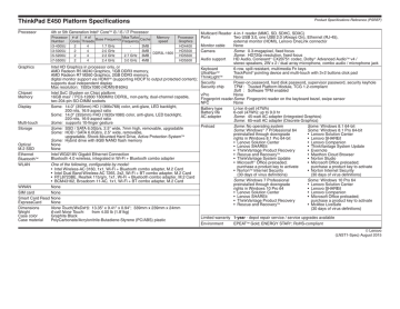 Product Specifications Reference (PSREF) ThinkPad E450 Platform Specifications Processor 4th or 5th Generation Intel® Core™ i3 / i5 / i7 Processor Multicard Reader 4-in-1 reader (MMC, SD, SDHC, SDXC) Ports Two USB 3.0, one USB 2.0 (Always On), Ethernet (RJ-45), external monitor (HDMI), Lenovo OneLink connector Monitor cable None 3MB 3MB Camera Some: 0.3-megapixel, fixed focus DDR3L-1600 Some: HD720p resolution, fixed focus 3MB Audio support HD Audio, Conexant® CX20751 codec, Dolby® Advanced Audio™ v4 / 4MB stereo speakers, 2W x 2 / dual array microphone, combo audio / microphone jack Graphics Intel HD Graphics in processor only, or Keyboard 6-row, spill-resistant, multimedia Fn keys AMD Radeon R5 M240 Graphics, 1GB DDR3 memory, UltraNav™ TrackPoint® pointing device and multi-touch with 3+2 buttons click pad AMD Radeon R7 M260 Graphics, 2GB DDR3 memory, None ThinkLight™ digital monitor support via HDMI™ (supporting HDCP to output protected content); Security Power-on password, hard disk password, supervisor password, security keyhole supports dual independent display Security chip TPM : Trusted Platform Module, TCG 1.2-compliant Max resolution: 1920x1080 (HDMI)@60Hz Soft : Software TPM enabled Chipset Intel SoC (System on Chip) platform vPro None Memory 16GB max7 / PC3-12800 1600MHz DDR3L, non-parity, dual-channel capable, Fingerprint reader Some: Fingerprint reader on the keyboard bezel, swipe sensor two 204-pin SO-DIMM sockets NFC None Display Some: 14.0" (355mm) HD (1366x768) color, anti-glare, LED backlight, Battery type Li-Ion 6-cell (47Wh) 200 nits, 16:9 aspect ratio Battery life 6-cell (47Wh): up to 9.0 hr Some: 14.0" (355mm) FHD (1920x1080) color, anti-glare, LED backlight, AC adapter Some: 45-watt AC adapter (Integrated Graphics) 220 nits, 16:9 aspect ratio Some: 65-watt AC adapter (Discrete Graphics) Multi-touch Some: supports 10-finger gesture Some: Windows 8.1 64-bit Preload Some: No operating system Storage Some: SSD / SATA 6.0Gb/s, 2.5" wide, 7mm high, removable, upgradable Some: Windows 8.1 Pro 64-bit Some: Windows® 7 Professional 64 Some: HDD / SATA 6.0Gb/s, 2.5" wide, removable, preinstalled through downgrade • Lenovo Solution Center upgradable, Shock Mounted Hard Drive, Active Protection System™ rights in Windows 8.1 Pro 64-bit • Lenovo SHAREit Some: Hybrid drive with 8GB NAND flash memory • Lenovo Solution Center • Lenovo Companion Optical None • Lenovo SHAREit • ThinkVantage System Update M.2 SSD None • ThinkVantage Product Recovery • Evernote Ethernet Intel WGI218V Gigabit Ethernet Connection • Rescue and Recovery™ • Maxthon Cloud Browser Bluetooth 4.0 wireless, integrated in Wi-Fi + Bluetooth combo adapter • ThinkVantage System Update • Norton Studio Bluetooth™ ® • Microsoft Office preloaded; • Microsoft Office preloaded; WLAN One of the following, configurable by model: purchase a product key to activate purchase a product key to activate • Intel Wireless-AC 3160, 1x1, Wi-Fi + Bluetooth combo adapter, M.2 Card • Norton™ Internet Security • Norton Internet Security • Intel Dual Band Wireless-AC 7265, 2x2, Wi-Fi + BT combo adapter, M.2 Card (30 days of virus definitions) (30 days of virus definitions) • RTL8723BE, Realtek 11b/g/n, 1x1, Wi-Fi + Bluetooth combo adapter, M.2 Card Some: Windows 7 Professional Some: Windows 10 Pro 64 • BCM43162, Broadcom 11-AC, 1x1, Wi-Fi + BT combo adapter, M.2 Card preinstalled through downgrade • Lenovo Solution Center WWAN None rights in Windows 10 Pro 64 • Lenovo SHAREit • Lenovo Solution Center • Lenovo Companion SIM card None • Lenovo SHAREit • Microsoft Office preloaded; Smart Card Read None • ThinkVantage Product Recovery purchase a product key to activate ExpressCard None • Rescue and Recovery™ • McAfee LiveSafe None Touch(WxDxH): 13.35" x 9.41" x 0.94"; 339mm x 239mm x 24mm Dimensions (30 days of virus definitions) Weight 6-cell None Touch: from 4.00 lb (1.81kg) Case color Graphite Black Limited warranty 1-year - depot repair service / service upgrades available Case material PolyCarbonate/Acrylonitrile-Butadiene-Styrene (PC/ABS) plastic Environment EPEAT™ Gold; ENERGY STAR®; RoHS-compliant Processor # of # of Base Frequency Number Cores Threads i3-4005U 2 4 1.7 GHz i3-5005U 2 4 2.0 GHz i5-5200U 2 4 2.2 GHz i7-5500U 2 4 2.4 GHz Max Turbo Frequency 2.7 GHz 3.0 GHz Cache Memory speed Processor Graphics HD4400 HD5500 HD5500 HD5500 © Lenovo (LNST1-Spec) August 2015