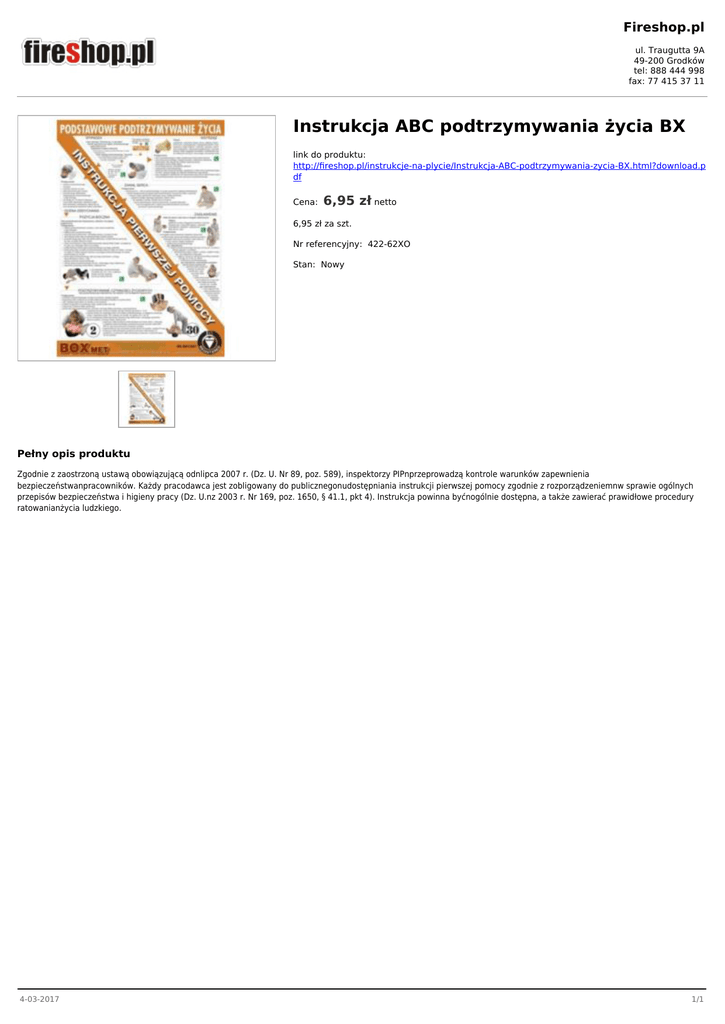 Fireshop.pl ul. Traugutta 9A 49-200 Grodków tel: 888 444 998 fax: 77 415 37 11 Instrukcja ABC podtrzymywania życia BX link do produktu: http://fireshop.pl/instrukcje-na-plycie/Instrukcja-ABC-podtrzymywania-zycia-BX.html?download.p df Cena: 6,95 zł netto 6,95 zł za szt. Nr referencyjny: 422-62XO Stan: Nowy Pełny opis produktu Zgodnie z zaostrzoną ustawą obowiązującą odnlipca 2007 r. (Dz. U. Nr 89, poz. 589), inspektorzy PIPnprzeprowadzą kontrole warunków zapewnienia bezpieczeństwanpracowników. Każdy pracodawca jest zobligowany do publicznegonudostępniania instrukcji pierwszej pomocy zgodnie z rozporządzeniemnw sprawie ogólnych przepisów bezpieczeństwa i higieny pracy (Dz. U.nz 2003 r. Nr 169, poz. 1650, § 41.1, pkt 4). Instrukcja powinna byćnogólnie dostępna, a także zawierać prawidłowe procedury ratowanianżycia ludzkiego. 4-03-2017 1/1