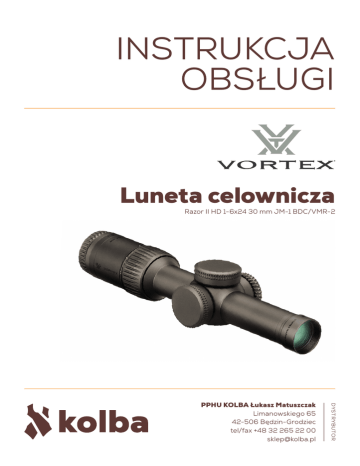 INSTRUKCJA OBSŁUGI Luneta celownicza Razor II HD 16x24 30 mm JM1 BDC/VMR2 DYSTRYBUTOR PPHU KOLBA Łukasz Matuszczak Limanowskiego 65 42506 BędzinGrodziec tel/fax +48 32 265 22 00 [email protected] 2 I regulowanie lunety Ustawienie ostrości krzyża Lunety Vortex posiadają pierścień do szybkiej regulacji ostrości krzyża. W pierwszej kolejności należy spojrzeć gołym okiem na cel, znajdujący się w oddali. Następnie należy skierować lune tę w stronę nieba i na bardzo krótką chwilę spojrzeć w okular lunety. Nie należy kierować lune ty bezpośrednio w stronę słońca. Zwróć uwagę na ostrość krzyża i dostosuj pierścień okularu do momentu, aż obraz będzie w pełni satysfakcjonujący. Krzyż powinien być wyraźny i ostry, za każdym razem. Regulacja pozioma i pionowa Lunety Vortex posiadają wieżyczki do regulacji poziomej i pionowej. W celu regulacji należy w pierwszej kolejności zdjąć osłony wieżyczek. Następnie należy przekręcić każdą z wieżyczek na żądaną pozycję w celu regulacji. II Montaż lunety W przypadku braku doświadczenia w montażu lunety zaleca się skorzystanie z usług specjalisty. Nie należy regulować położenia krzyża przed zamontowaniem lunety. W przypadku regulacji pio nowej lub poziomej przed montażem lunety na broni należy podjąć następujące kroki: Obrócić pokrętło regulacji pionowej lub poziomej w jedną stronę do końca. Obrócić pokrętło w odwrotną stronę do końca, licząc kliknięcia. Obróć pokrętło w odwrotną stronę, zatrzymując się w połowie kliknięć. Należy powtórzyć całą procedurę dla drugiego pokrętła. Lunetę należy zamontować jak najniżej na broni. Należy ustawić możliwie największą odległość od oka. Ustaw powiększenie na najmniejsze i przesuń lunetę jak najbardziej do przodu. Ustawiając się w pozycji do strzału, spojrzyj w okular i przesuń lunetę w swoim kierunku. Kiedy tylko zobaczysz pełne pole widzenia, zatrzymaj się. Powoli obróć lunetę, aż regulacja pionowa będzie na górze, a poziome ramiona krzyża są w linii z poziomą osią broni. Dokręć śruby montażu. III Wyzerowanie wieżyczek Odkręć pokrywę, a następnie odkręć śrubę wewnętrzną, jednocześnie przytrzymując srebrną ściankę wieżyczki tak, aby się nie obróciła. Po odkręceniu śruby, unieś srebrną część wieżyczki i zdejmij ją, ponownie starając się unik nięcia obrotu. Nałóż wieżyczkę tak, aby „0” było w jednej linii z pionową kreską. Nałóż śrubę i delikatnie ją do kręć, przytrzymując srebrną część wieżyczki, unikając obrotu. Nałóż pokrywę i dokręć ją. IV Konserwacja Lunety Vortex wymagają jedynie podstawowych czynności konserwacyjnych, takich jak czysz czenie zewnętrznych powierzchni soczewek. Wszystkie części są odpowiednio nasmarowane i nie ma potrzeby stosowania żadnych środków smarujących. 3 V Czyszczenie soczewek Do czyszczenia soczewek zalecane jest używanie takich produktów, jak Vortex Lens Pen lub ze staw Fog Free, które są przeznaczone do soczewek powlekanych. Przed wytarciem szklanych powierzchni należy usunąć z nich kurz lub pył. VI Czyszczenie obudowy Obudowę należy czyścić z użyciem delikatnej, miękkiej szmatki dołączonej do lunety. Należy unikać przechowywania lunety w nasłonecznionych miejscach lub takich, w których jest bardzo wysoka temperatura, jako że może ona uszkodzić znajdujący się wewnątrz środek smarujący. pierścień boczny do ustawieni paralaksy (tylko dla modeli pa) okular regulacja pozioma obiektyw regulacja pionowa pierścień boczny do ustawieni paralaksy (tylko dla modeli pa) powiększenie regulacja dioptrii 4 KARTA GWARANCYJNA Nazwa towaru Typ Luneta celownicza Razor Numer fabryczny Data sprzedaży Pieczątka i podpis punktu sprzedaży Data przyjęcia Data wydania Opis usterki Pieczęć serwisu 5 PRAWO DO REKLAMACJI ORAZ WARUNKI GWARANCJI 1. PPHU Kolba Łukasz Matuszczak z siedzibą w Będzinie ponosi odpowiedzialność w okresie 24 miesięcy od daty sprzedaży w myśl ustawy z dnia 27 lipca 2002 roku o szczególnych wa runkach sprzedaży konsumenckiej. 2. Producent, firma Vortex, udziela wieczystej gwarancji na produkt, w ramach poniższych warunków: • firma Vortex zobowiązuje się do naprawy lub wymiany produktu na nowy, jeżeli ulegnie on uszkodzeniu lub będzie miał wadę fabryczną, na własny koszt • prawo do gwarancji przechodzi na kolejnych właścicieli produktu • nie ma potrzeby przedstawienia karty gwarancyjnej • nie ma potrzeby posiadania dowodu zakupu • gwarancja nie obejmuje zgubienia, kradzieży lub celowego uszkodzenia • uszkodzeń kosmetycznych nie mających wpływu na działanie produktu OŚWIADCZAM, ŻE ZAPOZNAŁEM SIĘ I AKCEPTUJĘ WARUNKI NINIEJSZEJ GWARANCJI PODPIS I DATA ___________________________________________ PUNKT SERWISU GWARANCYJNEGO PPHU Kolba Matuszczak Łukasz ul. Limanowskiego 65; 42-506 Będzin-Grodziec tel/fax 32 265 22 00 wew. 24 www.kolba.pl [email protected] 6 NOTATKI 7 NOTATKI DYSTRYBUTOR PPHU KOLBA Łukasz Matuszczak Limanowskiego 65 42-506 Będzin-Grodziec tel/fax +48 32 265 22 00 [email protected]