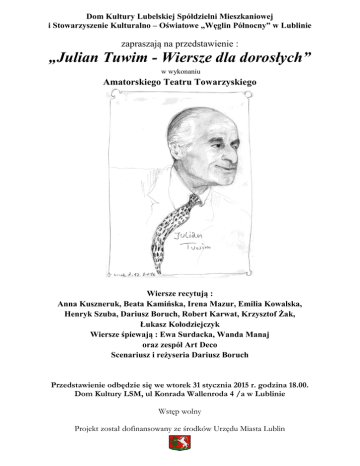 Dom Kultury Lubelskiej Spółdzielni Mieszkaniowej i Stowarzyszenie Kulturalno – Oświatowe „Węglin Północny” w Lublinie zapraszają na przedstawienie : „Julian Tuwim - Wiersze dla dorosłych” w wykonaniu Amatorskiego Teatru Towarzyskiego Wiersze recytują : Anna Kuszneruk, Beata Kamińska, Irena Mazur, Emilia Kowalska, Henryk Szuba, Dariusz Boruch, Robert Karwat, Krzysztof Żak, Łukasz Kołodziejczyk Wiersze śpiewają : Ewa Surdacka, Wanda Manaj oraz zespół Art Deco Scenariusz i reżyseria Dariusz Boruch Przedstawienie odbędzie się we wtorek 31 stycznia 2015 r. godzina 18.00. Dom Kultury LSM, ul Konrada Wallenroda 4 /a w Lublinie Wstęp wolny Projekt został dofinansowany ze środków Urzędu Miasta Lublin