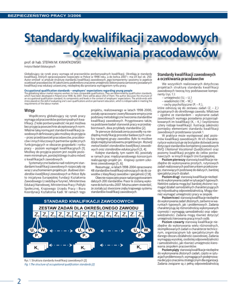 BEZPIECZEŃSTWO PRACY 3/2006 Standardy kwalifikacji zawodowych – oczekiwania pracodawców prof. dr hab. STEFAN M. KWIATKOWSKI Instytut Badañ Edukacyjnych Globalizuj¹cy siê rynek pracy wymaga od pracowników porównywalnych kwalifikacji. Określaj¹ je standardy kwalifikacji, których opracowywanie rozpoczêto w Polsce w 1998 roku, a do koñca 2007 r. ma ich byæ ok. 250. Autor omówi³ w artykule strukturê standardu kwalifikacji zawodowych, jego komponenty i poziomy w aspekcie oczekiwañ pracodawców. W zakoñczeniu podkreślono znaczenie umiejêtności dokonywania samooceny posiadanych kwalifikacji oraz edukacji ustawicznej, niezbêdnej dla sprostania wymaganiom rynku pracy. Occupational qualification standards – employers’ expectations regarding young people The globalizing labour market requires workers to have comparable qualifications. They are determined by qualification standards, which have been developed in Poland since 1998. By 2007, there will be about 250 of them. The author discusses the structure of an occupational qualification standard, its components and levels in the context of employers’ expectations. The article ends with stress placed on the skill of evaluating one’s own qualifications and on permanent education, which is indispensable in meeting the requirements of the labour market. Wstêp Wspó³czesny globalizuj¹cy siê rynek pracy wymaga od pracowników porównywalnych kwalifikacji. Z kolei porównywalnośæ nie jest mo¿liwa bez przyjêcia powszechnie akceptowanych norm. W³aśnie tak¹ norm¹ jest standard kwalifikacji zawodowych definiowany jako mo¿liwy do przyjêcia – przez przedstawicieli pracodawców, pracobiorców i innych kluczowych partnerów spo³ecznych funkcjonuj¹cych w obszarze gospodarki i rynku pracy – poziom wymagañ kwalifikacyjnych [1]. Mo¿liwy do przyjêcia poziom jest zwykle poziomem minimalnym, poni¿ej którego trudno mówiæ o kwalifikacjach zawodowych. Systematyczne badania nad rodzimymi standardami kwalifikacji zawodowych rozpoczê³y siê wraz z uruchomieniem projektu pn. Budowa standardów kwalifikacji zawodowych w Polsce. By³a to inicjatywa Europejskiej Fundacji Kszta³cenia Zawodowego (z siedzib¹ w Turynie), Ministerstwa Edukacji Narodowej, Ministerstwa Pracy i Polityki Spo³ecznej, Krajowego Urzêdu Pracy i Biura Koordynacji Kszta³cenia Kadr. W ramach tego projektu, realizowanego w latach 1998-2000, zosta³y opracowane i zweryfikowane empirycznie podstawy metodologiczne tworzenia standardów kwalifikacji zawodowych. Przygotowano tak¿e, na podstawie badañ stanowisk pracy w przedsiêbiorstwach, dwa przyk³ady standardów [2]. Te pierwsze doświadczenia pozwoli³y na niezbêdn¹ modyfikacjê procedur badawczych i analizy nastêpnej grupy zawodów. By³o to mo¿liwe dziêki miêdzynarodowemu projektowi pn. Rozwój metod badañ standardów kwalifikacji zawodowych oraz standardów edukacyjnych [3, 4]. Kolejne standardy, tym razem 40, powsta³y w ramach prac miêdzynarodowego konsorcjum realizuj¹cego projekt pn. Krajowy system szkolenia zawodowego [5, 6]. Reasumuj¹c, w latach 1998-2004 opracowano 48 standardów kwalifikacji odnosz¹cych siê do zawodów z klasyfikacji zawodów i specjalności [7,8]. Obecnie rozpoczêto prace nad przygotowaniem dalszych 200 standardów. Prace te zostan¹ wykonane do koñca roku 2007. Mo¿na zatem stwierdziæ, ¿e zosta³y ju¿ stworzone zrêby krajowego systemu standardów kwalifikacji zawodowych. Rys. 1. Struktura standardu kwalifikacji zawodowych [2] Fig. 1.The structure of occupational qualification standards [2] 2 Standardy kwalifikacji zawodowych a oczekiwania pracodawców We wszystkich realizowanych dotychczas projektach strukturê standardu kwalifikacji zawodowych tworz¹ trzy podstawowe komponenty (rys. 1.): – umiejêtności (U1 – Un) – wiadomości (W1 – Wn) – cechy psychofizyczne (P1 – Pn), które odnosz¹ siê do zestawu zadañ (Z1 – Zn) przypisanych do określonego zawodu. W³aściwe – zgodne ze standardem – wykonanie zadañ zawodowych wymaga posiadania przyporz¹dkowanych im kwalifikacji (K1 – Kn) (wyró¿niono cztery rodzaje kwalifikacji). Ilustracjê zale¿ności pomiêdzy elementami standardu kwalifikacji zawodowych przedstawia rysunek 1. W praktyce mo¿e wystêpowaæ piêæ poziomów kwalifikacji zawodowych. W ich charakterystyce wykorzystuje siê brytyjskie doświadczenia dotycz¹ce standardów kompetencji zawodowych NVQ (National Vocational Qualification) oraz poziomy kwalifikacji przyjête do celów porównawczych w innych krajach Unii Europejskiej. Poziom pierwszy stanowi¹ kwalifikacje niezbêdne do wykonywania prostych, rutynowych zadañ realizowanych pod kierunkiem prze³o¿onego, stanowi¹cych podstawê do dalszych, bardziej specjalistycznych dzia³añ. Poziom drugi stanowi¹ kwalifikacje niezbêdne do wykonywania zadañ w sytuacjach typowych. Niektóre zadania mog¹ byæ bardziej z³o¿one i wymagaæ dzia³añ samodzielnych charakteryzuj¹cych siê indywidualn¹ odpowiedzialności¹. Mog¹ równie¿ wymagaæ umiejêtności pracy w zespole. Poziom trzeci stanowi¹ kwalifikacje niezbêdne do wykonywania zadañ z³o¿onych, zarówno w warunkach typowych, jak i problemowych. Zadania charakteryzuj¹ siê ró¿norodności¹ wykonywanych czynności i wymagaj¹ samodzielności oraz odpowiedzialności. Zadania mog¹ równie¿ dotyczyæ umiejêtności kierowania prac¹ innych osób. Poziom czwarty stanowi¹ kwalifikacje niezbêdne do wykonywania wielu ró¿norodnych, skomplikowanych zadañ o charakterze technicznym, organizacyjnym lub specjalistycznym dla danego obszaru dzia³alności zawodowej. Zadania wymagaj¹ wysokiej, osobistej odpowiedzialności i samodzielności, jak równie¿ umiejêtności kierowania zespo³em pracowników. Poziom pi¹ty stanowi¹ kwalifikacje niezbêdne do wykonywania z³o¿onych zadañ, czêsto w sytuacjach problemowych, wymagaj¹cych podejmowania decyzji o znaczeniu strategicznym dla organizacji. Zadania zwi¹zane s