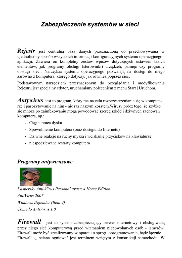 Zabezpieczenie systemów w sieci Rejestr jest centralną bazą danych przeznaczoną do przechowywania w ujednolicony sposób wszystkich informacji konfiguracyjnych systemu operacyjnego i aplikacji. Zawiera on kompletny zestaw wpisów dotyczących ustawień takich elementów, jak programy obsługi (sterowniki) urządzeń, pamięć czy programy obsługi sieci. Narzędzia systemu operacyjnego pozwalają na dostęp do niego zarówno z komputera, którego dotyczy, jak również poprzez sieć. Podstawowym narzędziem przeznaczonym do przeglądania i modyfikowania Rejestru jest specjalny edytor, uruchamiany poleceniem z menu Start | Uruchom. Antywirus jest to program, który ma na celu rozprzestrzenianie się w komputerze i pasożytowanie na nim - nie raz naszym kosztem.Wirusy prócz tego, że szybko się mnożą po zainfekowaniu mogą powodować szereg szkód i dziwnych zachowań komputera, np.: • Ciągła praca dysku • Spowolnienie komputera (oraz dostępu do Internetu) • Dziwne reakcje na ruchy myszą i wciskanie przycisków na klawiaturze • niespodziewane restarty komputera Programy antywirusowe: Kaspersky Anti-Virus Personal avast! 4 Home Edition AntiVirus 2007 Windows Defender (Beta 2) Comodo AntiVirus 1.0 Firewall jest to system zabezpieczający serwer internetowy i obsługiwaną przez niego sieć komputerową przed włamaniem niepowołanych osób - lamerów. Firewall może być zrealizowany w oparciu o sprzęt, oprogramowanie, bądź łącznie. Firewall -,, ściana ogniowa'' jest terminem wziętym z konstrukcji samochodu. W samochodach firewalle fizycznie oddzielają silnik od pasażerów. To znaczy, że chronią one pasażerów w wypadku gdy silnik zapali się cały czas dostarczając kontroli nad nim. Komputerowe (sprzętowe) firewalle są urządzeniami, które chronią sieci prywatne od części publicznej (takiej jak Internet). Najbardziej znane pakiety to: ZoneAlarm Security Suite 5 Norton Internet Security 2005 mks_vir 2005 AntiVirenKit Internet Security 2004 Alternatywne systemy LINUX jest bitowym systemem operacyjnym zaprojektowanym do działania na komputerach PC bazujących co najmniej na procesorze 80386. Formalnie rzecz biorąc Linux pracuje jak wyżej opisany system operacyjny Unix, co oznacza, że odpowiada na wszystkie standardowe polecenia i wykonuje programy systemu UNIX. UNIX oznacza pewną rodzinę zaawansowanych systemów operacyjnych do poważnych zastosowań i jest wspólną nazwą dla całej grupy rozmaitych systemów operacyjnych takich, jak Solaris, Digital Unix, SCO, BSD i ich różnych odmian.Zdecydowana większość tych systemów jest własnością jakiejś wielkiej komercyjnej firmy (np. Sun czy Hewlett Packard). Tym, co łączy je wszystkie jest podstawowy, oryginalny i chroniony prawami autorskimi kod Unixa stworzony przez firmę AT&T. MAC OS jest to złożony system operacyjny dla komputerów Macintosh opracowany w 2000 roku w amerykańskiej firmie Apple Computer.Mac OS powstał w oparciu o mikrojądro Mach oraz usługi i narzędzia zaczerpnięte z projektów NetBSD oraz FreeBSD.Jego podstawą jest opracowany w Apple Computer system operacyjny Darwin.Graficzny interfejs użytkownika nosi nazwę Aqua i jest własnym rozwiązaniem opracowanym przez Apple z wykorzystaniem doświadczeń i wzorów z poprzednich systemów tej firmy. Apple udostępnia także własną wersję X Windows System. Silne strony tego systemu to: ● możliwość uruchamiania programów napisanych dla wcześniejszych wersji systemu MacOs ● łatwość adaptacji, kompilacji i wykorzystania oprogramowania stworzonego dla systemów uniksowych, zwłaszcza typu BSD ● Quartz Extreme, format PDF jako podstawa interfejsu graficznego ● ColorSync, przemysłowej jakości system zarządzania kolorem ● wydajny silnik Open GL ● ma wbudowane zaawansowane narzędzia sieciowe Architektura systemu Mac OS X CARBON COCOA JAVA QUARTZ OPEN GL QUICK TIME DARWIN