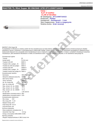Informacje o produkcie Utworzono 04-03-2017 MASTER TL Mini Super 80 8W/840 1FM 8711500716422 Cena : 9,27 zł (netto) 11,40 zł (brutto) er m ar k Nr katalogowy : 8711500716422 Producent : Philips Dostępność : Dostępność - 3 dni Stan magazynowy : brak w magazynie Średnia ocena : brak recenzji MASTER TL Mini Super 80 Ta świetlówka TL Miniature (o średnicy bańki 16 mm) charakteryzuje się małą średnicą. Pozwala to na konstruowanie zminiaturyzowanych układów oświetlenia, łącznie z zasilaniem z niskonapięciowych źródeł prądu stałego. Lampa świetnie nadaje się do zastosowań wymagających oddawania barw i skuteczności lepszych niż w przypadku barw standardowych oraz w miejscach o ograniczonej przestrzeni: w holach, na klatkach schodowych budynków mieszkalnych, jako oświetlenie wbudowane w meble, do oświetlania luster i szaf, jako oświetlenie szyldów, w roli oświetlenia awaryjnego itd. Charakterstyki ogólne Trzonek G5 Kształt bańki T5 [16 mm] Trwałość 10% EM 5000 hr Trwałość 10% z podgrz., 3h 5000 hr Trwałość do 10% bez podgrz 3000 hr Trwałość 50% EM 10000 hr Trwałość 50% z podgrz., 3h 10000 hr at Trwałość średnia bez podgrz EL 7000 hr Charakterystyki świetlne Kod barwy 840 [Tb 4000K] Wskaźnik oddawania barw Ra 85 Ra8 Opis barwy (tekst) chłodnobiała 4000 K w Temp. barwowa Str. św. lampy EM 470 Lm Skut. św. lampy EM 59 Lm/W Wsp. utrzym. str. św. 2000h 85 % Wsp. utrzym. str. św. 5000h 77 % Wsp. utrzym. str. św. 10000h 71 % Śr. lum. EM 1.05 cd/cm2 Współrzędna chromatyczności X 381 Współrzędna chromatyczności Y 379 Charakterystyki elektryczne Moc lampy 8W Moc lampy EM 7.1 W Napięcie lampy 56 V Prąd lampy EM 0.15 A Przyciemnianie tak Ochrona środowiska Klasa wydajności energetycznej A Zawartość rtęci (Hg) 3.0 mg Energy consumption kWh/1000h 8 kWh Wymiary produktu Długość międzytrzonkowa A 288.3 (max) mm Wygenerowano w programie www.oscGold.com Długość B 293.0 (min), 295.4 (max) mm Długość całkowita C 302.5 (max) mm Średnica D 16 (max) mm Dane produktu Kod zamówienia 716422 27 Kod produktu 871150071642227 Nazwa produktu MASTER TL Mini Super 80 8W/840 1FM Nazwa produktu na zamówieniu MST TL Mini 8W/840 1FM/10X25CC Liczba sztuk w opakowaniu 1 Opakowanie zbiorcze 10X25CC Liczba opakowan w kartonie zbiorczym 250 Kod kreskowy na produkcie 8711500716422 Kod kreskowy na opakowaniu posrednim - EAN2 8711500716439 8711500716446 Kod logistyczny - 12NC 928001008450 Kod ILCOS FD-8/40/1B-E-G5 er m ar k Kod kreskowy na opakowaniu zbiorczym 22.210 gr w at Waga netto 1 szt.