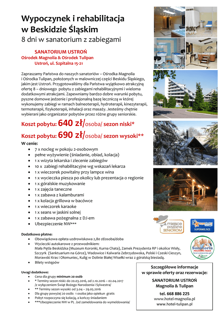 Wypoczynek i rehabilitacja w Beskidzie Śląskim 8 dni w sanatorium z zabiegami SANATORIUM USTROŃ Ośrodek Magnolia & Ośrodek Tulipan Ustroń, ul. Szpitalna 15-21 Zapraszamy Państwa do naszych sanatoriów – Ośrodka Magnolia i Ośrodka Tulipan, położonych w malowniczej części Beskidu Śląskiego, jakim jest Ustroń. Przygotowaliśmy dla Państwa wyjątkowo atrakcyjną ofertę 8 – dniowego pobytu z zabiegami rehabilitacyjnymi i wieloma dodatkowymi atrakcjami. Zapewniamy bardzo dobre warunki pobytu, pyszne domowe jedzenie i profesjonalną bazę leczniczą w której wykonujemy zabiegi w ramach balneoterapii, hydroterapii, kinezyterapii, termoterapii, fizykoterapii, inhalacji oraz masaży. Jesteśmy chętnie wybierani jako organizator pobytów przez różne grupy seniorskie. 640 zł/osoba/ sezon niski* Koszt pobytu: 690 zł/osoba/ sezon wysoki** Koszt pobytu: W cenie: 7 x nocleg w pokoju 2-osobowym pełne wyżywienie (śniadanie, obiad, kolacja) 1 x wizyta lekarska i zlecenie zabiegów 10 x zabiegi rehabilitacyjne wg wskazań lekarza 1 x wieczorek powitalny przy lampce wina 1 x wycieczka piesza po okolicy lub prezentacja o regionie 1 x góralskie muzykowanie 1 x zajęcia taneczne 1 x zabawa z kalamburami 1 x kolacja grillowa w bacówce 1 x wieczorek karaoke 1 x seans w jaskini solnej 1 x zabawa pożegnalna z DJ-em Ubezpieczenie NW*** Dodatkowo płatne: Obowiązkowa opłata uzdrowiskowa 2,80 zł/osoba/doba Wycieczki autokarowe z przewodnikiem: Mała Pętla Beskidzka (Muzeum Koronki, Kurna Chata), Zamek Prezydenta RP i okolice Wisły, Szczyrk (Sanktuarium na Górce), Wadowice i Kalwaria Zebrzydowska, Polski i Czeski Cieszyn, Morawski Kras i Ołomuniec, Kulig w Dolinie Białej Wisełki wraz z góralską biesiadą. Bilety wstępów Uwagi dodatkowe: Cena dla grupy minimum 20 osób * Terminy sezon niski: do 20.03.2016, od 2.10.2016 – 02.04.2017 /z wyłączeniem Świąt Bożego Narodzenia i Sylwestra/ ** Terminy sezon wysoki: od 3.04 – 29.05.2016 Dla grupy powyżej 20 osób: 1 osoba jako opiekun gratis Pobyt rozpoczyna się kolacją, a kończy śniadaniem ***Ubezpieczenie NW w PL /od zameldowania do wymeldowania/ Szczegółowe informacje w sprawie oferty oraz rezerwacje: SANATORIUM USTROŃ Magnolia & Tulipan tel. 668 886 225 www.hotel-magnolia.pl www.hotel-tulipan.pl