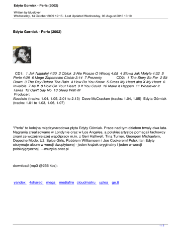 Edyta Gorniak - Perla (2002) Written by bluelover Wednesday, 14 October 2009 12:15 - Last Updated Wednesday, 03 August 2016 13:10 Edyta Gorniak - Perła (2002) CD1: 1 Jak Najdalej 4:30 2 Obłok 3 Nie Prosze O Wiecej 4:08 4 Slowa Jak Motyle 4:32 5 Perla 4:28 6 Moge Zapomniec Ciebie 3:14 7 Prezenty CD2: 1 The Story So Far 2 Sit Down 3 The Day Before The Rain 4 How Do You Know 5 Cross My Heart aka X My Heart 6 Invisible 7 As If 8 Hold On Your Heart 9 If You Could 10 Make It Happen 11 Whatever It Takes 12 Can't Say No 13 Sleep With M Producer: Absolute (tracks: 1.04, 1.05, 2.01 to 2.13) Dave McCracken (tracks: 1.04, 1.05) Edyta Górniak (tracks: 1.01 to 1.03, 1.06, 1.07) "Perła" to kolejna międzynarodowa płyta Edyty Górniak. Prace nad tym dziełem trwały dwa lata. Nagrania zrealizowano w Londynie oraz w Los Angeles, a polskiej artystce pomagali fachowcy znani ze wcześniejszej współpracy m.in. z Geri Halliwell, Tiną Turner, Georgem Michaelem, Depeche Mode, U2, Spice Girls, Robbiem Williamsem i Joe Cockerem! Polski fan Edyty otrzymuje album w wersji dwupłytowej - jeden krążek oryginalny i jeden w wersji polskojęzycznej. ---muzyka.onet.pl download (mp3 @256 kbs): yandex 4shared mega mediafire cloudmailru uplea ge.tt 1/2 Edyta Gorniak - Perla (2002) Written by bluelover Wednesday, 14 October 2009 12:15 - Last Updated Wednesday, 03 August 2016 13:10 back 2/2