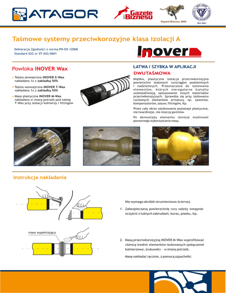 Gepard Biznesu 2009 Taśmowe systemy przeciwkorozyjne klasa izolacji A Deklaracja Zgodności z normą PN-EN 12068 Standard IGG nr ST-IGG-0601 Powłoka INOVER Wax ŁATWA I SZYBKA W APLIKACJI DWUTAŚMOWA Taśma zewnętrzna INOVER E-Wax nakładana 1x z zakładką 50% Taśma wewnętrzna INOVER T-Wax nakładana 1x z zakładką 50% Masa plastyczna INOVER M-Wax nakładana w miarę potrzeb pod taśmę T-Wax przy izolacji kołnierzy i fittingów Miękka, plastyczna izolacja przeciwkorozyjna powierzchni stalowych rurociągów podziemnych i nadziemnych. Przeznaczona do izolowania elementów, których nieregularne kształty uniemożliwiają zastosowanie innych materiałów przeciwkorozyjnych. Sprawdza się przy izolowaniu ruchomych elementów armatury, np. zaworów, kompensatorów, zasuw, fittingów, itp. Przez cały okres użytkowania pozostaje plastyczna, nie twardnieje, nie niszczy gwintów. Po demontażu elementu istnieje możliwość ponownego wykorzystania masy. Instrukcja nakładania Nie wymaga obróbki strumieniowo-ściernej. 1. Zabezpieczaną powierzchnię rury należy wstępnie oczyścić z luźnych zabrudzeń, kurzu, piasku, itp. masa wypełniająca 2. Masą przeciwkorozyjną INOVER M-Wax wyprofilować różnicę średnic elementów izolowanych (połączenie kołnierzowe, śrubunek) - w miarę potrzeb. Masę nakładać ręcznie, z pomocą szpachelki. min. 15 cm 3. Taśmę wewnętrzną INOVER T-Wax nakładać z minimalną zakładką 50%. Dłonią profilować taśmę optymalizując kształt izolacji. taśma wewnętrzna min. 20 cm 4. Taśmę zewnętrzną INOVER E-Wax nakładać z naciągiem z minimalną zakładką 50%. Taśma ma dociskać i chronić mechanicznie taśmę wewnętrzną do powierzchni elementu. taśma zewnętrzna Specyfikacja techniczna Właściwości powłoki CPS Grubość POWŁOKA INOVER Wax > 3,10 mm Paroprzepuszczalność < 0.6 g/m2/24h Temperatura pracy -30°C do +55°C Temperatura stosowania Kolor -5°C do +40°C żółty zielony www.atagor.com, www.atagor.commail: [email protected], tel.: +12 357 21 81, fax: +12 357 21 82 www.atagor.pl 3.2012-D.01-ki.pt.o-A Edycja 2014-08 Kraków: ul.sp. Wł. Żeleńskiego 70/6, 70/6, 31-35331-353 Kraków ATAGOR zul. o.o. Biuro Kraków: Wł. Żeleńskiego Kraków, tel./fax: +48 12 626 36 75, +48 12 626 36 74, e-mail: [email protected] Poznań: ul. Niepodległości 11b, 62-030 Poznań-Luboń ul. Wł. Żeleńskiego 70/6, 31-353 Kraków Biuro Poznań: ul. Niepodległości 11b, 62-030 Poznań-Luboń, tel.: +48 61 624 37 66/67, fax: +48 61 893 30 23, e-mail: [email protected] Warszawa: ul. 357 Sękocińska 38, +48 Wolica k.05-077 Warszawy, 05-830 Nadarzyn tel.:Warszawa: +48 12 21Mazowiecka 81, fax: 12 357 21 82 Biuro ul. 36e, Warszawa-Wesoła, tel.: +48 22 497 18 66, fax: +48 22 497 18 67, e-mail: [email protected] e-mail: [email protected]