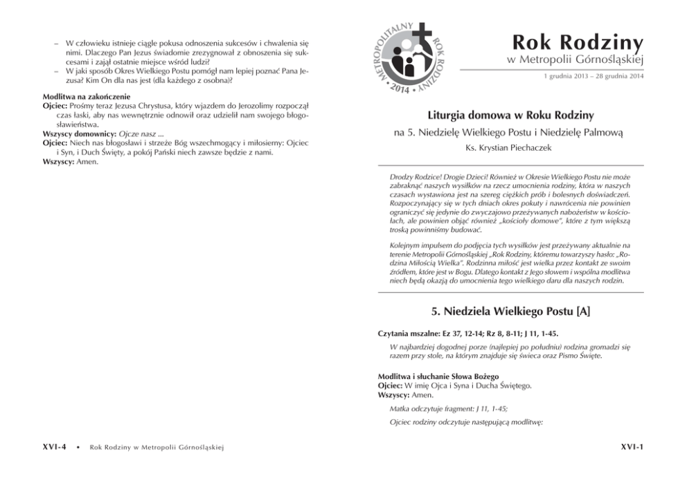 – W człowieku istnieje ciągle pokusa odnoszenia sukcesów i chwalenia się nimi. Dlaczego Pan Jezus świadomie zrezygnował z obnoszenia się sukcesami i zajął ostatnie miejsce wśród ludzi? – W jaki sposób Okres Wielkiego Postu pomógł nam lepiej poznać Pana Jezusa? Kim On dla nas jest (dla każdego z osobna)? Modlitwa na zakończenie Ojciec: Prośmy teraz Jezusa Chrystusa, który wjazdem do Jerozolimy rozpoczął czas łaski, aby nas wewnętrznie odnowił oraz udzielił nam swojego błogosławieństwa. Wszyscy domownicy: Ojcze nasz ... Ojciec: Niech nas błogosławi i strzeże Bóg wszechmogący i miłosierny: Ojciec i Syn, i Duch Święty, a pokój Pański niech zawsze będzie z nami. Wszyscy: Amen. Rok Rodziny w Metropolii Górnośląskiej 1 grudnia 2013 – 28 grudnia 2014 Liturgia domowa w Roku Rodziny na 5. Niedzielę Wielkiego Postu i Niedzielę Palmową Ks. Krystian Piechaczek Drodzy Rodzice! Drogie Dzieci! Również w Okresie Wielkiego Postu nie może zabraknąć naszych wysiłków na rzecz umocnienia rodziny, która w naszych czasach wystawiona jest na szereg ciężkich prób i bolesnych doświadczeń. Rozpoczynający się w tych dniach okres pokuty i nawrócenia nie powinien ograniczyć się jedynie do zwyczajowo przeżywanych nabożeństw w kościołach, ale powinien objąć również „kościoły domowe”, które z tym większą troską powinniśmy budować. Kolejnym impulsem do podjęcia tych wysiłków jest przeżywany aktualnie na terenie Metropolii Górnośląskiej „Rok Rodziny, któremu towarzyszy hasło: „Rodzina Miłością Wielka”. Rodzinna miłość jest wielka przez kontakt ze swoim źródłem, które jest w Bogu. Dlatego kontakt z Jego słowem i wspólna modlitwa niech będą okazją do umocnienia tego wielkiego daru dla naszych rodzin. 5. Niedziela Wielkiego Postu [A] Czytania mszalne: Ez 37, 12-14; Rz 8, 8-11; J 11, 1-45. W najbardziej dogodnej porze (najlepiej po południu) rodzina gromadzi się razem przy stole, na którym znajduje się świeca oraz Pismo Święte. Modlitwa i słuchanie Słowa Bożego Ojciec: W imię Ojca i Syna i Ducha Świętego. Wszyscy: Amen. Matka odczytuje fragment: J 11, 1-45; Ojciec rodziny odczytuje następującą modlitwę: XVI- 4 • Rok Rodziny w Metropolii Górnośląskiej XVI-1 Módlmy się: Prosimy Cię, Panie, nasz Boże, udziel nam łaski, abyśmy gorliwie naśladowali miłość Twojego Syna, który oddał własne życie za zbawienie świata. Przez naszego Pana Jezusa Chrystusa, Twojego Syna, który z Tobą żyje i króluje w jedności Ducha Świętego, Bóg, przez wszystkie wieki wieków. Wszyscy: Amen. Rozmowa na temat odczytanej Ewangelii Opis dzisiejszej Ewangelii przenosi nas do Betanii, małej miejscowości położonej blisko Jerozolimy. W Betanii mieszkało zaprzyjaźnione z Panem Jezusem rodzeństwo: Maria, Marta i Łazarz. Kiedy Pan Jezus usłyszał o chorobie Łazarza, postanowił jeszcze raz wybrać się do Betanii, jednak nie od razu wyruszył w drogę. Kiedy w końcu przybył na miejsce, okazało się, że Łazarz zmarł kilka dni wcześniej, został pochowany, a jego siostry rozpoczęły czas żałoby. Można w tej sytuacji powiedzieć, że Pan Jezus tym razem się po prostu spóźnił. Wielu ludzi zastanawia się często nad tym, w jaki sposób Pan Bóg wysłuchuje naszych modlitw. Bywa, że nie rozumiemy dlaczego niekiedy tak długo każe nam czekać na odpowiedź. Zdarza się też, że w końcu spełnia naszą prośbę, jednak na swój, dla nas mało zrozumiały, sposób. Patrząc na postawę Jezusa, możemy mimo wszystko powiedzieć, że wiara w Jego moc ożywia nas i sprawia, że nie musimy się niczego obawiać – w tym nawet śmierci. – Jak zareagował Pan Jezus na wiadomość o chorobie Łazarza? – Dlaczego uczniowie odradzali Panu Jezusowi wizytę w Betanii (w. 8-16)? – Co można powiedzieć o wierze ludzi, których Pan Jezus spotkał w Betanii? – Czy ten niezwykły znak, którego dokonał Jezus, zmienił coś w życiu mieszkańców Betanii? Jakimi słowami Pan Jezus starał się rozbudzić ich wiarę (w. 25-26)? – Czego uczy nas dzisiejsza Ewangelia? Czy z chwilą śmierci człowieka rzeczywiście wszystko się kończy? Jak powinniśmy patrzeć na prawdę o przemijaniu człowieka? – Już za tydzień przeżyjemy Niedzielę Palmową, a następnie Wielki Tydzień. Kim jest dla mnie Pan Jezus? Czy rozpoznaję w Nim Zbawiciela świata, który ma moc, aby pokonać śmierć i dać nowe życie? Niedziela Palmowa [A] Czytania mszalne: Iz 50, 4-7; Flp 2, 8-9; Mt 21, 1-11. W najbardziej dogodnej porze (najlepiej po południu) rodzina gromadzi się razem przy stole, na którym znajduje się świeca oraz Pismo Święte. Modlitwa i słuchanie Słowa Bożego Ojciec: W imię Ojca i Syna i Ducha Świętego. Wszyscy: Amen. Matka odczytuje fragment: Mt 21, 1-11; Ojciec rodziny odczytuje następującą modlitwę: Módlmy się: Wszechmogący, wieczny Boże, aby dać ludziom przykład pokory do naśladowania, sprawiłeś, że nasz Zbawiciel przyjął ciało i poniósł śmierć na krzyżu; daj nam pojąć naukę płynącą z Jego męki i zasłużyć na udział w Jego zmartwychwstaniu. Który z Tobą żyje i króluje w jedności Ducha Świętego Bóg, przez wszystkie wieki wieków. Wszyscy: Amen. Modlitwa na zakończenie Ojciec: Prośmy teraz Jezusa Chrystusa, który wskrzesił z martwych Łazarza, aby pomógł nam pokonać mroki grzechu oraz udzielił nam swojego błogosławieństwa. Wszyscy domownicy: Ojcze nasz ... Ojciec: Niech nas błogosławi i strzeże Bóg wszechmogący i miłosierny: Ojciec i Syn, i Duch Święty, a pokój Pański niech zawsze będzie z nami. Wszyscy: Amen. Rozmowa na temat odczytanej Ewangelii Niedziela Palmowa, którą dziś przeżywamy, ma w sobie coś z atmosfery wielkiego święta. Jako uczniowie Pana Jezusa chcielibyśmy pewnie, aby wszyscy ludzie dobrze zapamiętali Jego uroczysty wjazd do Jerozolimy oraz zachowanie ludzi, którzy – jak jeszcze nigdy dotąd 