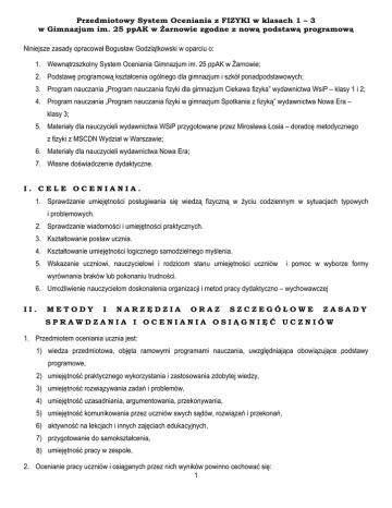 Przedmiotowy System Oceniania z FIZYKI w klasach 1 – 3 w Gimnazjum im. 25 ppAK w Żarnowie zgodne z nową podstawą programową Niniejsze zasady opracował Bogusław Godziątkowski w oparciu o: 1. Wewnątrzszkolny System Oceniania Gimnazjum im. 25 ppAK w Żarnowie; 2. Podstawę programową kształcenia ogólnego dla gimnazjum i szkół ponadpodstawowych; 3. Program nauczania „Program nauczania fizyki dla gimnazjum Ciekawa fizyka” wydawnictwa WsiP – klasy 1 i 2; 4. Program nauczania „Program nauczania fizyki w gimnazjum Spotkania z fizyką” wydawnictwa Nowa Era – klasy 3; 5. Materiały dla nauczycieli wydawnictwa WSiP przygotowane przez Mirosława Łosia – doradcę metodycznego z fizyki z MSCDN Wydział w Warszawie; 6. Materiały dla nauczycieli wydawnictwa Nowa Era; 7. Własne doświadczenie dydaktyczne. I. CELE OCENIANIA. 1. Sprawdzanie umiejętności posługiwania się wiedzą fizyczną w życiu codziennym w sytuacjach typowych i problemowych. 2. Sprawdzanie wiadomości i umiejętności praktycznych. 3. Kształtowanie postaw ucznia. 4. Kształtowanie umiejętności logicznego samodzielnego myślenia. 5. Wskazanie uczniowi, nauczycielowi i rodzicom stanu umiejętności uczniów i pomoc w wyborze formy wyrównania braków lub pokonaniu trudności. 6. Umożliwienie nauczycielom doskonalenia organizacji i metod pracy dydaktyczno – wychowawczej II. METODY I NARZĘDZIA ORAZ SZCZEGÓŁOWE ZASADY SPRAWDZANIA I OCENIANIA OSIĄGNIĘĆ UCZNIÓW 1. Przedmiotem oceniania ucznia jest: 1) wiedza przedmiotowa, objęta ramowymi programami nauczania, uwzględniająca obowiązujące podstawy programowe, 2) umiejętność praktycznego wykorzystania i zastosowania zdobytej wiedzy, 3) umiejętność rozwiązywania zadań i problemów, 4) umiejętność uzasadniania, argumentowania, przekonywania, 5) umiejętność komunikowania przez uczniów swych sądów, rozwiązań i przekonań, 6) aktywność na lekcjach i innych zajęciach edukacyjnych, 7) przygotowanie do samokształcenia, 8) umiejętność pracy w zespole, 2. Ocenianie pracy uczniów i osiąganych przez nich wyników powinno cechować się: 1 systematycznością – gdyż częste ocenianie osiągnięć uczniów ma ogromne znaczenie motywujące, różnorodnością – ponieważ oceniamy wiedzę i umiejętności uczniów oraz ich pracę, powinniśmy stosować oceny z odpowiedzi ustnych, prac domowych, sprawdzianów, testów, kartkówek, a zwłaszcza do częstego oceniania aktywnego uczestnictwa ucznia w lekcji, obiektywnością – niemniej trzeba zawsze pamiętać, aby oceniać nie tylko wiedzę i umiejętności ucznia, ale również jego starania i postępy, jakie poczynił, co również spełnia rolę motywującą, trafnością – zadania, sprawdziany i pytania testowe powinny być właściwie konstruowane i adekwatne do zagadnień omawianych na lekcji i przedstawionych w podręczniku. Powinny one możliwie najszerzej obejmować treści programowe lub zakres umiejętności, które chcemy sprawdzić, rzetelnością – ocena powinna odzwierciedlać rzeczywistą wiedzę i umiejętności ucznia. 3. Ocenianiu podlegać będą następujące formy aktywności ucznia: oceny czerwone waga 0,7 – ocenianie głównie wg skali % WSO: a) sprawdziany pisemne podsumowujące większe partie materiału; b) efektywny udział w konkursach przedmiotowych – wg oceny dokonanej przez nauczyciela; c) testy kompetencji umożliwiające pewne stwierdzenie samodzielności pracy ucznia; oceny niebieskie waga 0,3 – ocenianie w miarę możliwości wg skali % WSO: A. kartkówki sprawdzające z maksymalnie 3 ostatnich lekcji; B. interaktywne prace domowe na internetowych platformach edukacyjnych; C. odpowiedzi ustne sprawdzające z maksymalnie 3 ostatnich lekcji; D. aktywność ucznia podczas zajęć; E. grupowa praca ucznia; F. działalność pozalekcyjna ucznia; G. prace domowe; H. sposób prowadzenia zeszytu przedmiotowego; I. projekty edukacyjne lub referaty tematyczne; J. sporządzanie pomocy dydaktycznych lub innych prac wytwórczych związanych z fizyką; K. prace nadobowiązkowe; L. wykonywanie doświadczeń; 4. Aby zapewnić maksymalny obiektywizm w przypadku ocen wagi 0,3 nie pozwalających na bezpośrednie stosowanie skali % WSO wprowadza się dodatkowe KRyteria Pomocnicze: 2 KRP 1 przydatne w podpunktach : C) D) E) F) Przedstawia bezbłędnie omawiany problem bardzo sprawnie posługując się aparatem matematycznym, wykorzystuje wiedzę i metody wykraczające poza zrealizowany materiał, elokwentnie posługuje się nazewnictwem fizycznym, na bieżąco analizuje wyniki wyciągając wnioski i adekwatnie koryguje postępowanie Dopuszczalny pojedynczy błąd w nazewnictwie korygowany samodzielnie przez ucznia; uczeń odnajduje błąd niematematyczny w tłumaczeniach nauczyciela np. nieprecyzyjne sformułowanie w interaktywnych formularzach powtórzeniowych Wszystkie odpowiedzi udzielane są samodzielnie bez zbędnej zwłoki, dopuszczalne nieliczne błędy w nazewnictwie lub rozumowaniu fizycznym Przynajmniej połowa odpowiedzi udzielona w sposób samodzielny bez zbędnej zwłoki Przynajmniej jedna prawidłowa odpowiedź z kilku, udzielanie odpowiedzi przy wsparciu nauczyciela lub wyznaczonych rówieśników Całkowicie błędne odpowiedzi lub wypowiedzi nie na temat, brak samodzielności, wykorzystywanie podpowiedzi lub niedozwolonych pomocy Brak działań zlecanych przez nauczyciela 6 pkt - cel 5 pkt - bdb 4 pkt - db 3 pkt - dst 2 pkt - dop 1 pkt - ndst 0 pkt - ndst KRP 2 przydatne w podpunktach : G) H) I) J) K) Praca kompletna, bezbłędna, estetyczna, wykonana bardzo starannie, oryginalny sposób rozwiązania lub przedstawienia Praca kompletna, liczbowo bezbłędna, dopuszczalne jedynie drobne nieprawidłowości opisowe lub estetyczne Praca skończona z poprawnym tokiem myślenia, dopuszczalne drobne, nieliczne pomyłki matematyczne, kompetencyjne lub braki estetyczne Praca skończona z poprawnym tokiem myślenia lecz liczne błędy rachunkowe l