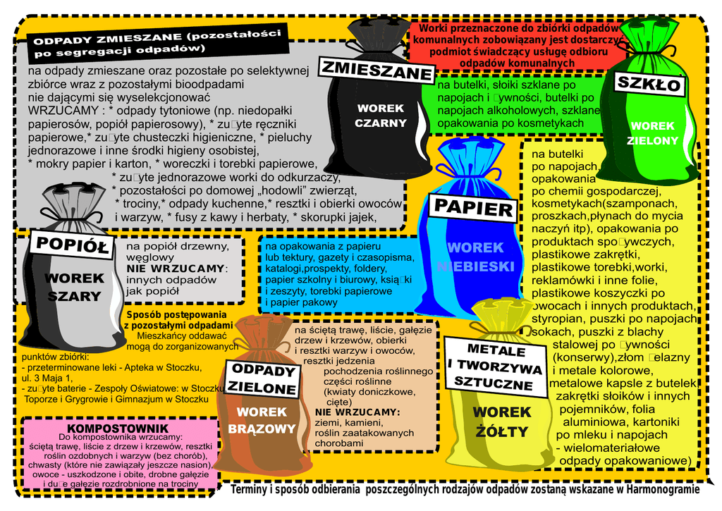 Worki przeznaczone do zbiórki odpadów komunalnych zobowiązany jest dostarczyć podmiot świadczący usługę odbioru odpadów komunalnych i ANE (pozostałośc ODPADY ZMIESZ padów) po se gregacji od na odpady zmieszane oraz pozostałe po selektywnej ZMIESZANE SZKŁO zbiórce wraz z pozostałymi bioodpadami na butelki, słoiki szklane po napojach i żywności, butelki po nie dającymi się wyselekcjonować WOREK napojach alkoholowych, szklane WRZUCAMY : * odpady tytoniowe (np. niedopałki opakowania po kosmetykach CZARNY papierosów, popiół papierosowy), * zużyte ręczniki WOREK papierowe,* zużyte chusteczki higieniczne, * pieluchy ZIELONY jednorazowe i inne środki higieny osobistej, na butelki * mokry papier i karton, * woreczki i torebki papierowe, po napojach, * zużyte jednorazowe worki do odkurzaczy, opakowania * pozostałości po domowej „hodowli” zwierząt, po chemii gospodarczej, kosmetykach(szamponach, * trociny,* odpady kuchenne,* resztki i obierki owoców PAPIER proszkach,płynach do mycia i warzyw, * fusy z kawy i herbaty, * skorupki jajek, naczyń itp), opakowania po produktach spożywczych, POPIÓŁ na popiół drzewny, na opakowania z papieru WOREK plastikowe zakrętki, lub tektury, gazety i czasopisma, węglowy NIEBIESKI plastikowe torebki,worki, katalogi,prospekty, foldery, NIE WRZUCAMY: WOREK papier szkolny i biurowy, książki innych odpadów reklamówki i inne folie, i zeszyty, torebki papierowe jak popiół plastikowe koszyczki po SZARY i papier pakowy owocach i innych produktach, Sposób postępowania styropian, puszki po napojach, z pozostałymi odpadami na ściętą trawę, liście, gałęzie sokach, puszki z blachy Mieszkańcy oddawać drzew i krzewów, obierki stalowej po żywności mogą do zorganizowanych METALE i resztki warzyw i owoców, punktów zbiórki: (konserwy),złom żelazny resztki jedzenia I TWORZYW - przeterminowane leki - Apteka w Stoczku, ODPADY A i metale kolorowe, pochodzenia roślinnego ul. 3 Maja 1, S części roślinne Z T U CZNE metalowe kapsle z butelek, - zużyte baterie - Zespoły Oświatowe: w Stoczku, ZIELONE (kwiaty doniczkowe, zakrętki słoików i innych Toporze i Grygrowie i Gimnazjum w Stoczku cięte) pojemników, folia NIE WRZUCAMY: WOREK WOREK aluminiowa, kartoniki ziemi, kamieni, KOMPOSTOWNIK BRĄZOWY roślin zaatakowanych ŻÓŁTY po mleku i napojach Do kompostownika wrzucamy: ściętą trawę, liście z drzew i krzewów, resztki roślin ozdobnych i warzyw (bez chorób), chwasty (które nie zawiązały jeszcze nasion), owoce - uszkodzone i obite, drobne gałęzie i duże gałęzie rozdrobnione na trociny chorobami - wielomateriałowe odpady opakowaniowe) Terminy i sposób odbierania poszczególnych rodzajów odpadów zostaną wskazane w Harmonogramie