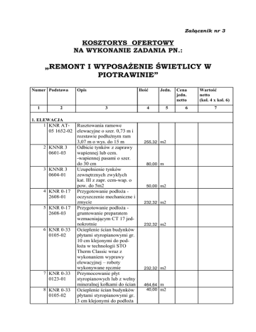 Załącznik nr 3 KOSZTORYS OFERTOWY NA WYKONANIE ZADANIA PN.: „REMONT I WYPOSAŻENIE ŚWIETLICY W PIOTRAWINIE” Numer Podstawa 1 2 Opis Ilość 3 Jedn. 4 5 1. ELEWACJA 1 KNR AT- 2 3 4 5 6 7 8 Rusztowania ramowe 05 1652-02 elewacyjne o szer. 0,73 m i rozstawie podłużnym ram 3,07 m o wys. do 15 m KNNR 3 Odbicie tynków z zaprawy 0601-03 wapiennej lub cem. -wapiennej pasami o szer. do 30 cm KNNR 3 Uzupełnienie tynków 0604-01 zewnętrznych zwykłych kat. III z zapr. cem-wap. o pow. do 5m2 KNR 0-17 Przygotowanie podłoża 2608-01 oczyszczenie mechaniczne i zmycie KNR 0-17 Przygotowanie podłoża 2608-03 gruntowanie preparatem wzmacniającym CT 17 jednokrotnie KNR 0-33 Ocieplenie ścian budynków 0105-02 płytami styropianowymi gr. 10 cm klejonymi do podłoża w technologii STO Therm Classic wraz z wykonaniem wyprawy elewacyjnej – roboty wykonywane ręcznie KNR 0-33 Przymocowanie płyt 0123-01 styropianowych lub z wełny mineralnej kołkami do ścian KNR 0-33 Ocieplenie ścian budynków 0105-02 płytami styropianowymi gr. 3 cm klejonymi do podłoża 255,32 m2 80,00 m 50,00 m2 232,32 m2 232,32 m2 232,32 m2 464,64 m 40,00 m2 Cena jedn. netto 6 Wartość netto (kol. 4 x kol. 6) 7 9 KNR 0-33 0121-01 10 KNR 0-33 0101-05 11 KNR 0-17 0929-01 12 KNR 0-17 0928-01 13 KNR 0-33 w technologii STO Therm Classic wraz z wykonaniem wyprawy elewacyjnej – roboty wykonywane ręcznie Ochrona narożników wypukłych Wielowarstwowe systemy ociepleń ścian "STO" szpachlowanie zbrojone jedną warstwą siatki z włókna szklanego (roboty wykonywane ręczne) Wyprawa elewacyjna cienkowarstwowa o fakturze rustykalnej CERESIT - nałożenie na podłoże farby gruntującej CT 16 - pierwsza warstwa Wyprawa elewacyjna cienkowarstwowa z tynku mineralnego strukturalnego CERESIT CT 89 grubości 2 mm z gotowej suchej mieszanki wyk. ręcznie na uprzednio przygotowanym podłożu metodą "mokre na mokre" na ścianach płaskich i powierzchniach poziomych Malowanie elewacji 0128-01 14 KNR 0-33 0124-05 109,06 m 232,32 m2 232,32 m2 170,85 m2 170,85 m2 Tynki elewacyjne organiczne na bazie żywicy syntetycznej z różnobarwnych kamieni o walorach tynku zmywalnego - Sto-Superlit o uziarnieniu 1,5 mm, wykonywane ręcznie 61,47 m2 2. ROBOTY BUDOWLANE 15 KNNR 2 Zamurowanie okien i drzwi 0303-01 27,00 m2 16 KNNR 3 Wykucie z muru i wstawienie nowych okien z obrobieniem glifów i malowaniem 17 KNNR-W 3 Wykucie z muru i 0702-04 wstawienie nowych drzwi 0701-04 23,00 m2 7,20 m2 płycinowych z obrobieniem glifów i malowaniem 18 KNNR3 Mechaniczne 0807-04 ocyklinowanie posadzek z deszczułek i listew przypodłogowych w pomieszczeniach ponad 8m2 19 KNNR3 Trzykrotne lakierowanie 0807-06 posadzek z deszczułek i listwy przypodłogowej 20 KNNR-W 3 Rozebranie posadzki z 0801-06 desek na legatach (podłogi białe) 21 KNNR2 Posadzki cementowe zatarte 1202-05 na ostro. gr. 25 mm 22 KNNR2 Posadzki jedno i 1209-03 wielobarwne z płytek z kamieni sztucznych o wym. 30x30 cm układane metodą regularną na zaprawie klejowej gr. 3 mm 23 KNR-W 2- Ścianki działowe GR z płyt 02 2003-01 gipsowo-kartonowych na rusztach metalowych pojedynczych z pokryciem obustronnym jednowarstwo 50-01 24 KNNR2 Montaż skrzydeł 1103-02 drzwiowych wewnętrznych oszklonych fabrycznie wykończonych 25 KNR 2-02 Licowanie ścian płytkami 0822-06 glazurowanymi 26 KNR 4-01 Wykucie bruzd o przekroju 0210-04 do 0.040 m2 poziomych lub pionowych w elem.z betonu gruzowego 27 KNR 4-01 Przebicie otworów o pow. 0209-03 0.05 m2 - 0.10 m2 w elementach z betonu żwirowego o grub. do 20 cm 28 KNR 4-01 Rozbiórka elementów 0212-01 konstrukcji betonowych niezbrojonych o grub. do 15 cm 29 KNNR3 Uzupełnienie konstrukcji 0405-02 betonowych (B-1 5 i wyższe) 108,04 m2 108,04 m2 19,71 m2 19,71 m2 70,00 m2 14,16 m2 3,00 m2 40,12 m2 9,00 m 0,50 m2 3,00 m3 3,46 m3 30 KNNR2 Posadzki GRES 1203-01 31 KNR 0-25 0101-01 32 KNR 0-25 0103-01 33 KNR 0-25 0202-01 34 KNR 4-01 35,30 m2 Mycie konstrukcji pełnościennych wodą z detergentem pod ciśnieniem Odtłuszczanie rozpuszczalnikami konstrukcji pełnościennych Malowanie pędzlem lub wałkiem dachu wyrobami jednoskładnikowymi Zeskrobanie farby 0713-01 35 KNNR2 1401-03 36 KNR2-02 1509-06 310,31 m2 310,31 m2 310,31 m2 120,00 m2 Malowanie tynków wewnętrznych gładkich farbą dwukrotnie z dwukrotnym poszpachlowaniem Dwukrotne malowanie farbą olejną lub ftalową płyt pilśniowych twardych 380,00 m2 108,04 m2 3. ROBOTY INSTALACJI SANITARNEJ 37 KNNR4 0203-04 38 KNNR4 0208-03 39 KNNR 4 0208-01 40 KNNR 4 0233-03 41 KNNR 4 0230-02 42 KNNR 4 Rurociągi z PVC kanalizacyjne o śr. 160 mm w gotowych wykopach, wewnątrz budynków o połączeniach wciskowych Rurociągi kanalizacyjne z PVC o śr. 110 mm na ścianach w budynkach niemieszkalnych o połączeniach wciskowych Rurociągi kanalizacyjne z PVC o śr. 50 mm na ścianach w budynkach niemieszkalnych o połączeniach wciskowych Ustępy z płuczką ustępową typu "kompakt" Umywalki pojedyncze porcelanowe z syfonem gruszkowym Podgrzewacz wody 0137-03 43 KNNR 4 0112-01 Rurociągi z tworzyw sztucznych (PP, PE, PB) o śr. zewnętrznej 1 5 mm o połączeniach zgrzewanych, na ścianach w budynkach 6,00 m 6,00 m 4,00 m 2,00 kpl. 1,00 kpl. 1,00 szt. 16,00 m niemieszkalnych 44 KNNR 4 0132-01 Zawory przelotowe i zwrotne instalacji wodociągowych z rur z tworzyw sztucznych o śr. nominalnej 15 mm 2,00 szt. 4. ROBOTY INSTALACJI ELEKTRYCZNEJ 45 KNNR 9 0501-05 46 KNNR 5 0512-05 47 KNNR 5 0501-01 48 KNNR 5 0502-01 Demontaż opraw oświetleniowych żarowych Oprawy świetlówkowe tunelowe w obudowie z tworzyw sztucznych przykręcane końcowe 2x40 W Oprawy oświetleniowe zawieszane (zwykłe) żarowa Oprawy oświetleniowe przykręcane (zwykłe) żarowa 5,00 szt. 3,00 kpl. 4,00 kpl. 2,00 kpl. 5. ROBOTY INSTALACJI OGRZEWANIA 49 KNNR 4 0432-01 Aparaty grzewcze gazowe (nagrzewnice ścienne) 4,00 szt. 6. WYPOSAŻENIE ŚWIETLICY W PIOTRAWINIE 1 Telewizor 42” LCD, płaski z obudową i zamknięciem zawieszany na ścianę 2 Odtwarzacz 
